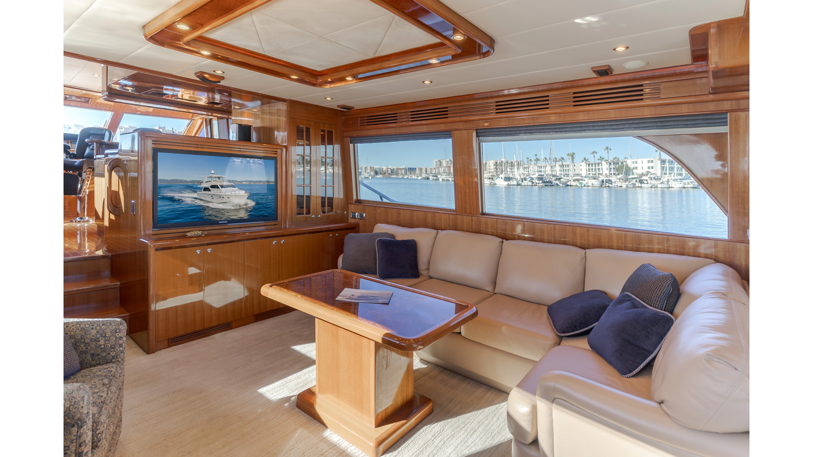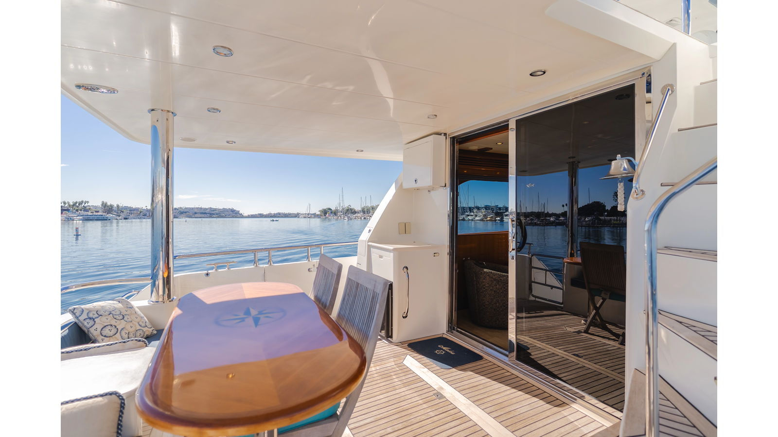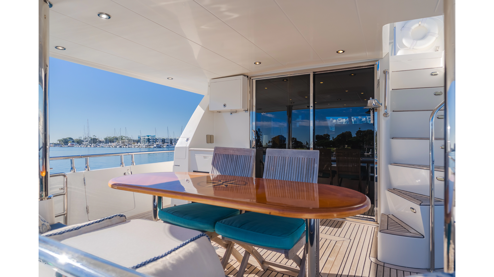 Molded staircase with teak steps to flying bridge with LED blue courtesy lighting