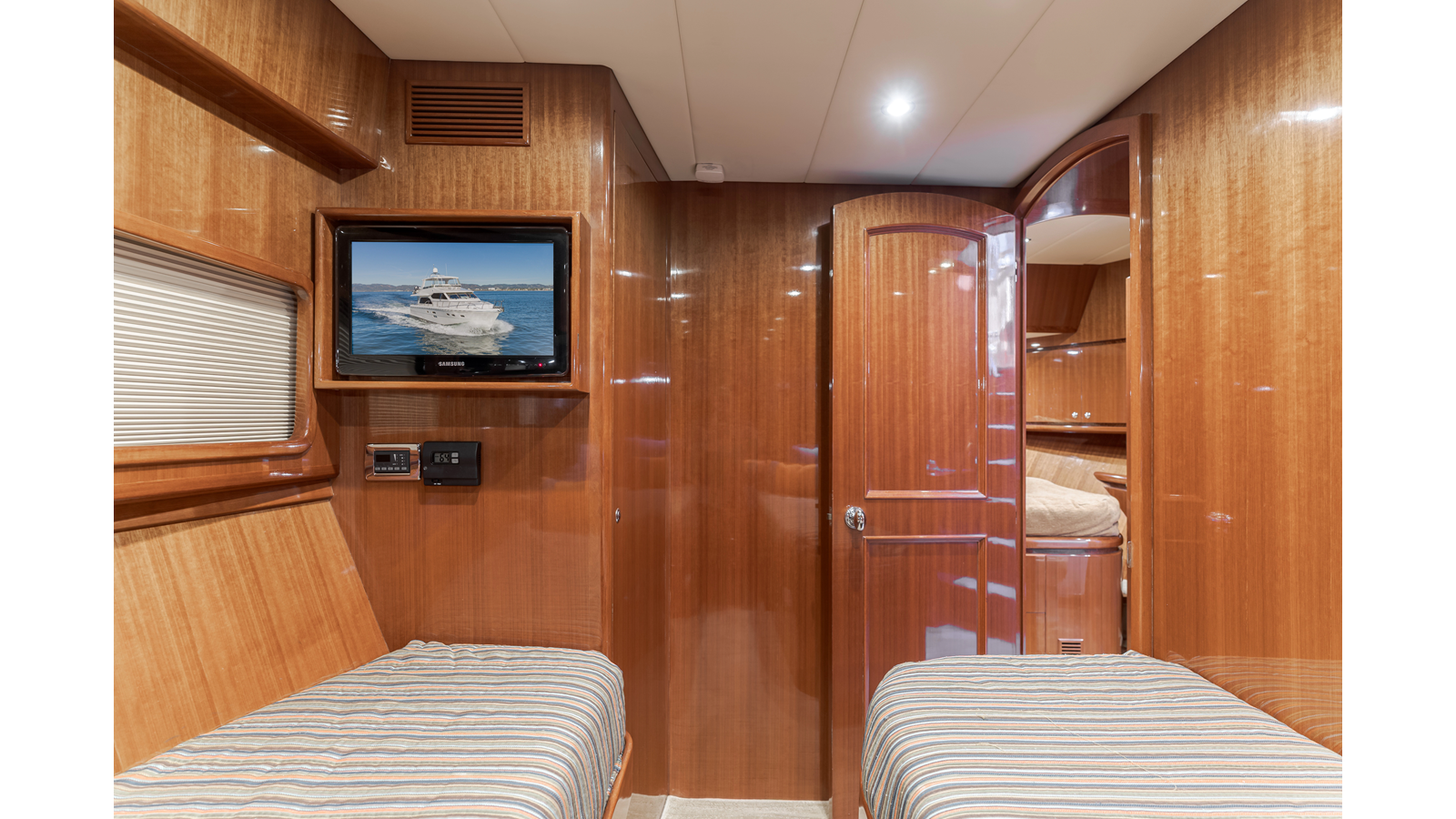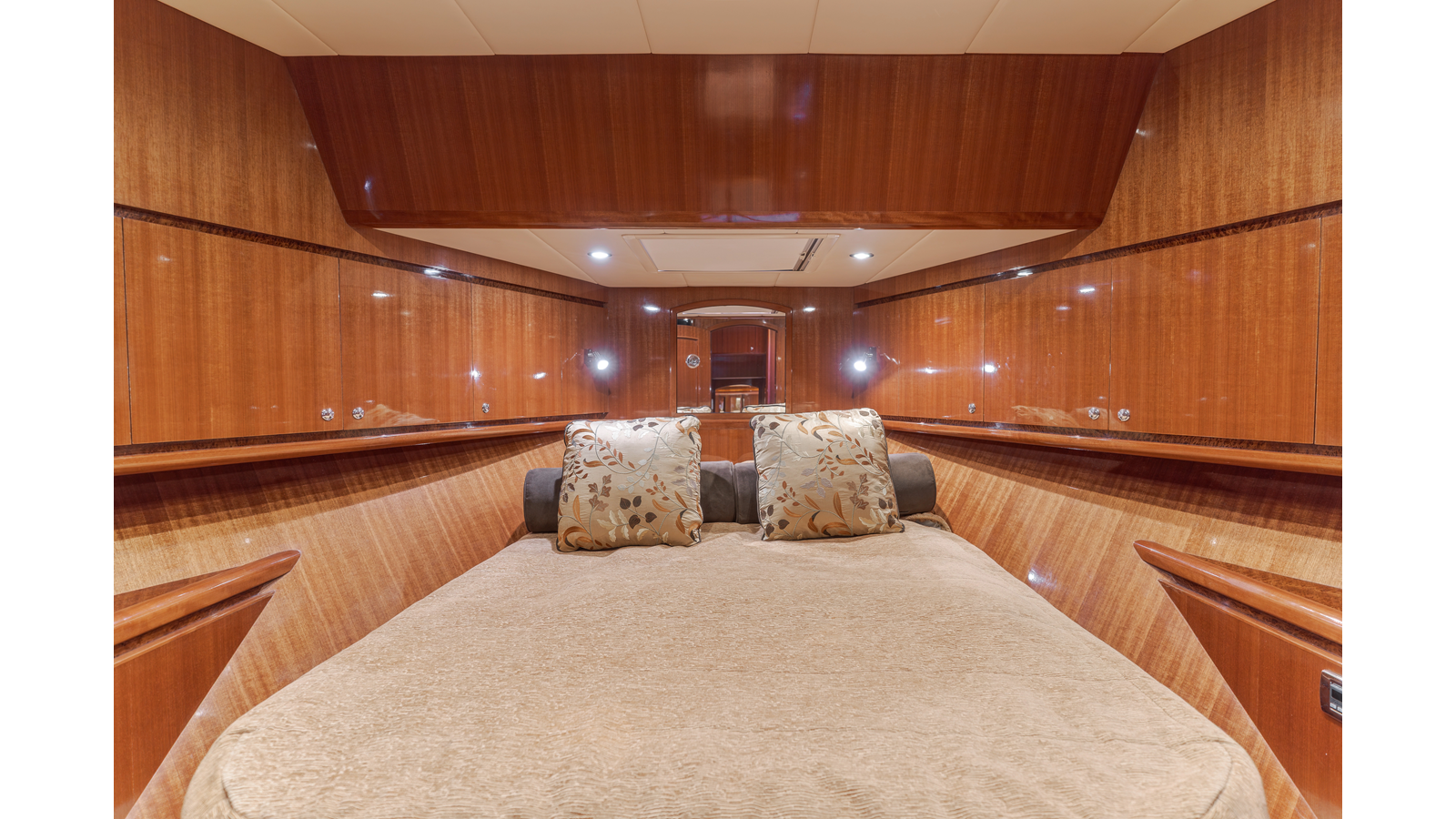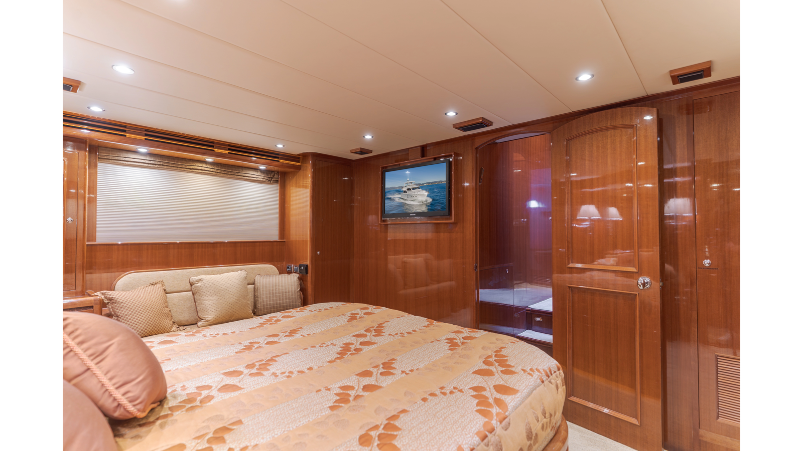 Full beam midship master stateroom with ensuite head and walk-in closet aft of master berth