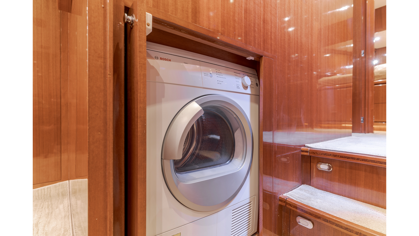 High-gloss finish African Makore cherry wood paneling and cabinetry