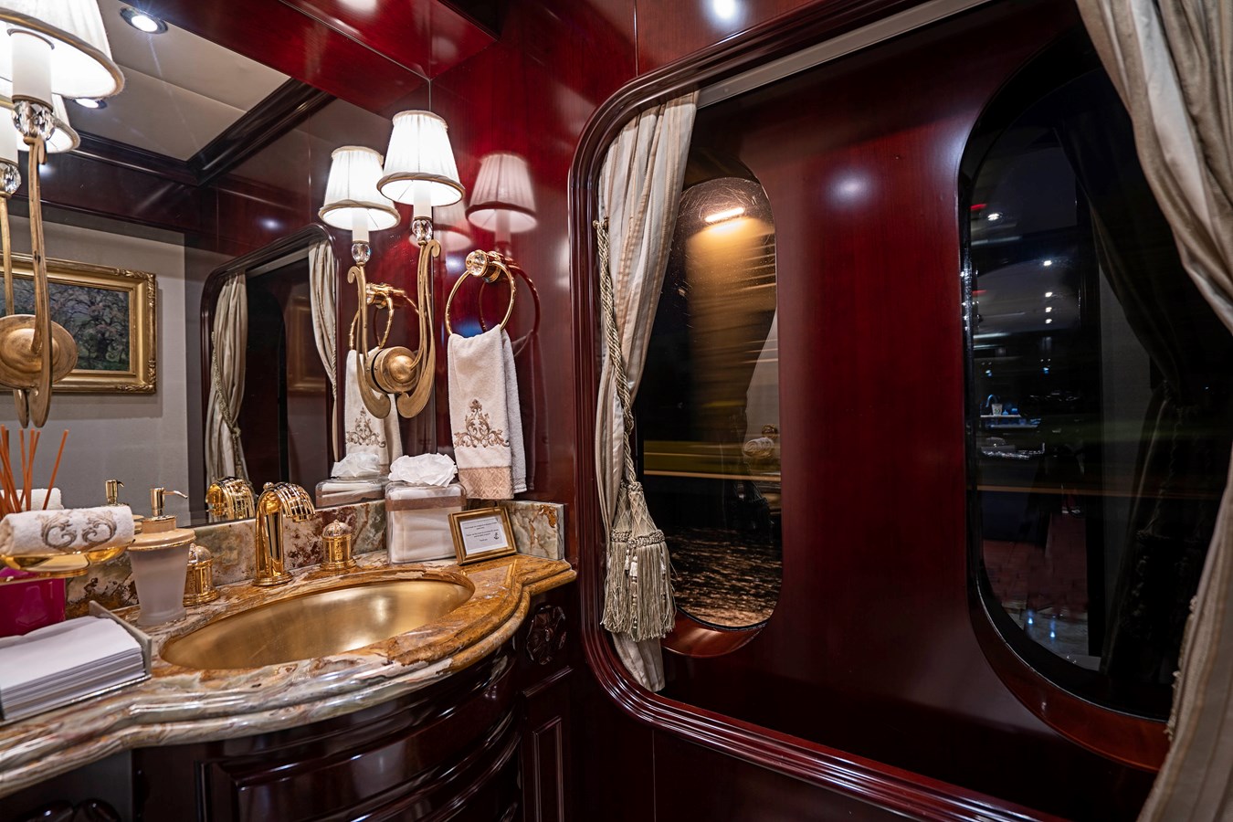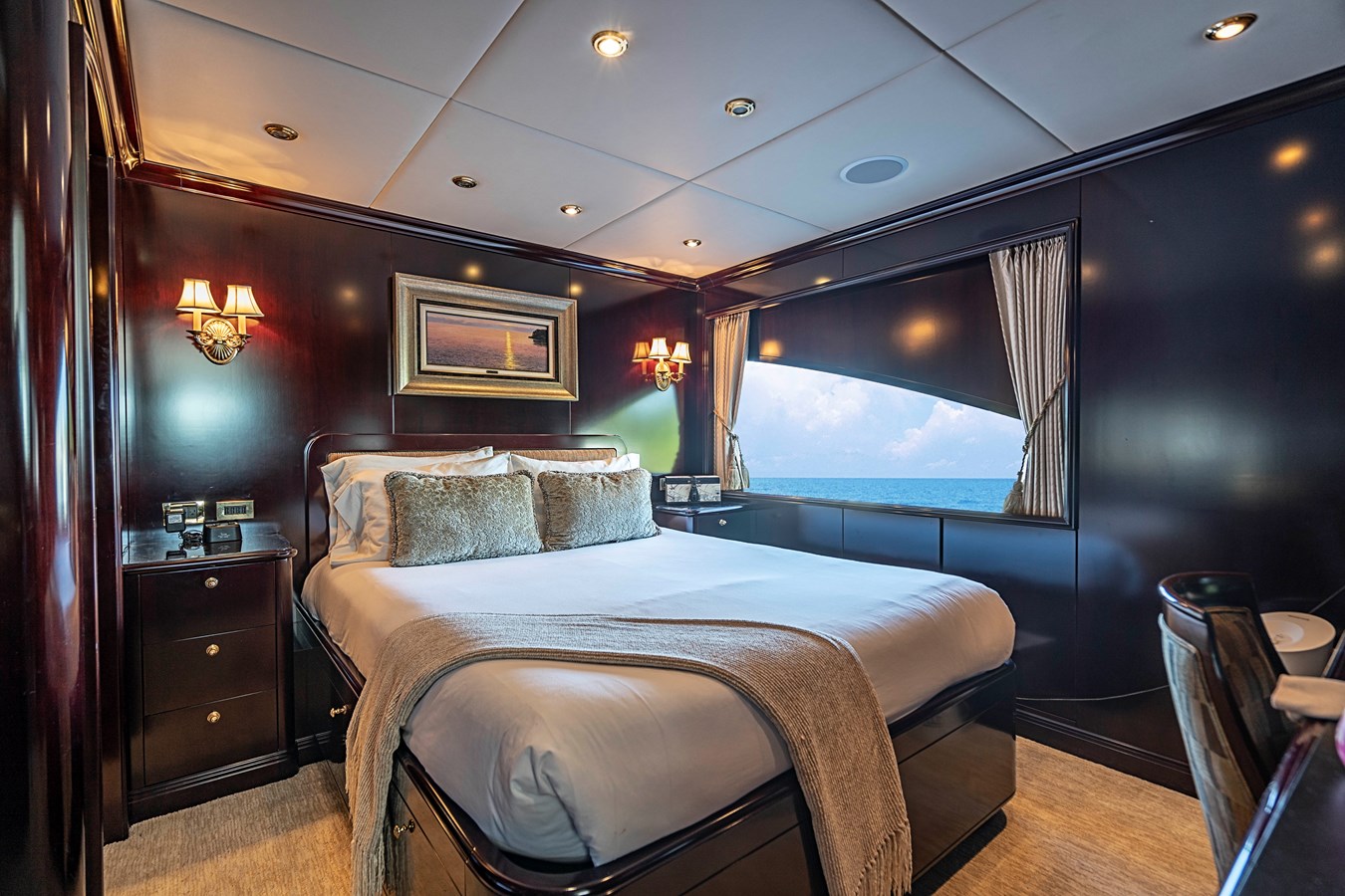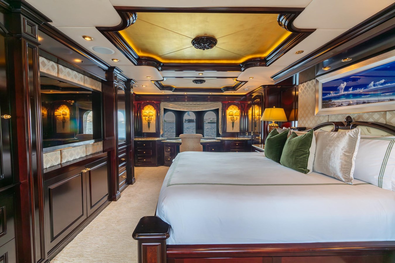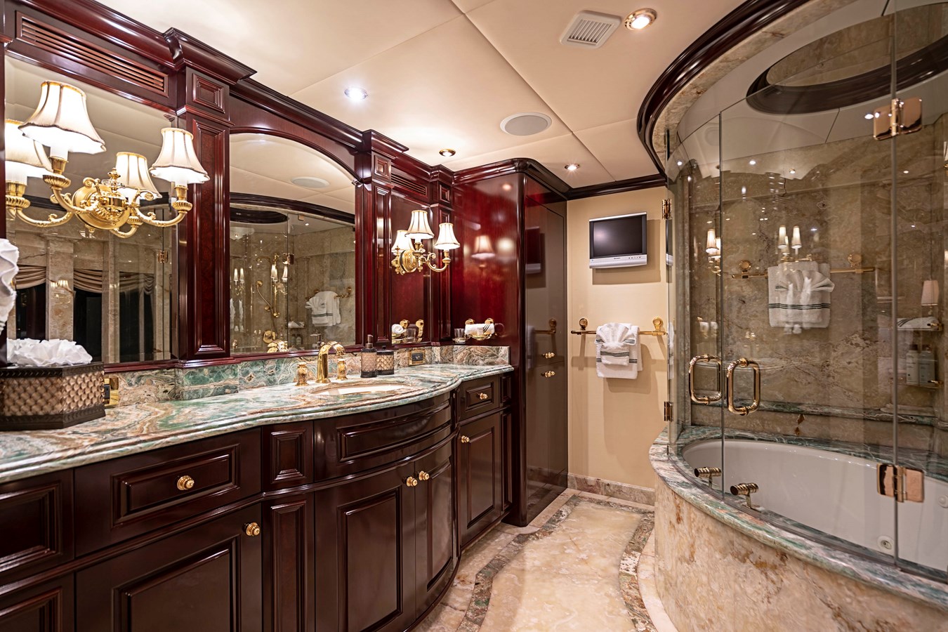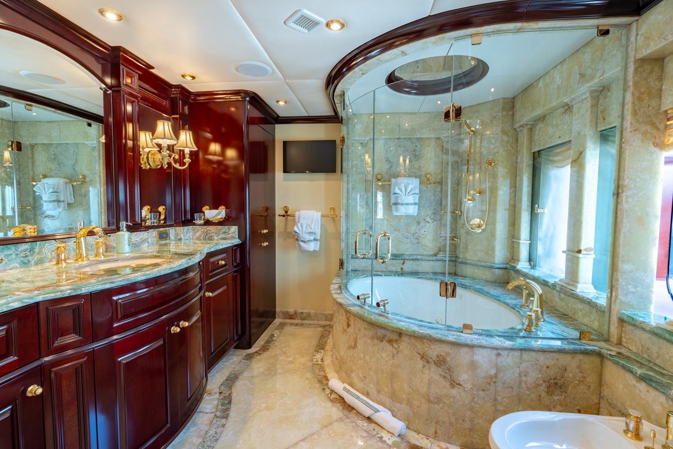 The full beam master stateroom is located forward on the main deck and is accessed through the owner’s private office on the starboard side. The master stateroom has large windows, a dressing table on the port side and sofa starboard. His and hers separate walk-in closets are forward and his and hers separate baths both have inlaid marble floors. Her bath is complete with an oval marble bath and overhead fiber optic star ceiling to enhance relaxation while his has a large marble shower.