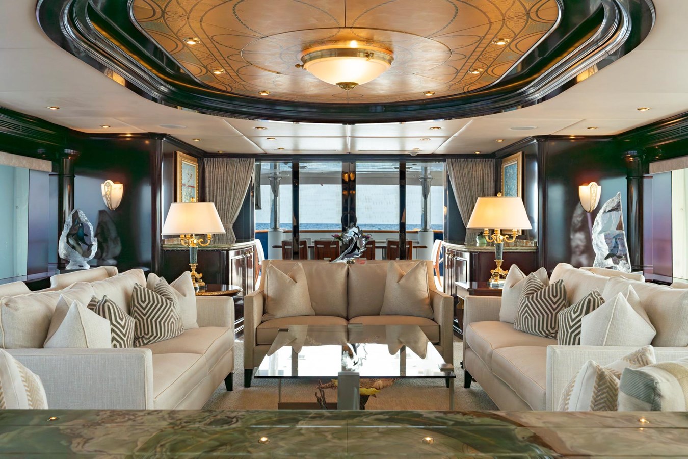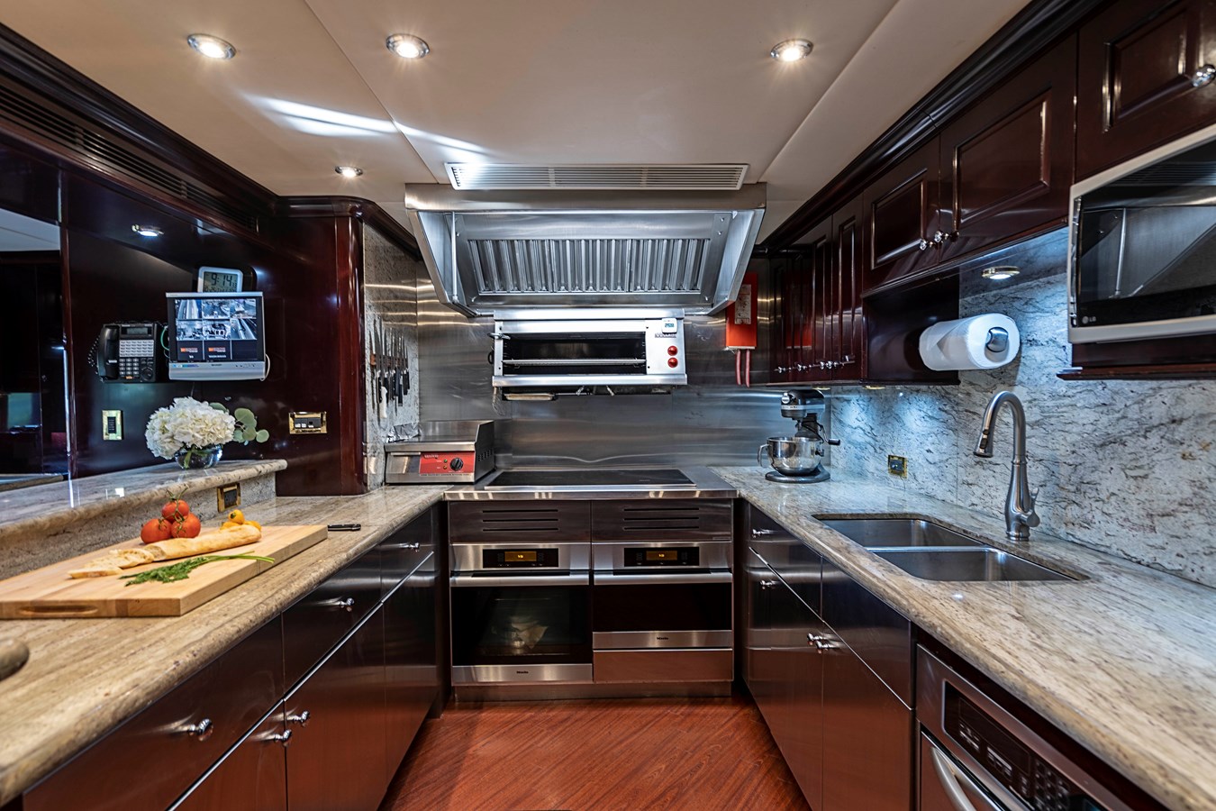 Aft of the main foyer is the open plan main salon / dining area. Large windows allow natural sun light to the spacious salon where entertaining family and friends can be either formal or casual. Forward is the dining salon providing a more formal dining setting while al-fresco dining is offered on either the air-conditioned aft main deck or upper aft deck. The galley is amidship port side on the main deck.