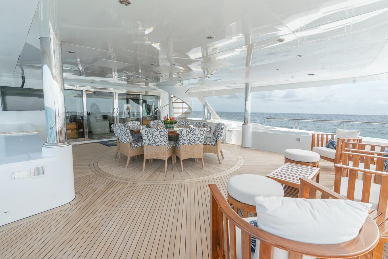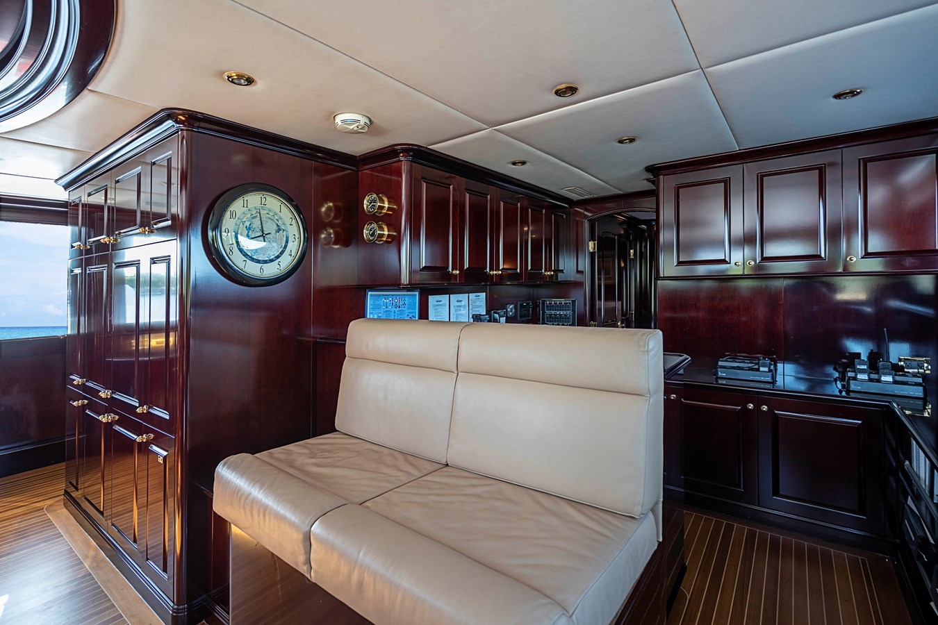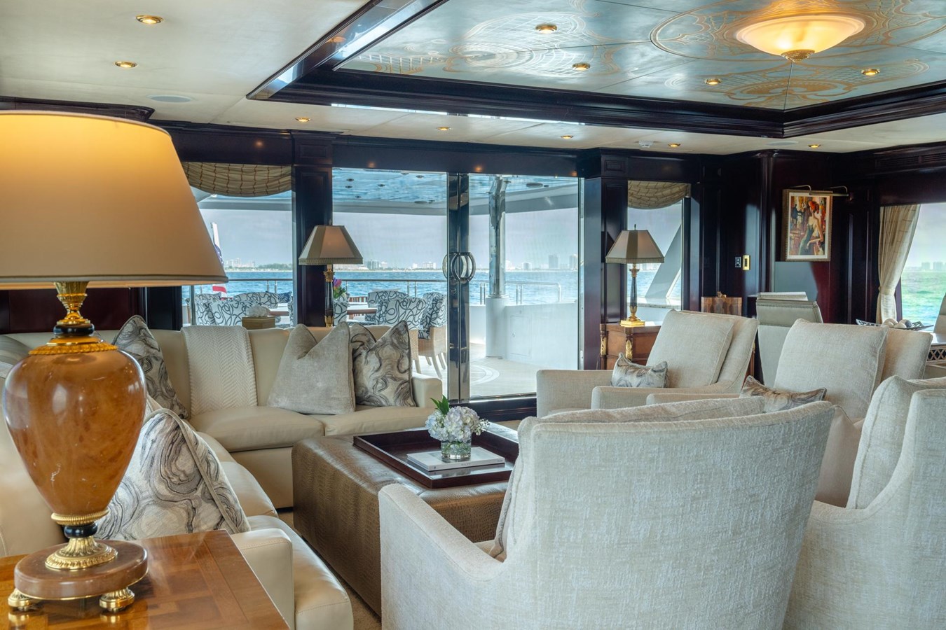 The vessel has been upgraded and maintained to the highest of standards and is in ready-to-go condition. She has many comfortable areas for entertaining both indoor and outdoor. The flybridge features a 6-person Jacuzzi tub, gas BBQ grill, lounge and dining areas and a full bathroom. The upper deck skylounge and upper aft deck areas feature a large circular teak table for dining outdoors and a full service walk behind bar indoors. There is an entertainment center with HDTV and surround sound stereo. The main deck features a comfortable main salon area ideal for relaxing and entertaining guests. Forward in the main salon is a formal dining area with a custom dining table and seating for ten. The vessel had a new superstructure paint job in 2023.