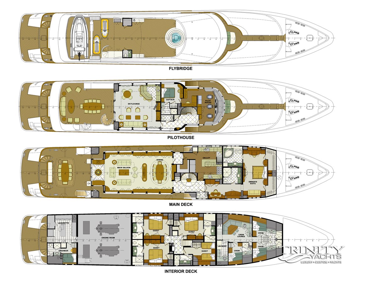 Crew quarters are located below deck forward of the guest staterooms and include three crew cabins each with their own bathroom and shower, a large crew lounge. The double berth engineer’s cabin is aft of the engine room and includes a bathroom with shower. The Captain’s cabin is aft of the pilothouse and includes a queen size berth, bathroom with shower.