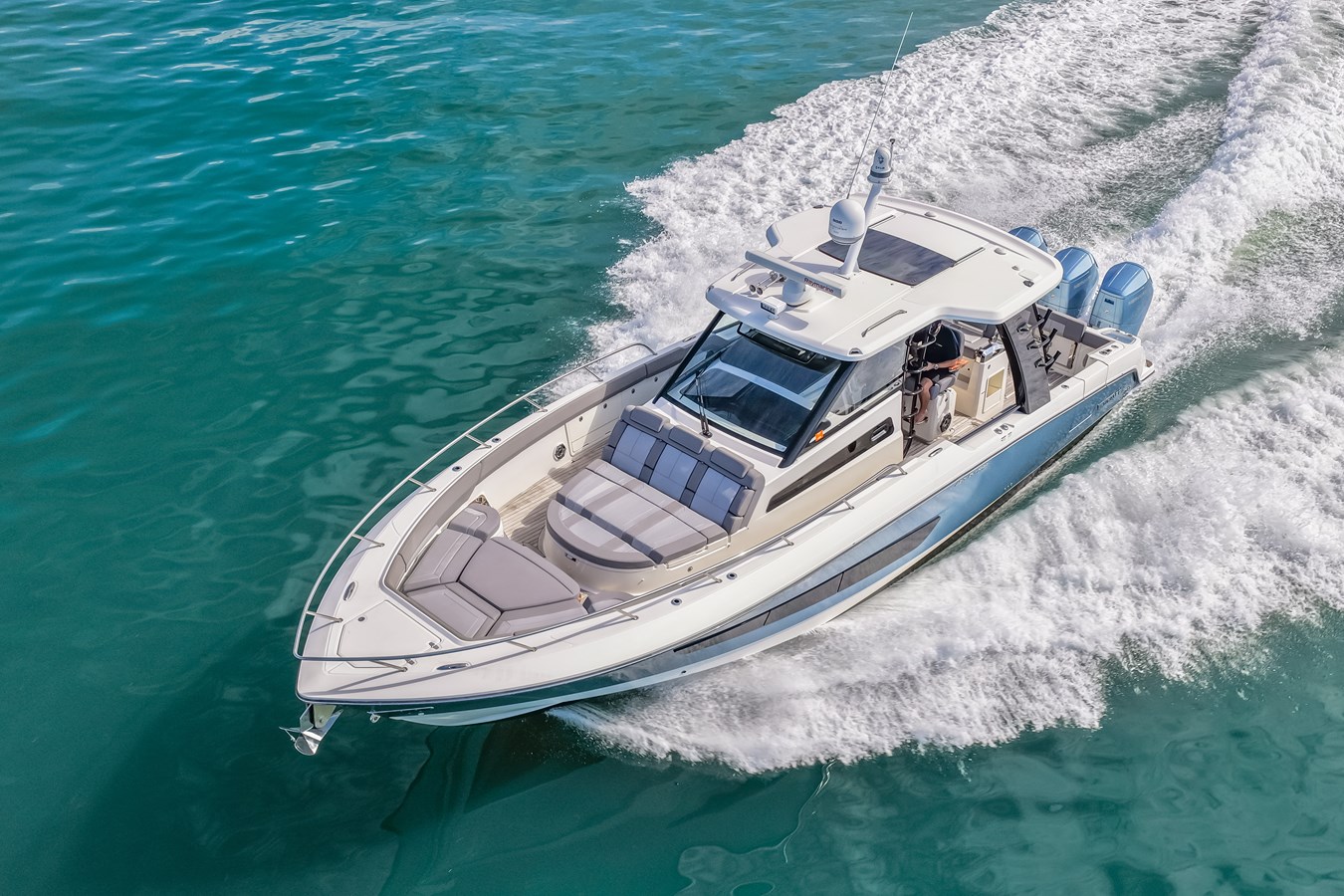• Sunshade for cockpit – telescoping polished stainless-steel frame retracts and deploys electrically (Black/Tan Sunbrella® canvas depending on canvas color selection)