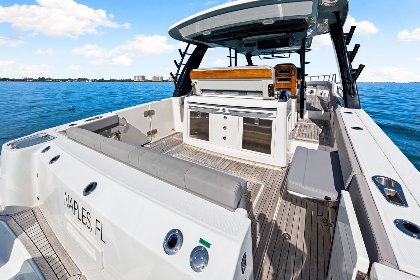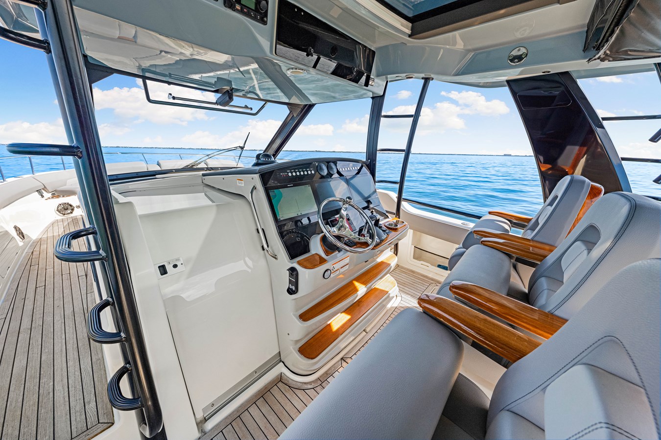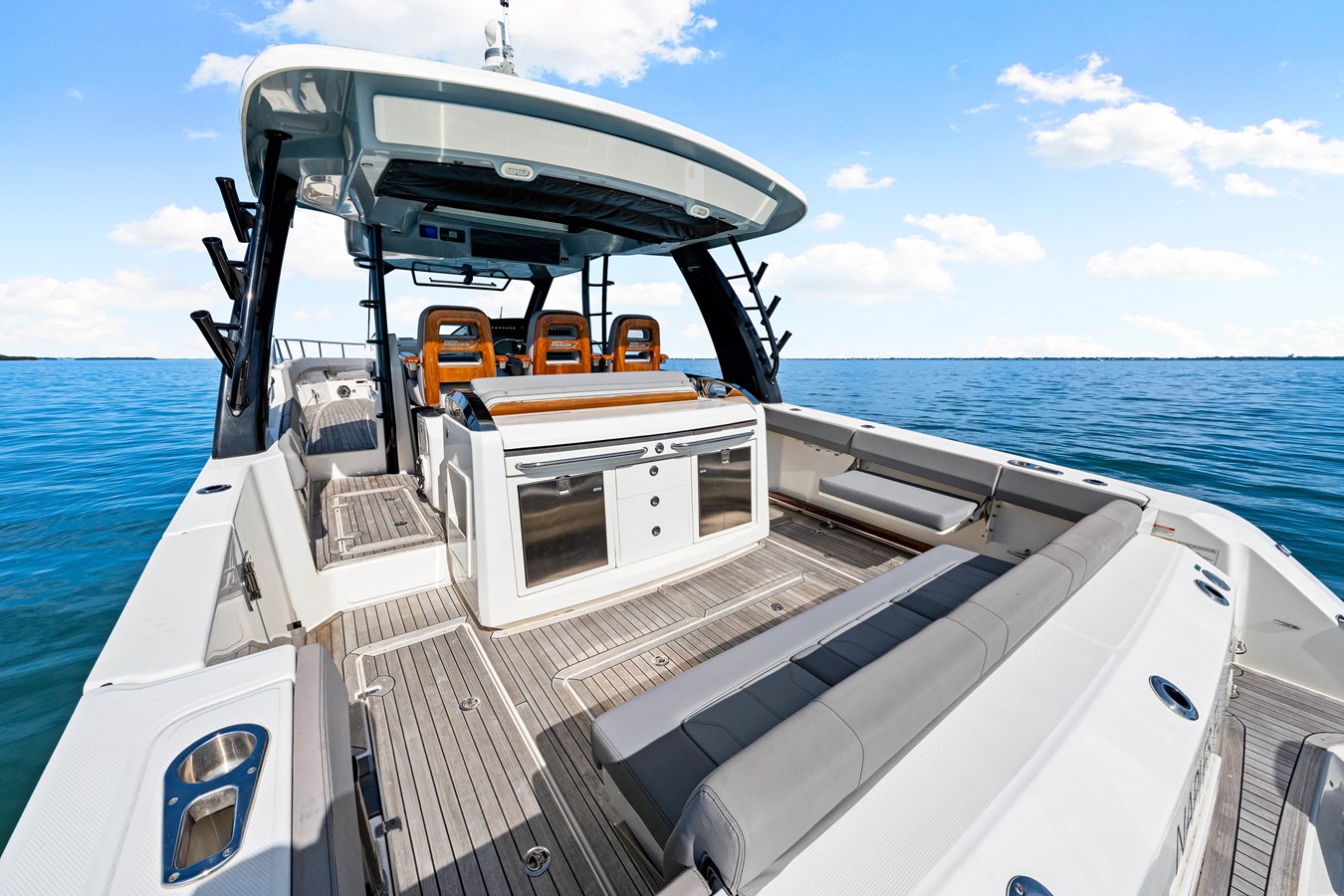 • Helm and companion bolster style seats (3) with fold-down armrests (center seat is electrically actuated) (port and starboard seats rotate to face aft)