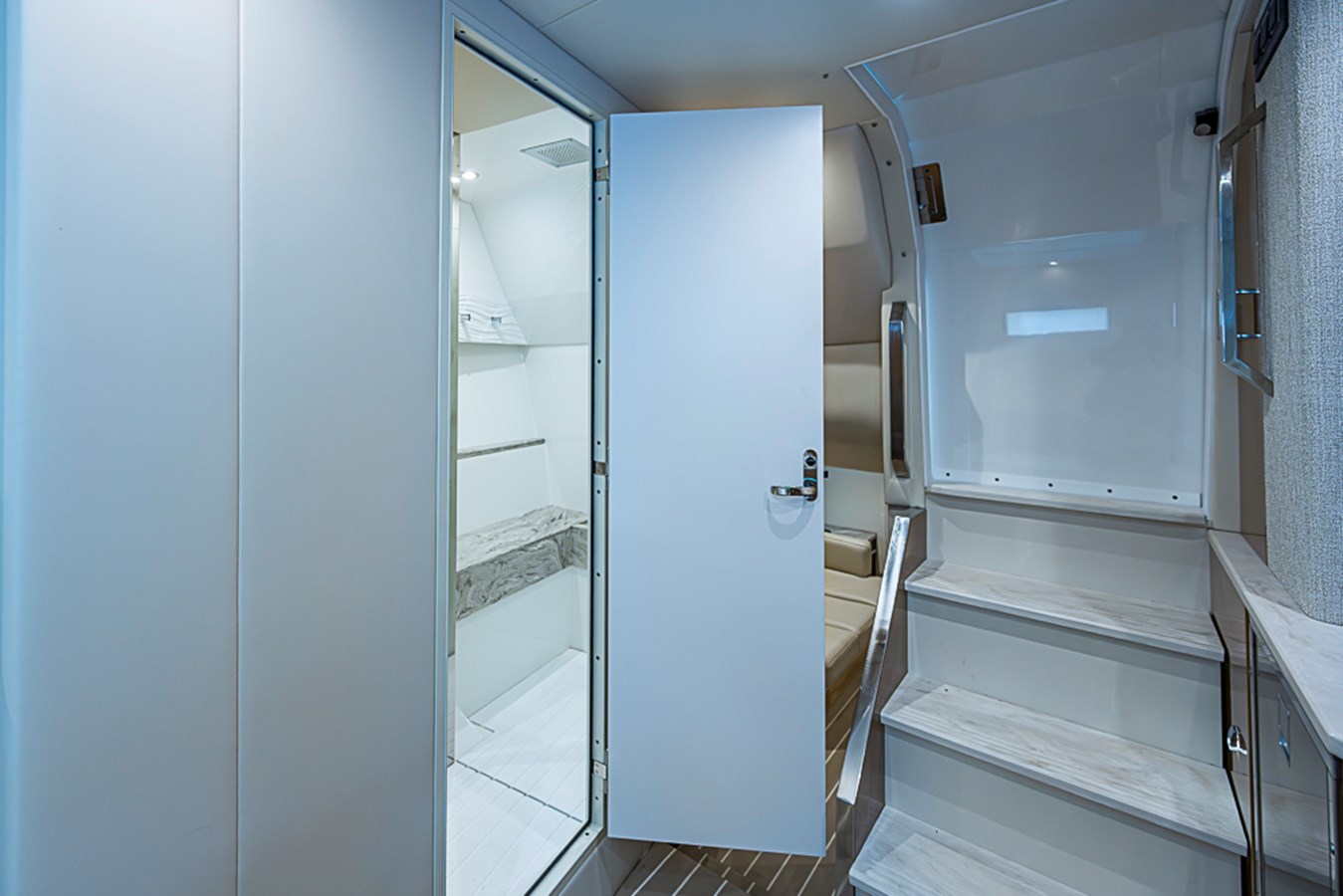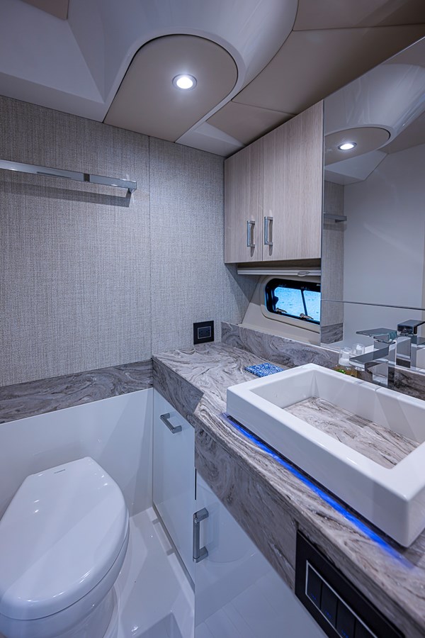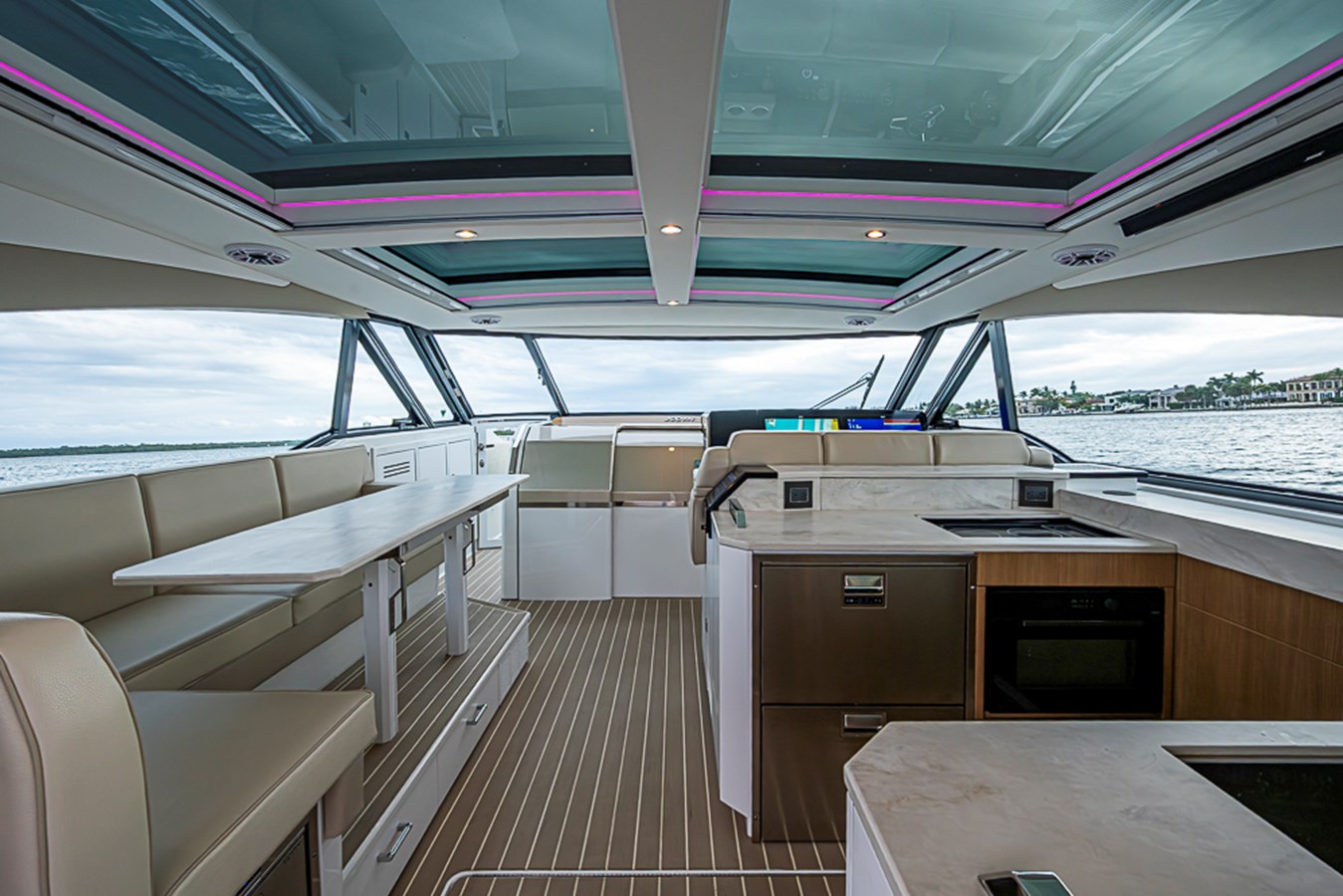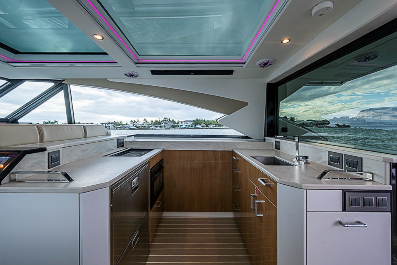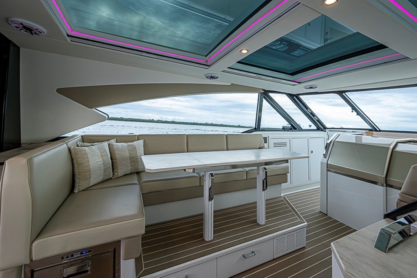 The 500 SSC amenities below offer a respite from the outside world with a true cabin experience. A complete galley at the cabin entry stairs, the large convertible U-lounge forward, a head with Corian surfacing, vanity sink and spacious shower create a residential feel. Slip aft to the separate stateroom with queen-size berth, sofa and complete entertainment suite.