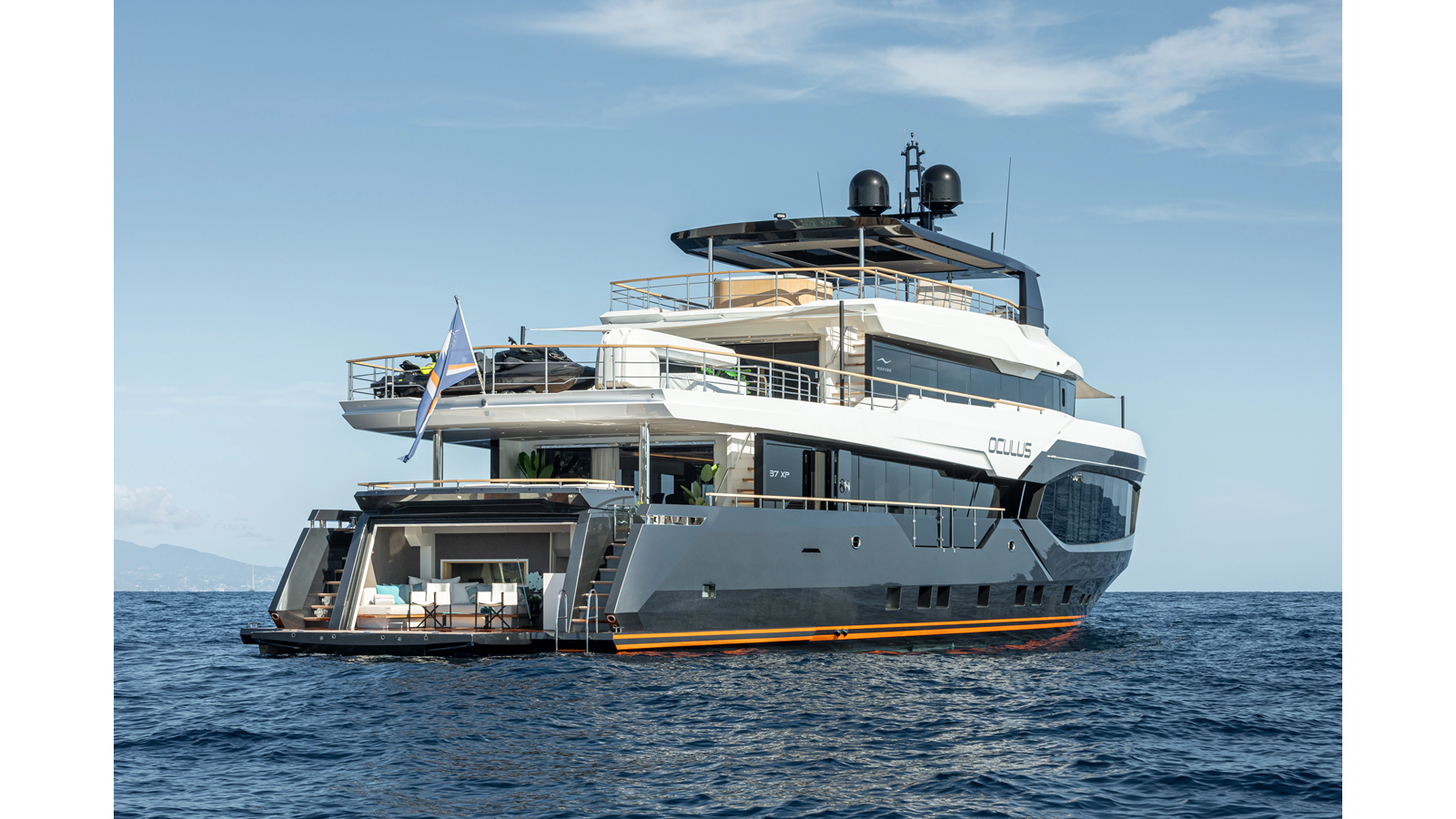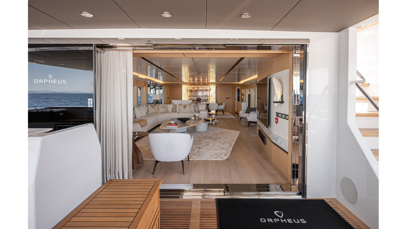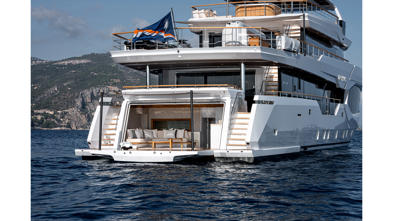 The beach club area is behind the transom door, main access is when the transom door is opened forming a beach area for bathing and the club area for relaxing inside the structure. There is an emergency escape to main deck also and access via the engine room.