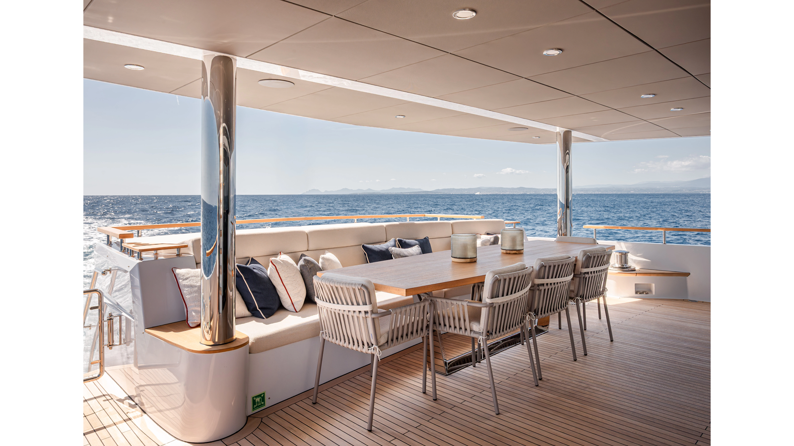 A 3m extending electric Bimini provides shade for the breakfast area on the owner’s deck when required.