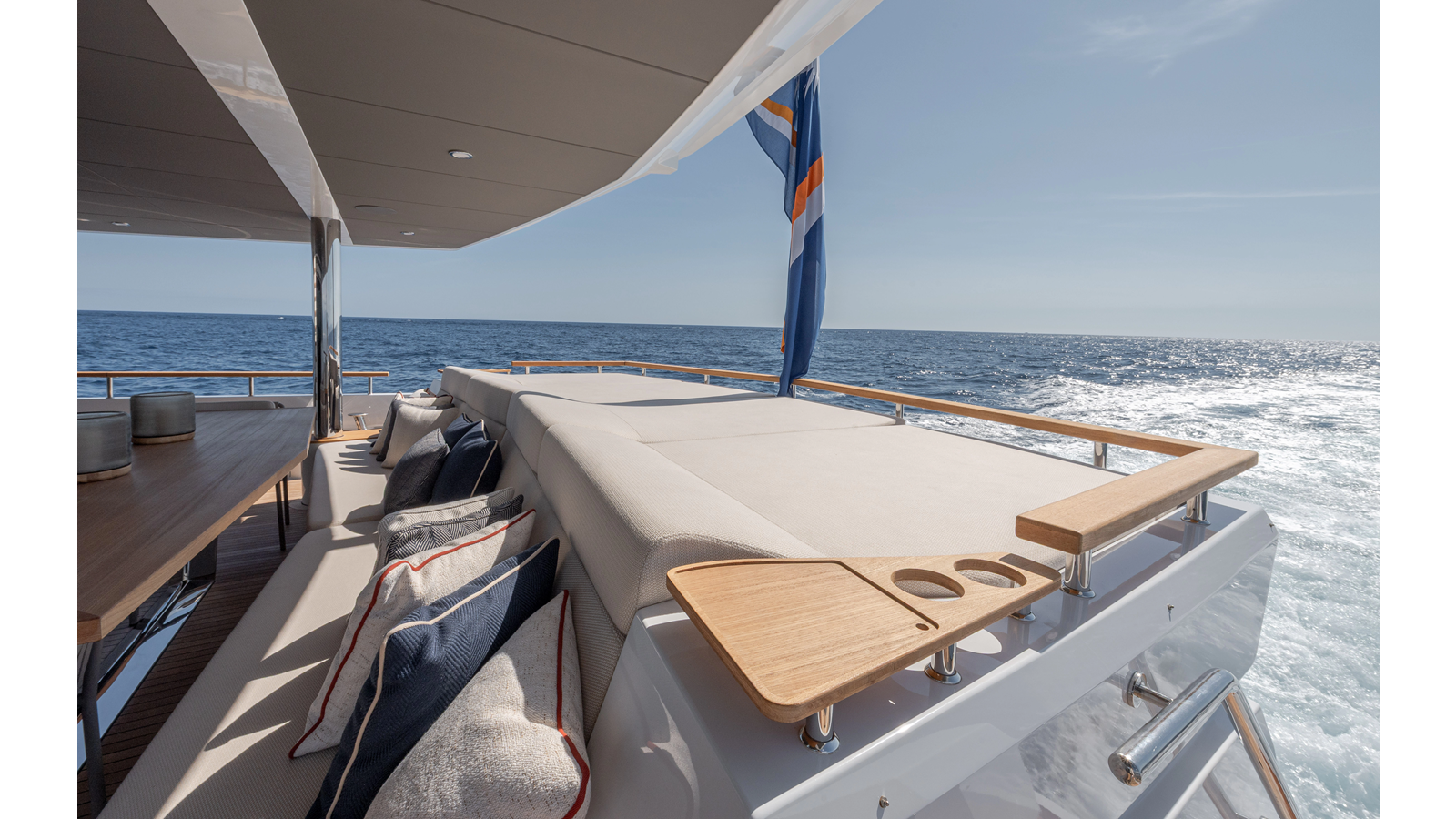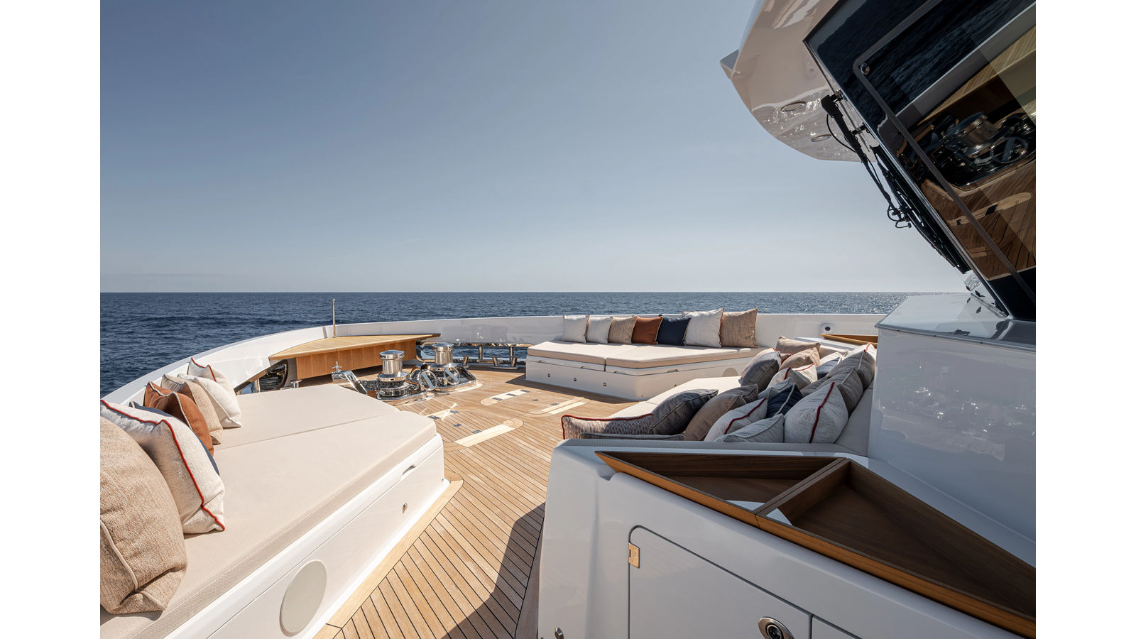 Apart from the deck gear detailed in its section the foredeck is another lounging space, forward facing seating with folding table looks across the twin sun beds and out to sea. There is also a seating area in the bow to enjoy an uncluttered view of the sea or to look back over the forward area.
