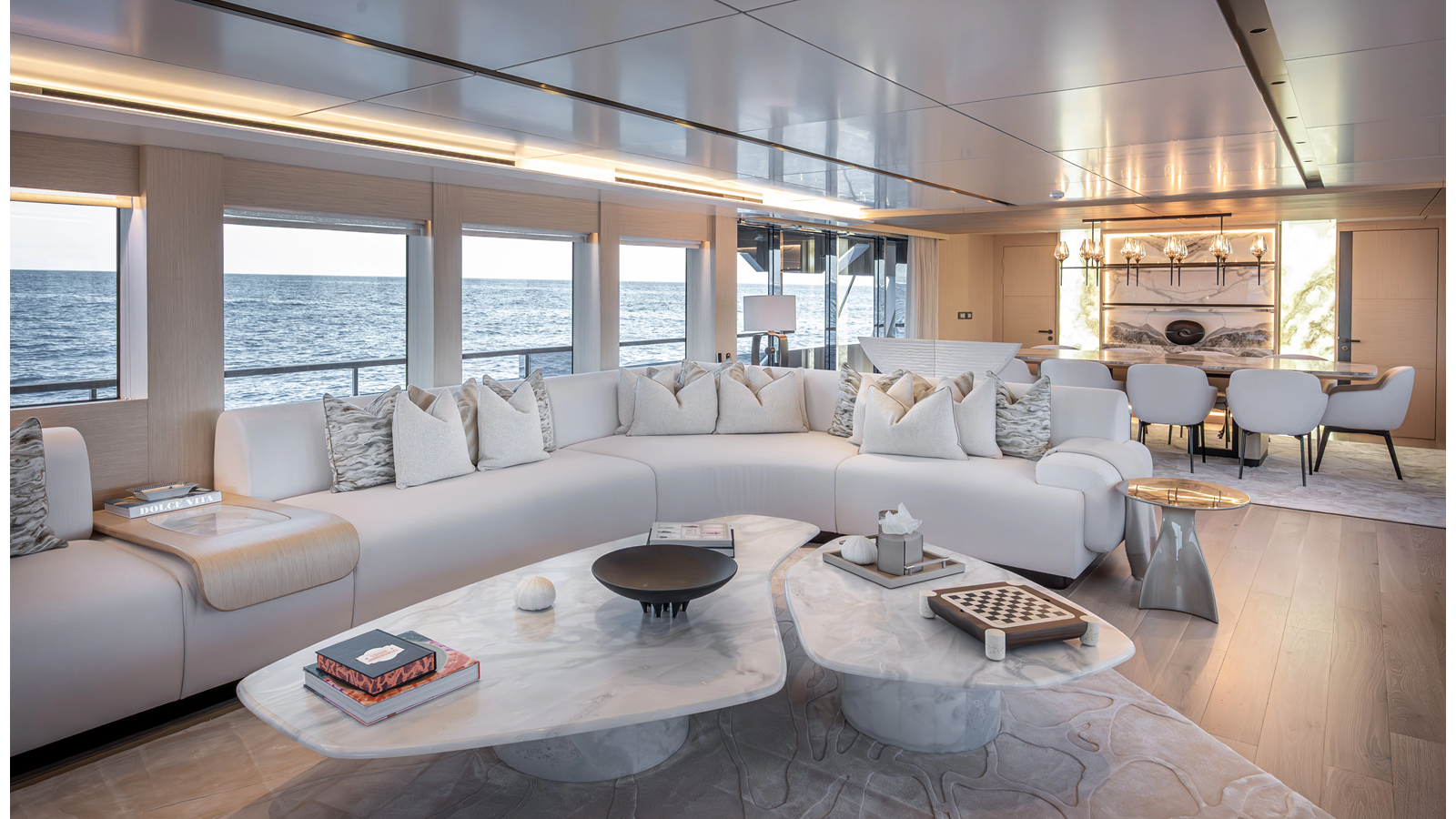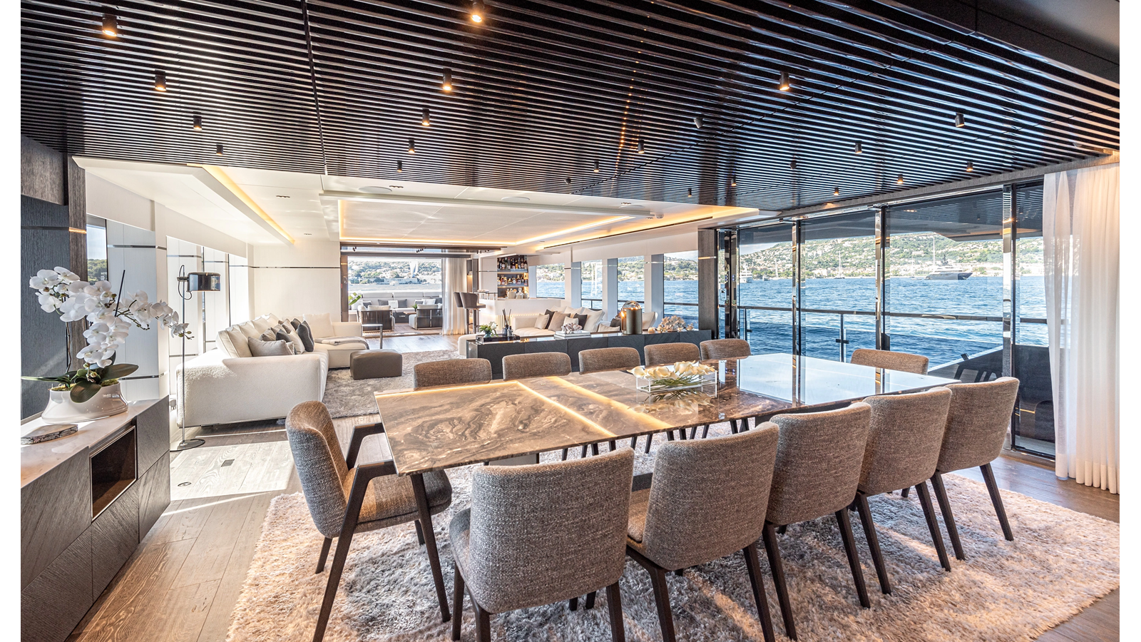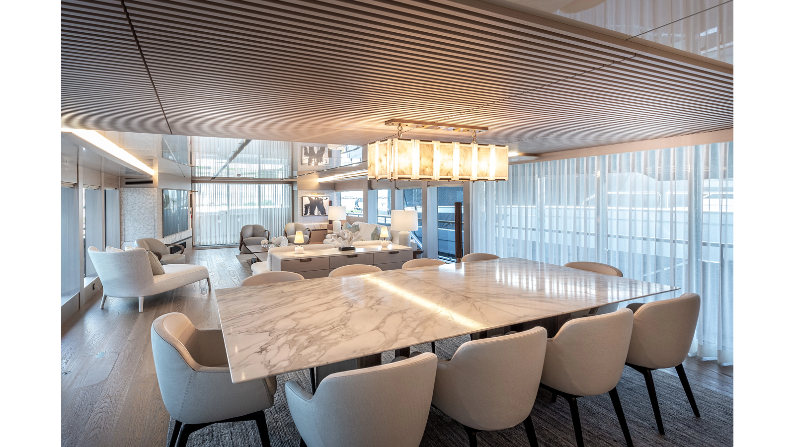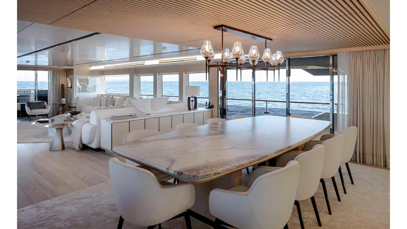 Further in is the dining area with its large limed oak wooden dining table with chairs set athwart ship and centrally located providing relaxed seating for 8 persons to dine. Overhead is a feature wood design with hanging 230v AC lighting. The forward bulkhead has illuminated marble panels and central shelving unit, additional storage units are located to port and starboard side aligned with the table.