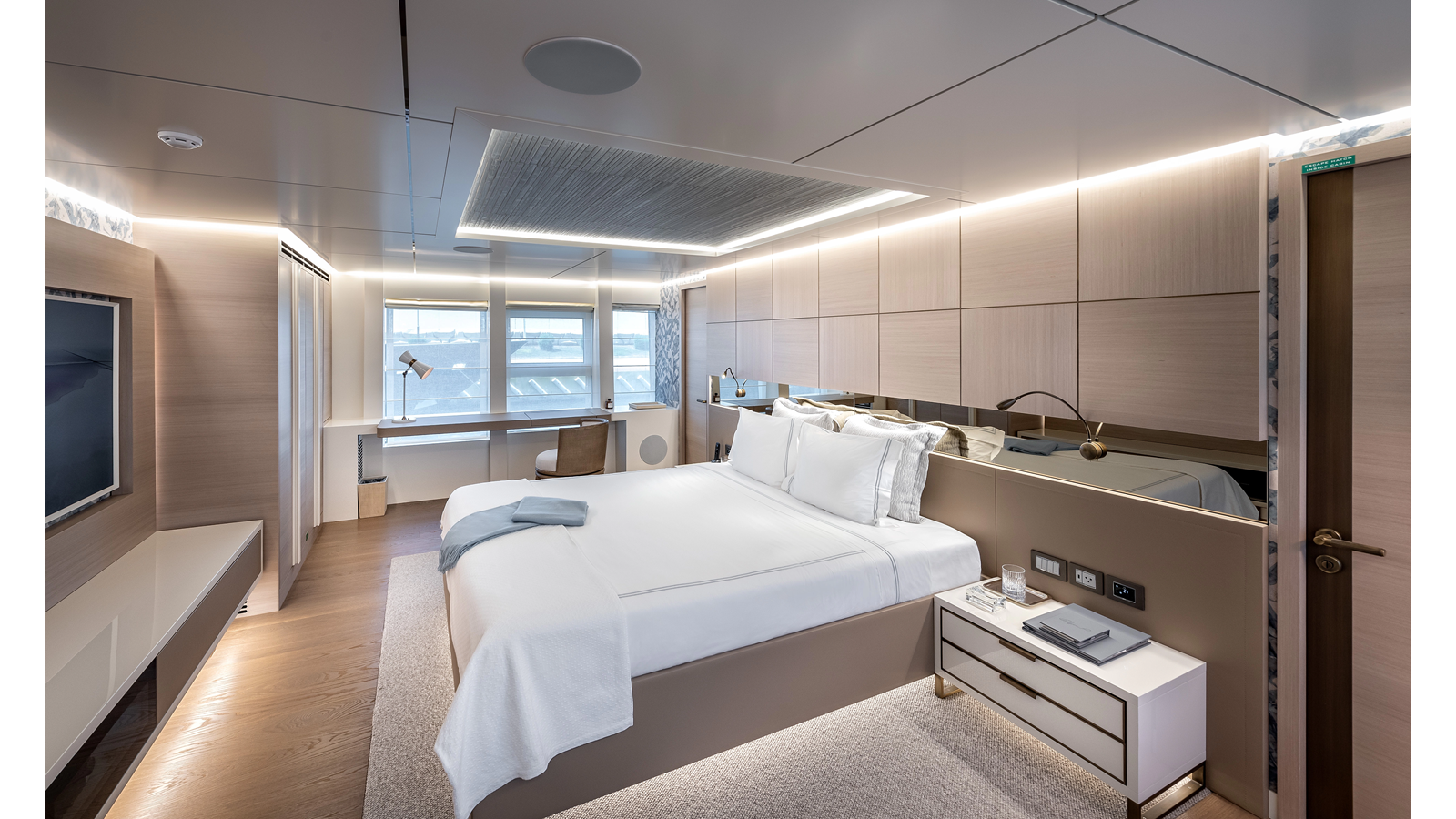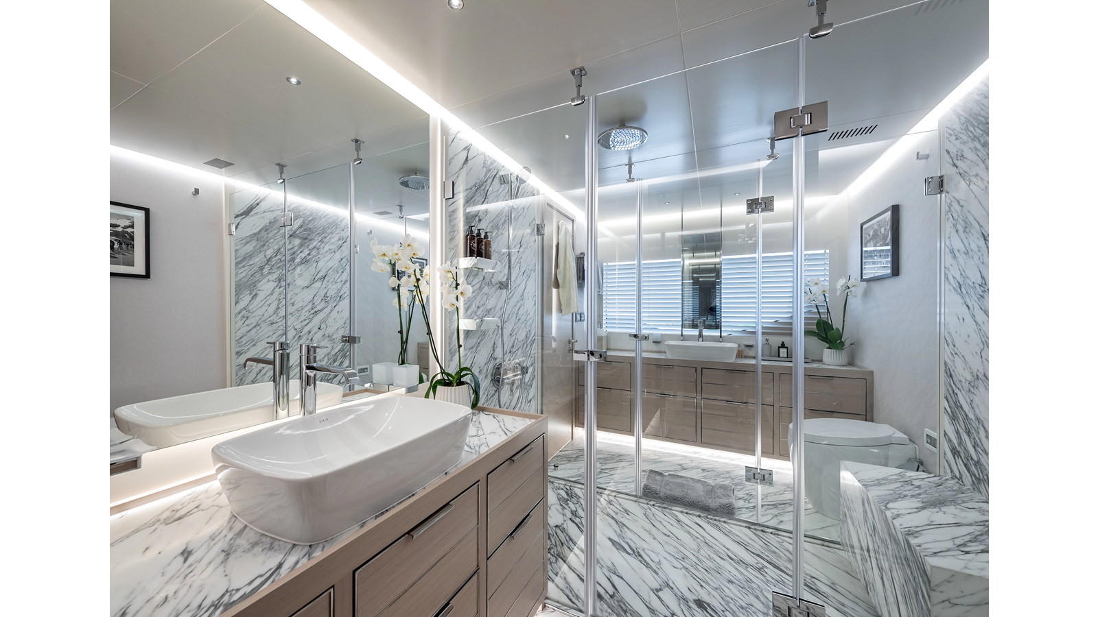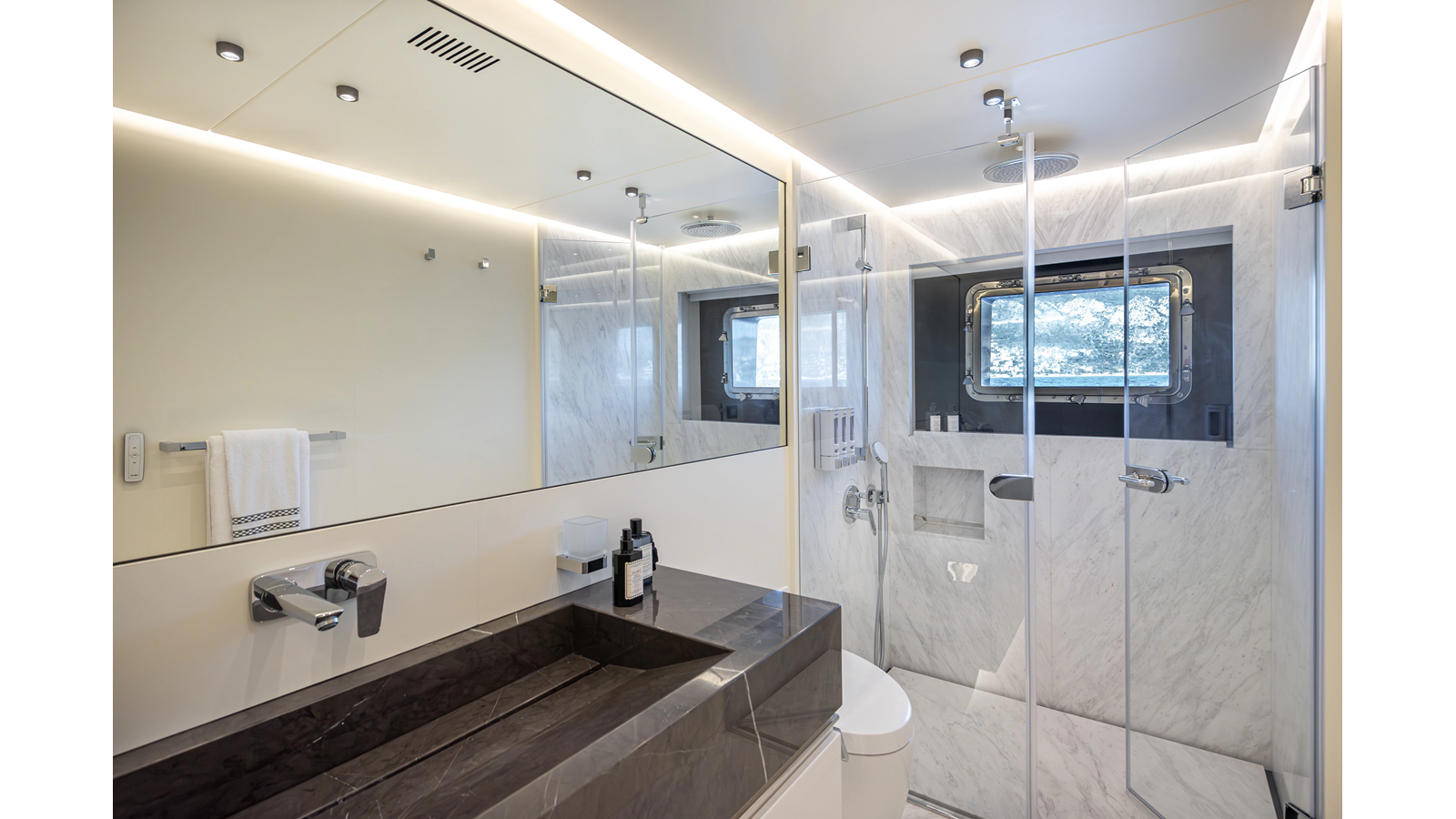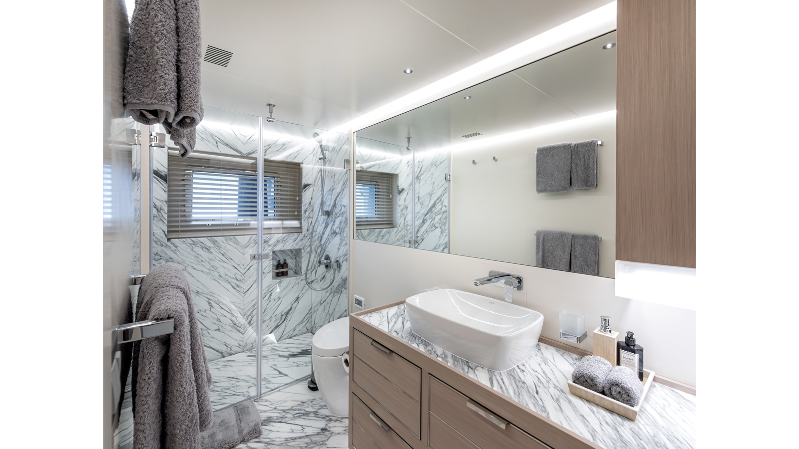 To the port side there is a desk and make-up area with chair facing the full length windows, aft of this is an ample wardrobe space against the aft bulkhead. A 55” TV is fitted above a low level unit with safety box and mini bar located centrally on the aft bulkhead viewable for the comfort of the bed. Sound is provided by a Marantz sound system with Bowers & Wilkins speakers giving a room filling experience. Apple TV and satellite equipment is also connected.