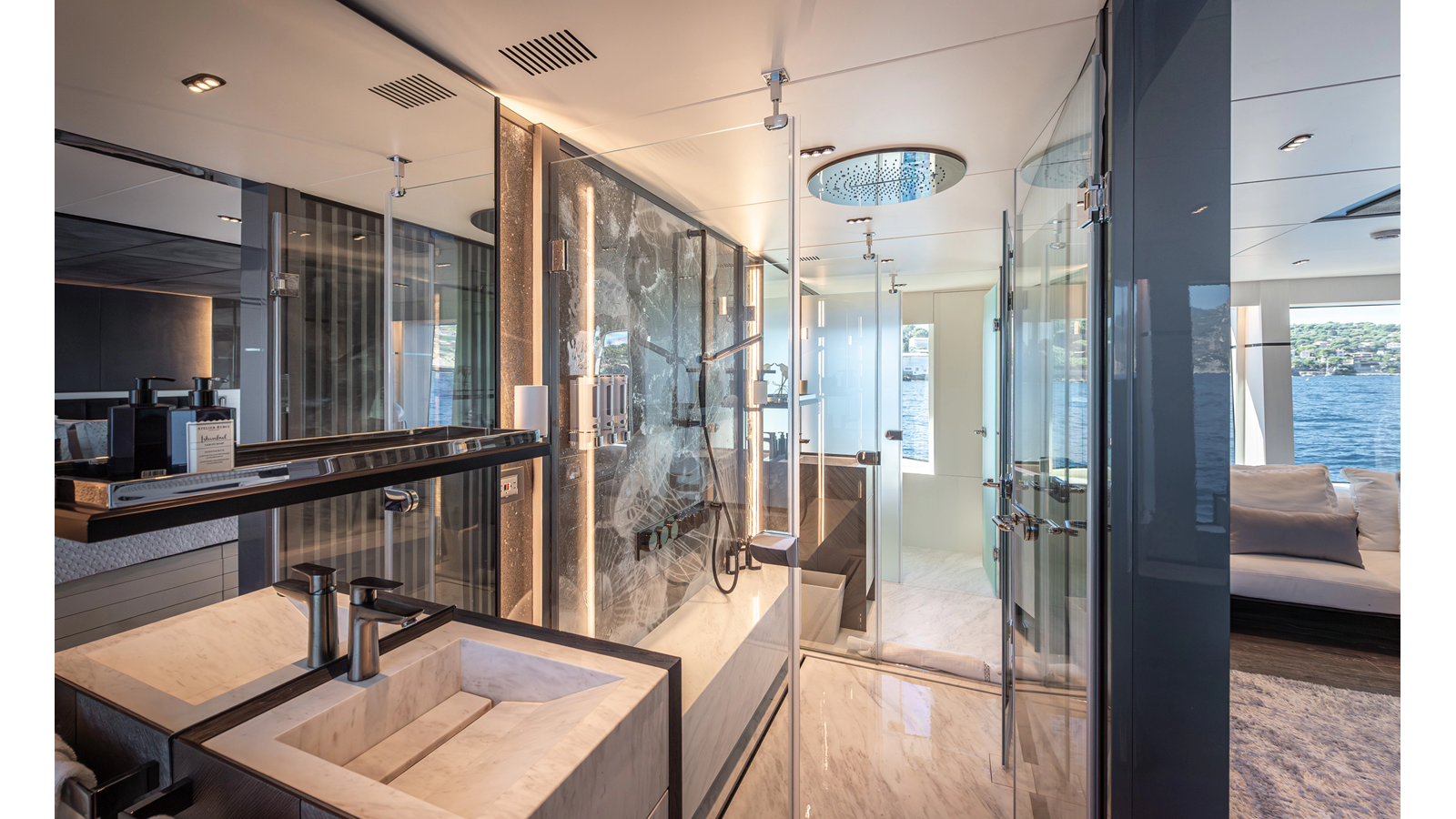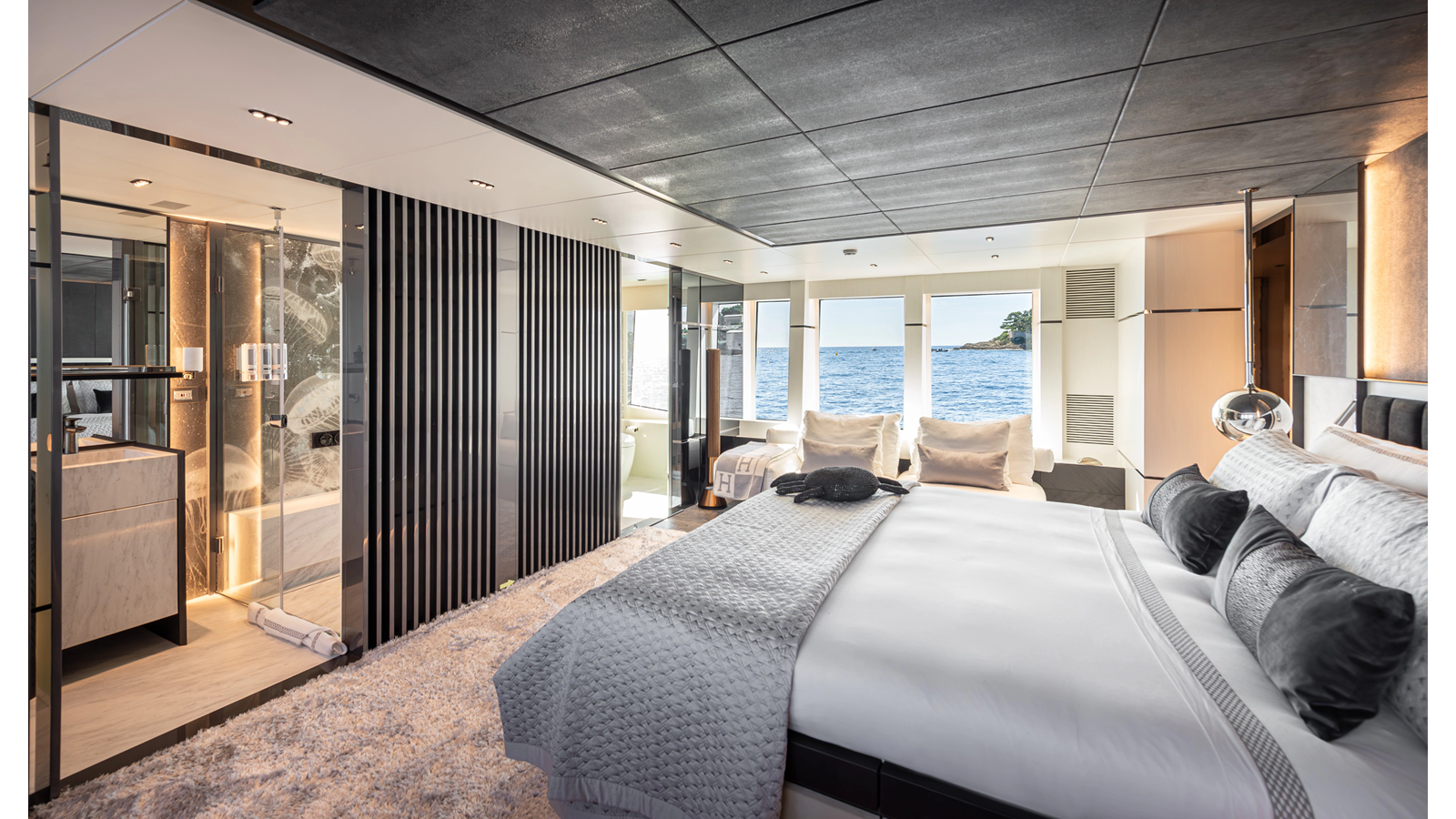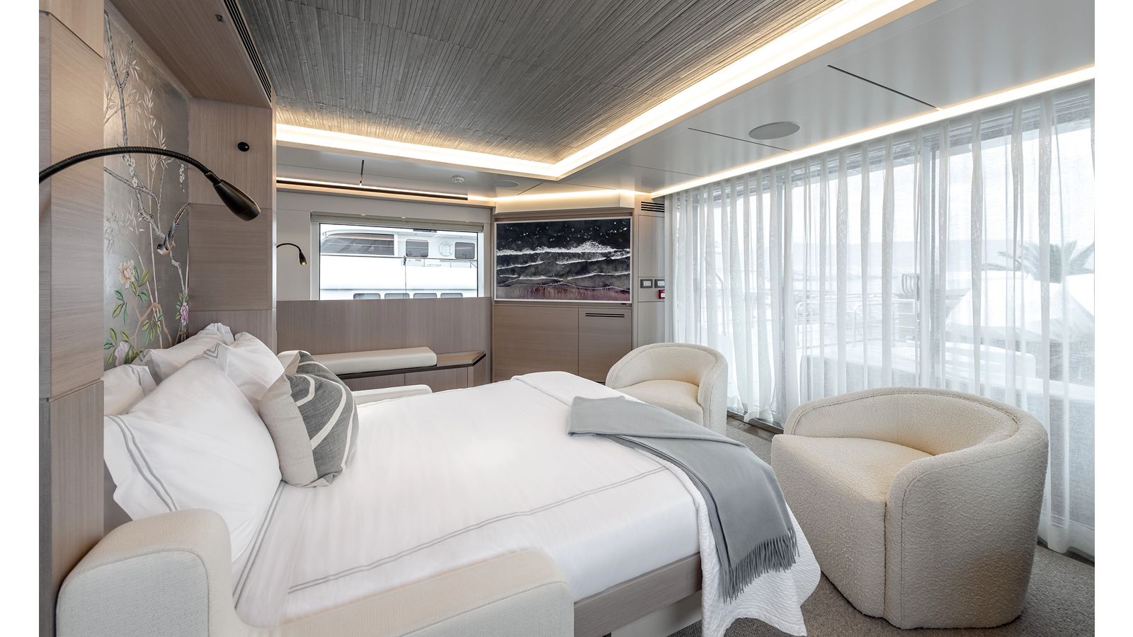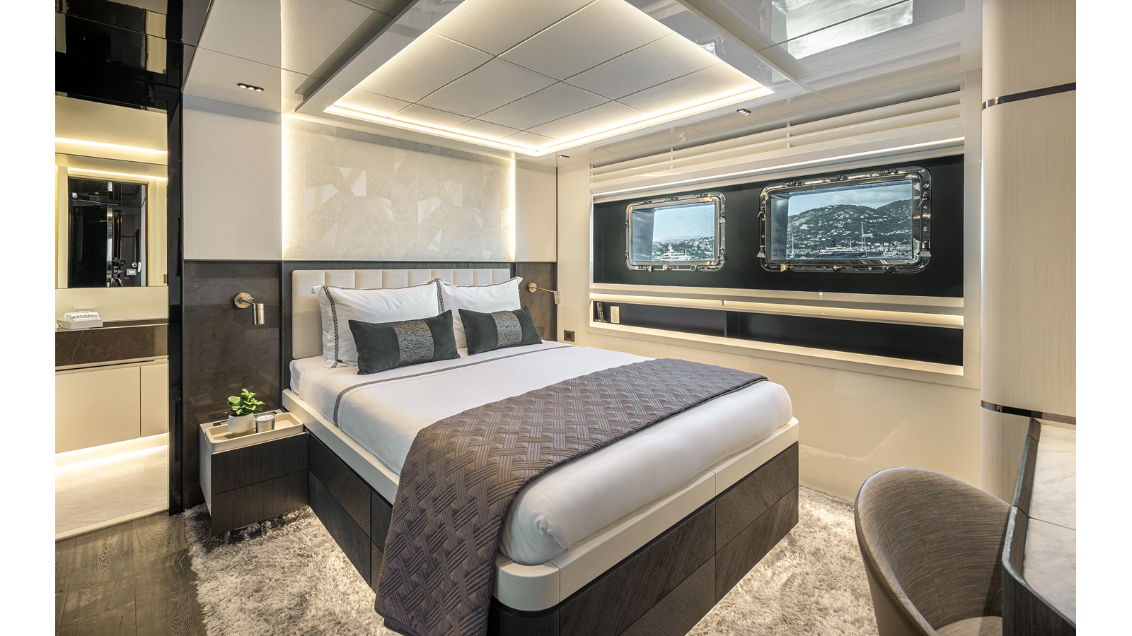 To the port side there is a desk and make-up area with chair facing the full length windows, aft of this is an ample wardrobe space against the aft bulkhead. A 55” TV is fitted above a low level unit with safety box and mini bar located centrally on the aft bulkhead viewable for the comfort of the bed. Sound is provided by a Marantz sound system with Bowers & Wilkins speakers giving a room filling experience. Apple TV and satellite equipment is also connected.