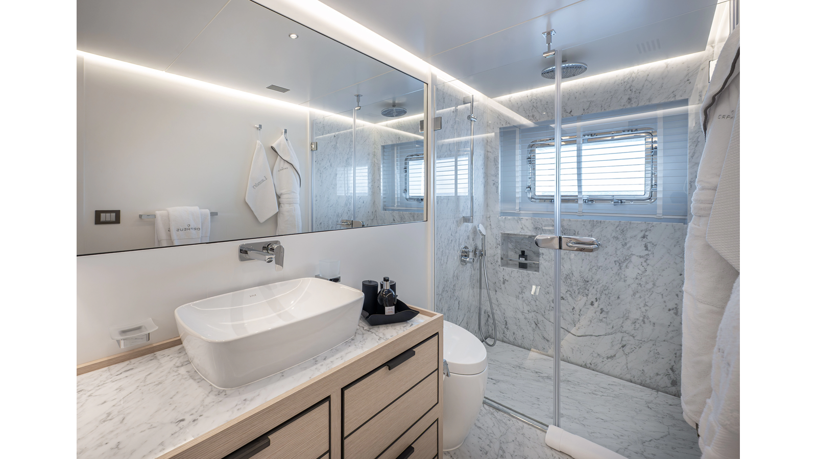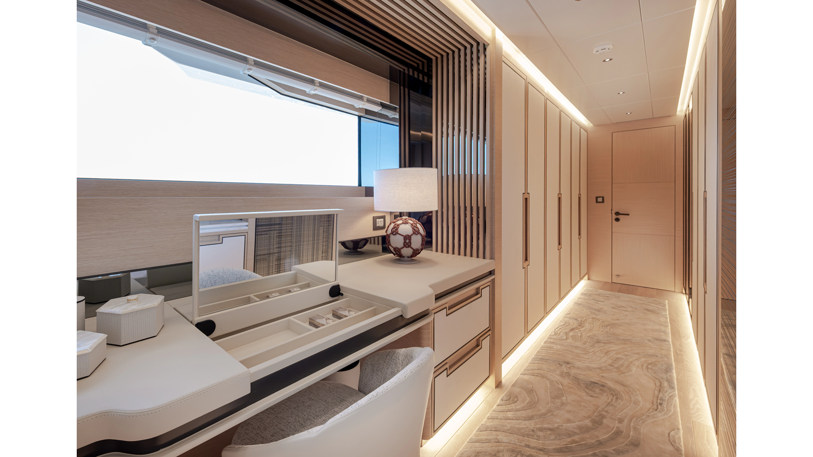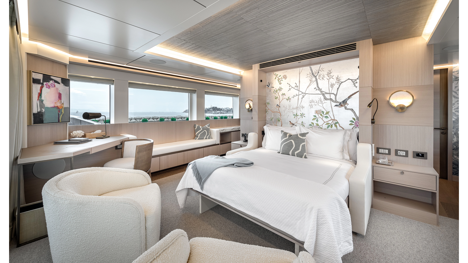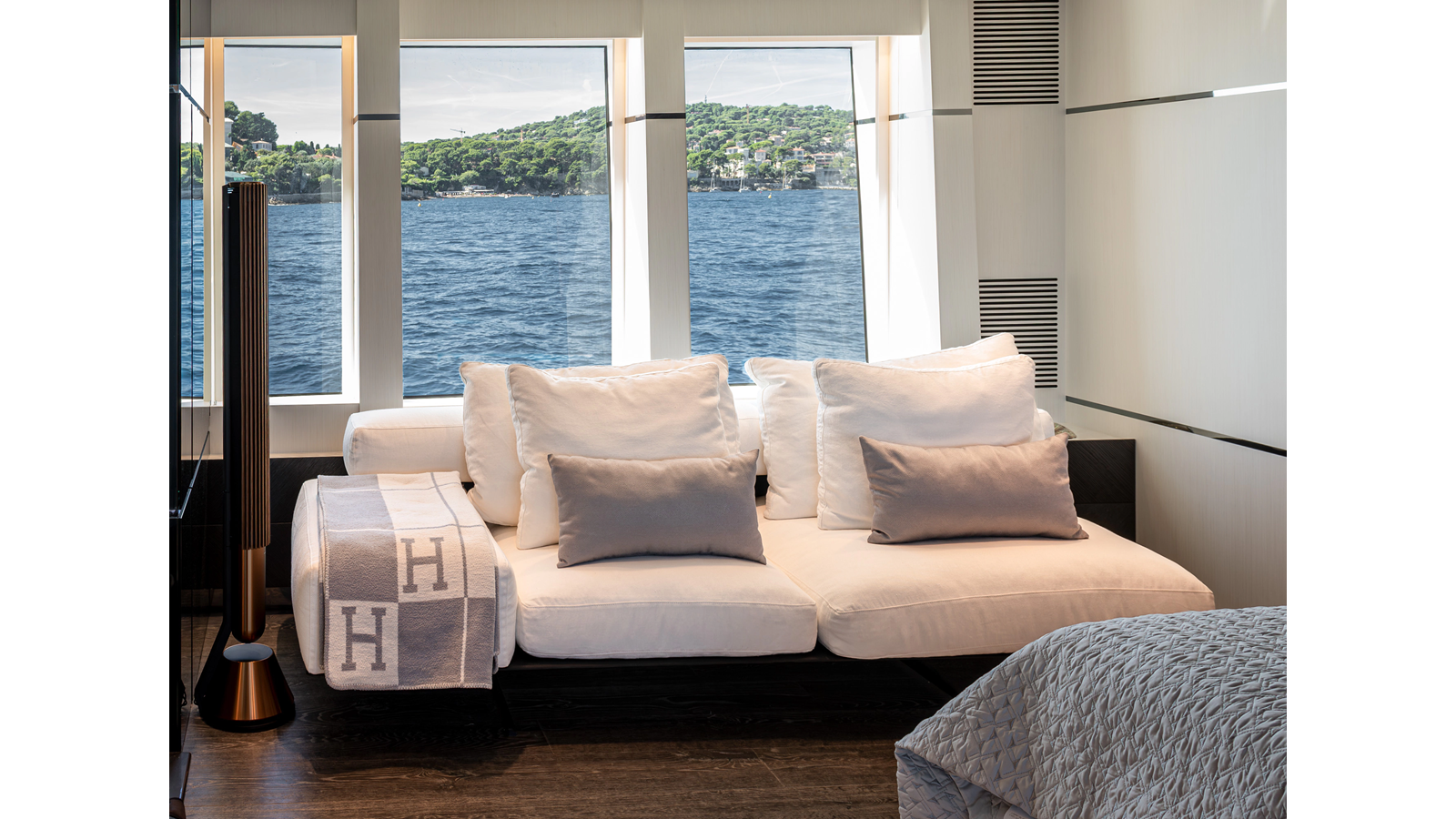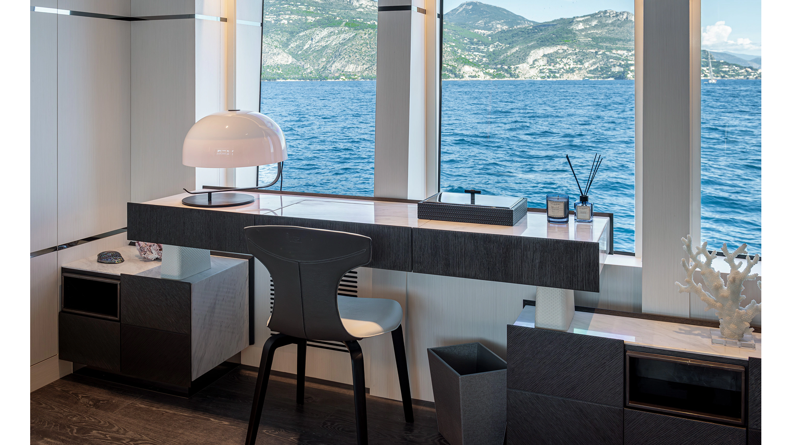 To the port side there is a desk and make-up area with chair facing the full length windows, aft of this is an ample wardrobe space against the aft bulkhead. A 55” TV is fitted above a low level unit with safety box and mini bar located centrally on the aft bulkhead viewable for the comfort of the bed. Sound is provided by a Marantz sound system with Bowers & Wilkins speakers giving a room filling experience. Apple TV and satellite equipment is also connected.