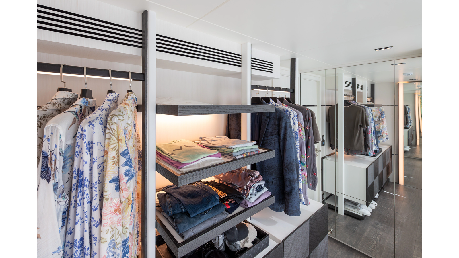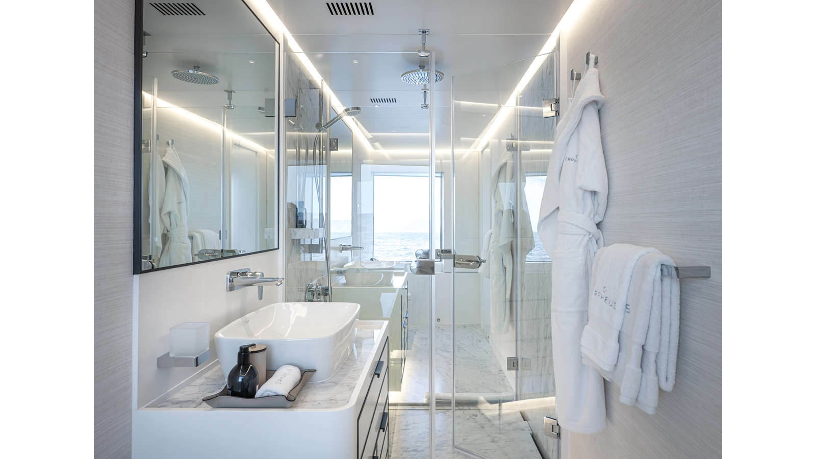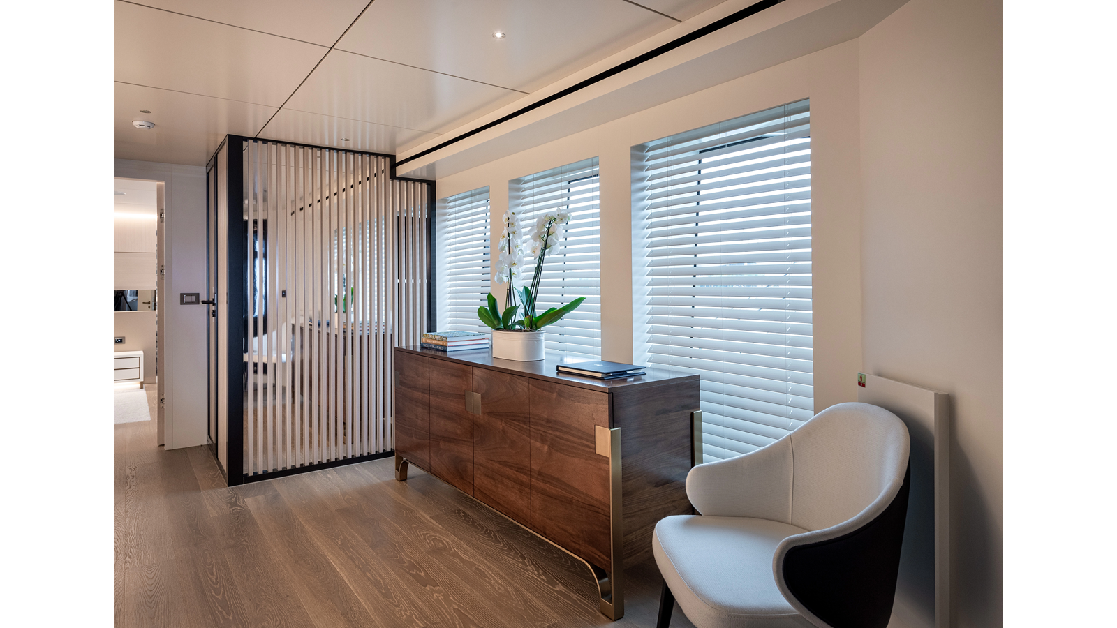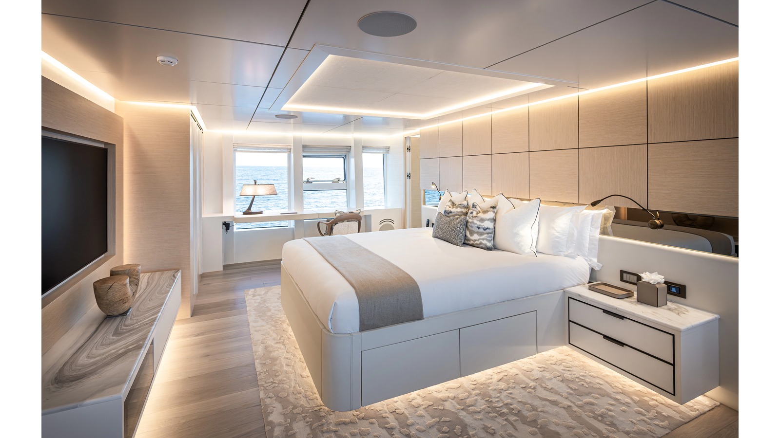 To the port side there is a desk and make-up area with chair facing the full length windows, aft of this is an ample wardrobe space against the aft bulkhead. A 55” TV is fitted above a low level unit with safety box and mini bar located centrally on the aft bulkhead viewable for the comfort of the bed. Sound is provided by a Marantz sound system with Bowers & Wilkins speakers giving a room filling experience. Apple TV and satellite equipment is also connected.