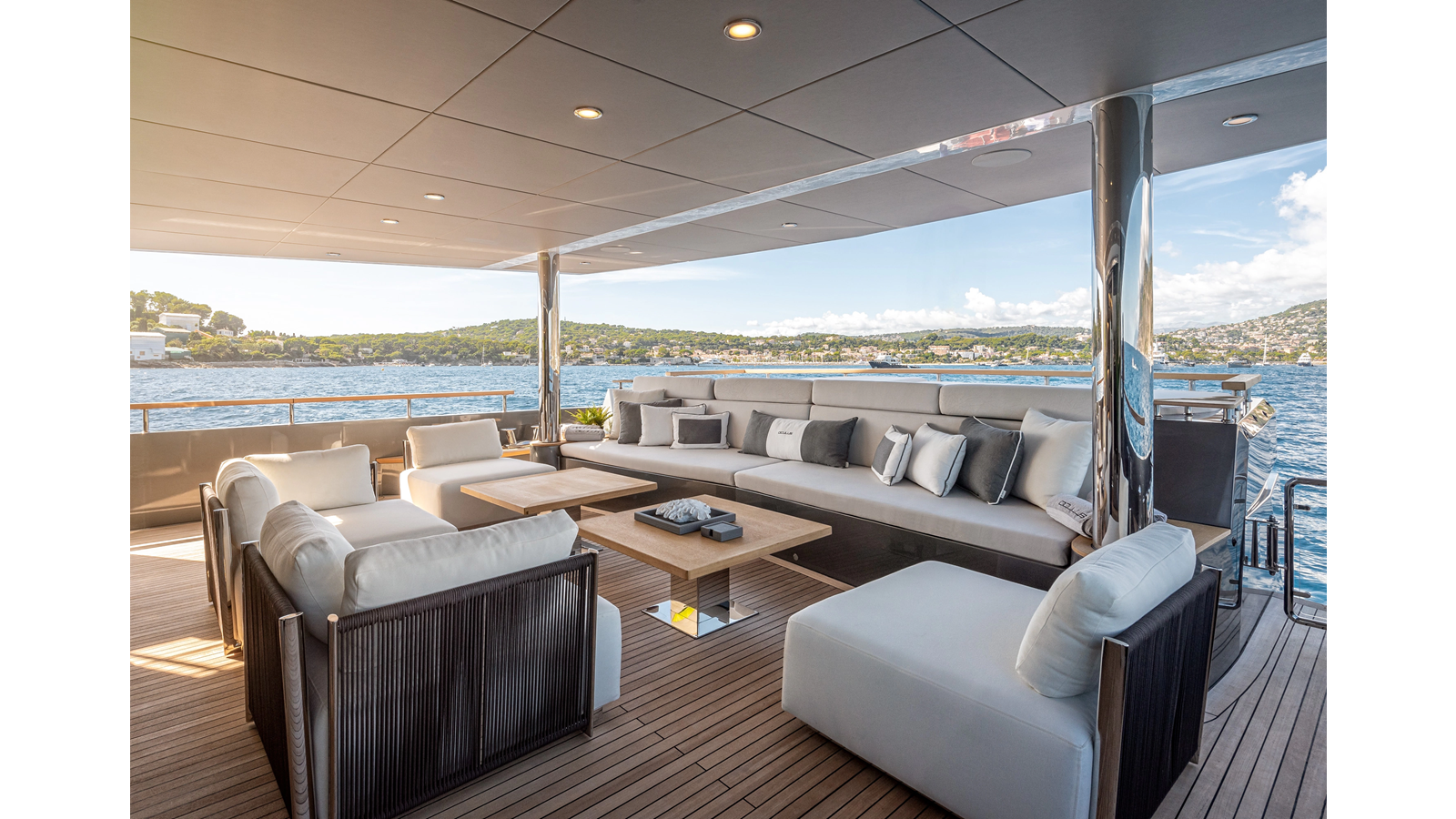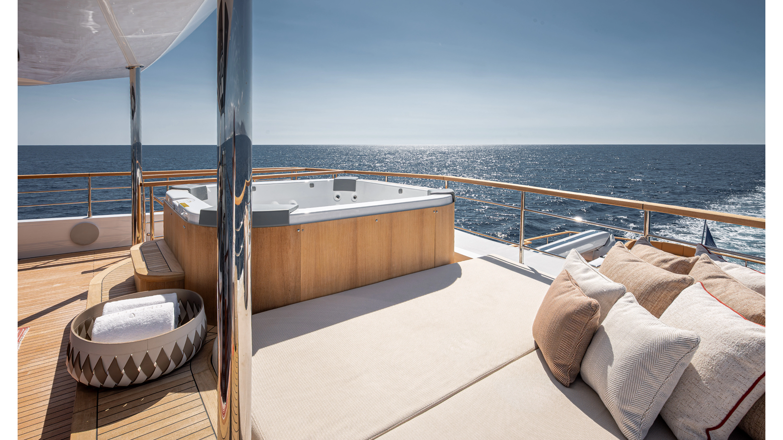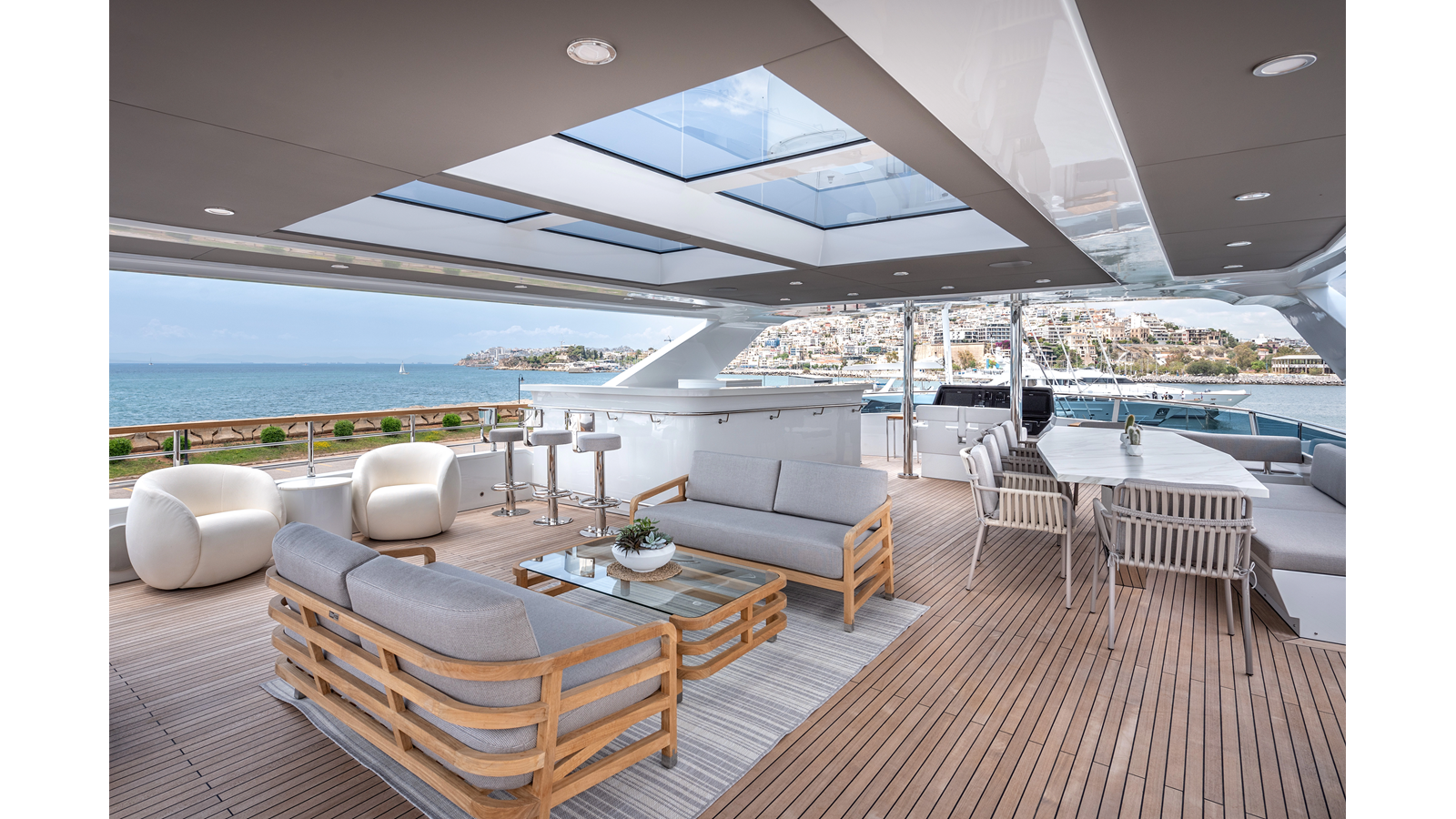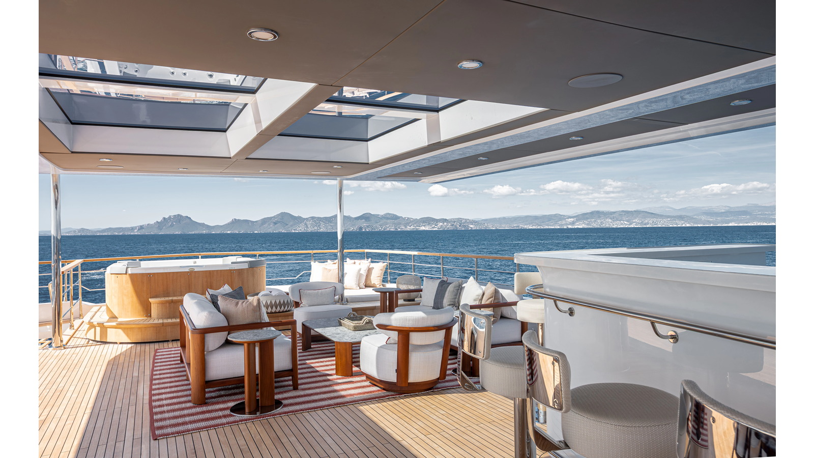 The upper deck is the owner’s level, it is a large storage deck for tenders and toys but when cleared it becomes a fantastic relaxing area or games area giving a full 50m2 of space.