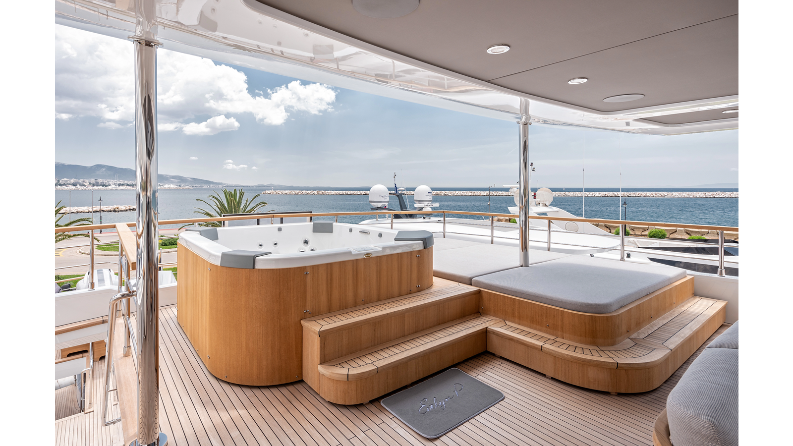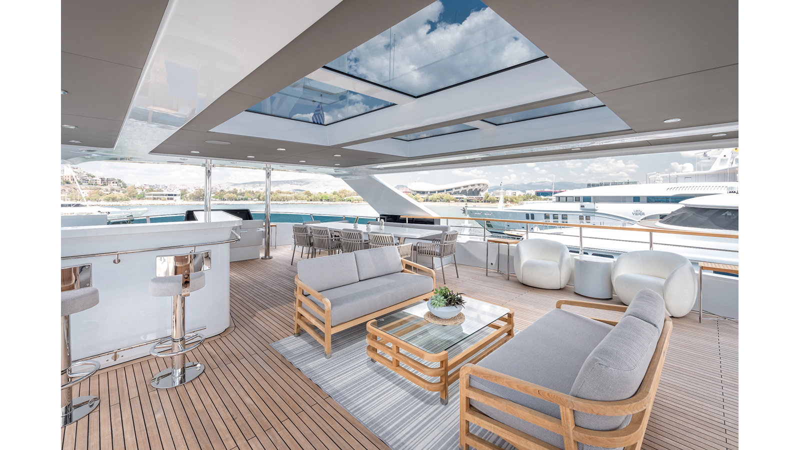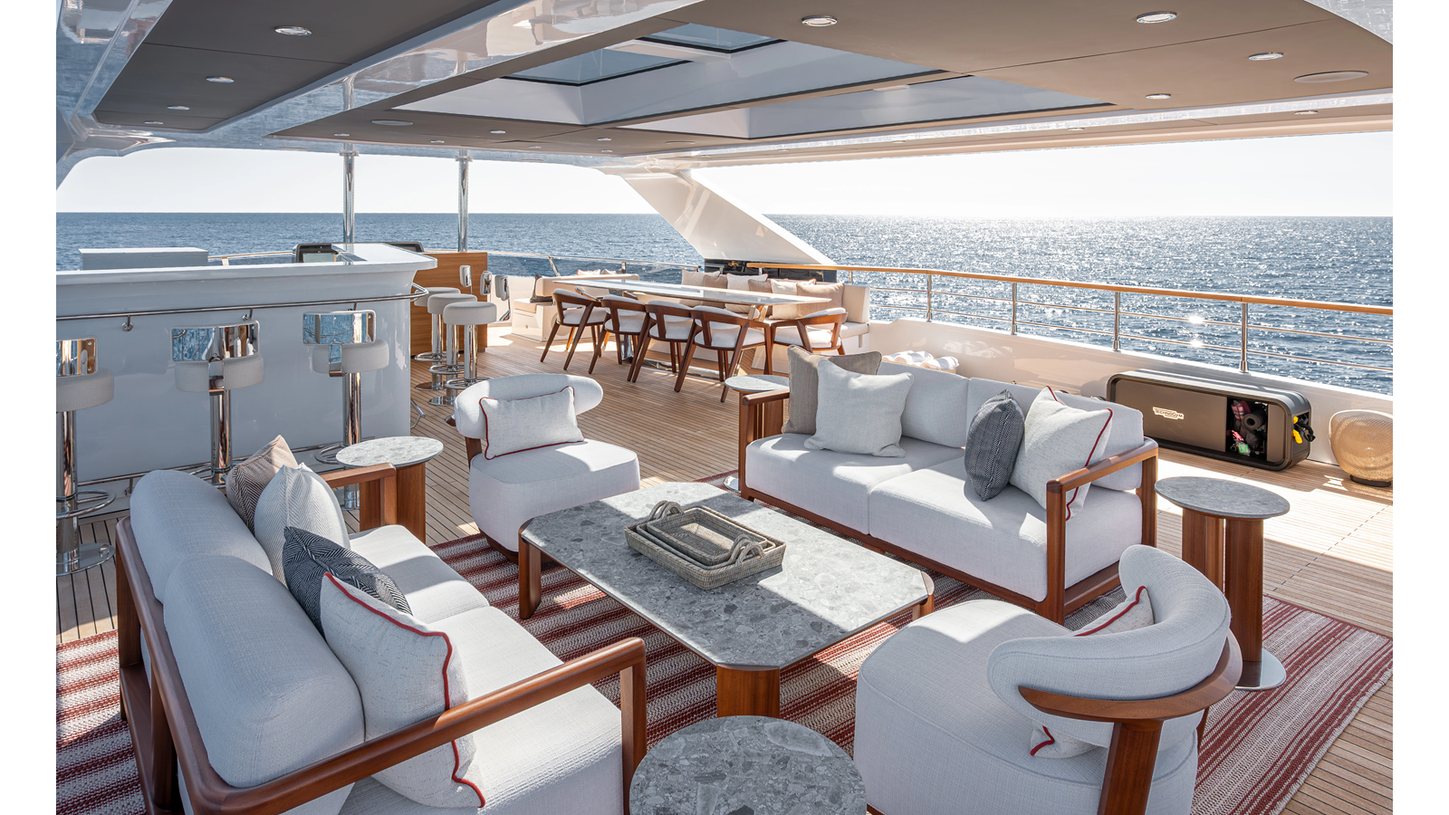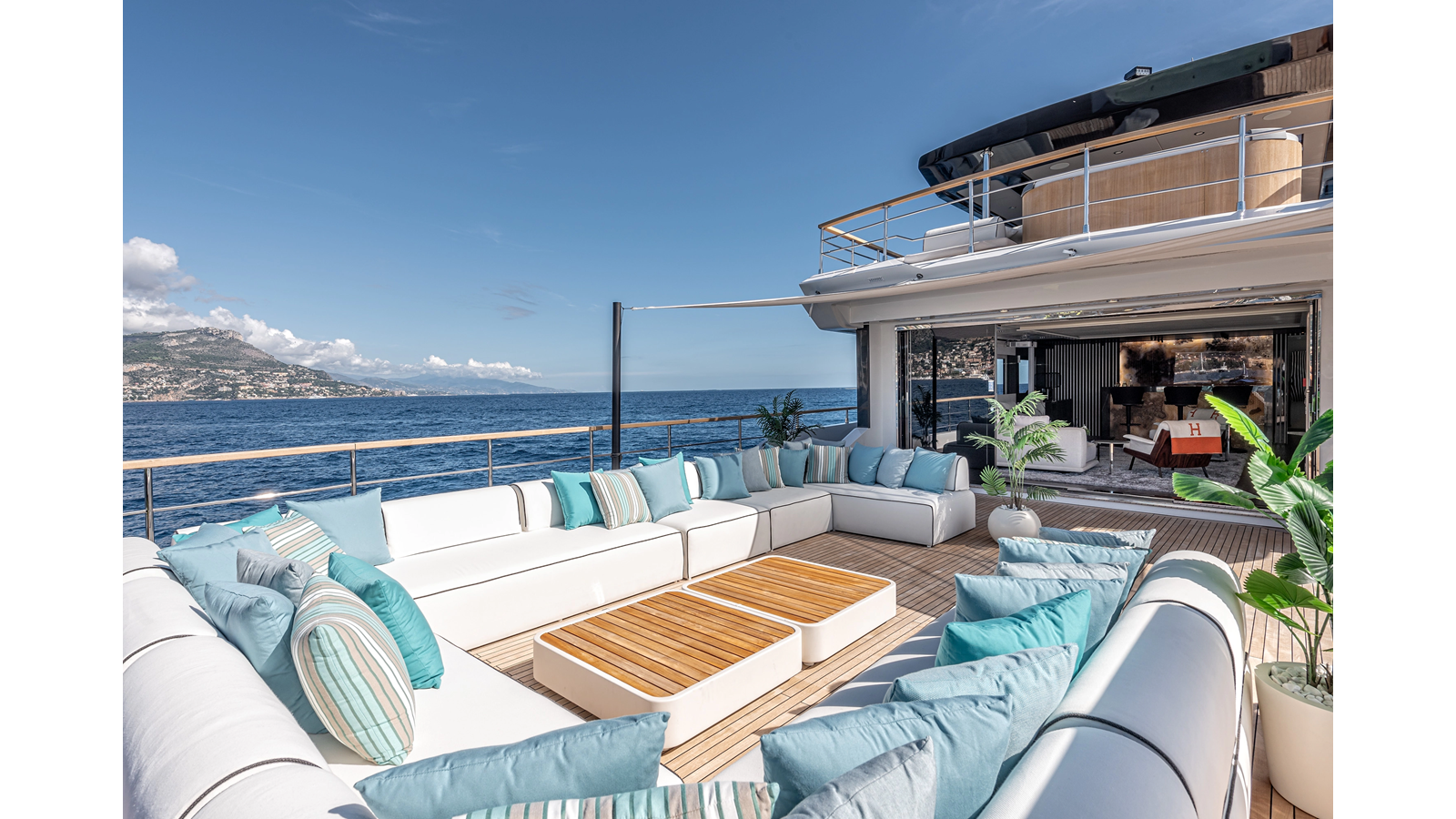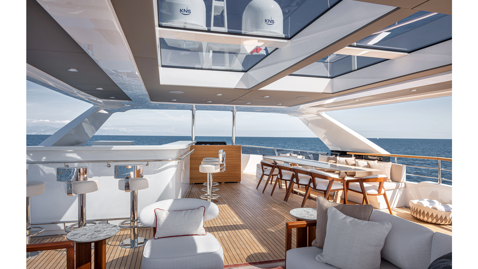 The upper deck is the owner’s level, it is a large storage deck for tenders and toys but when cleared it becomes a fantastic relaxing area or games area giving a full 50m2 of space.