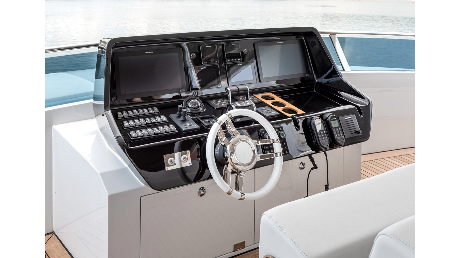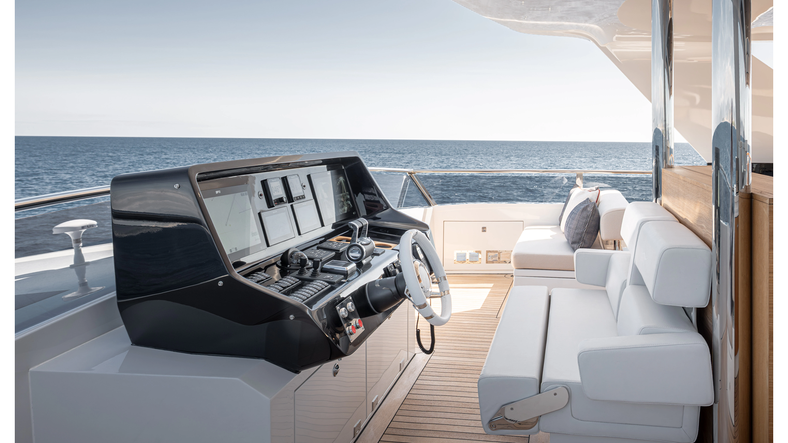 Forward on the Flybridge is the upper helm and two side seats for the perfect view during navigation.