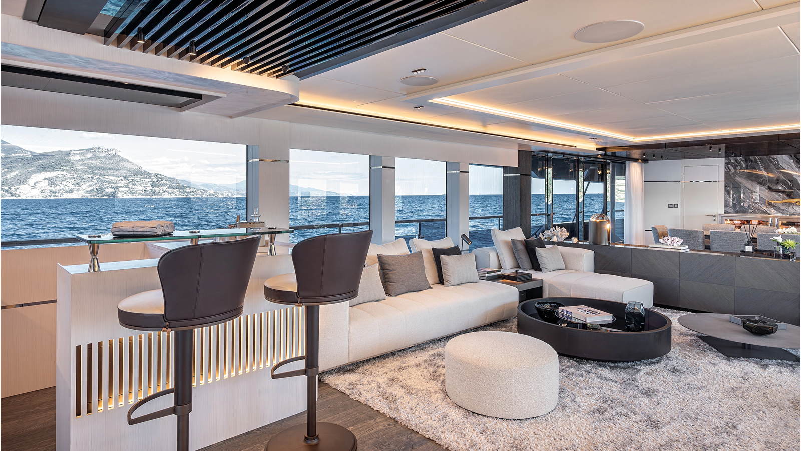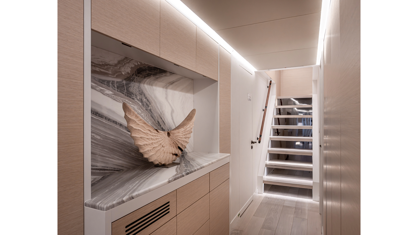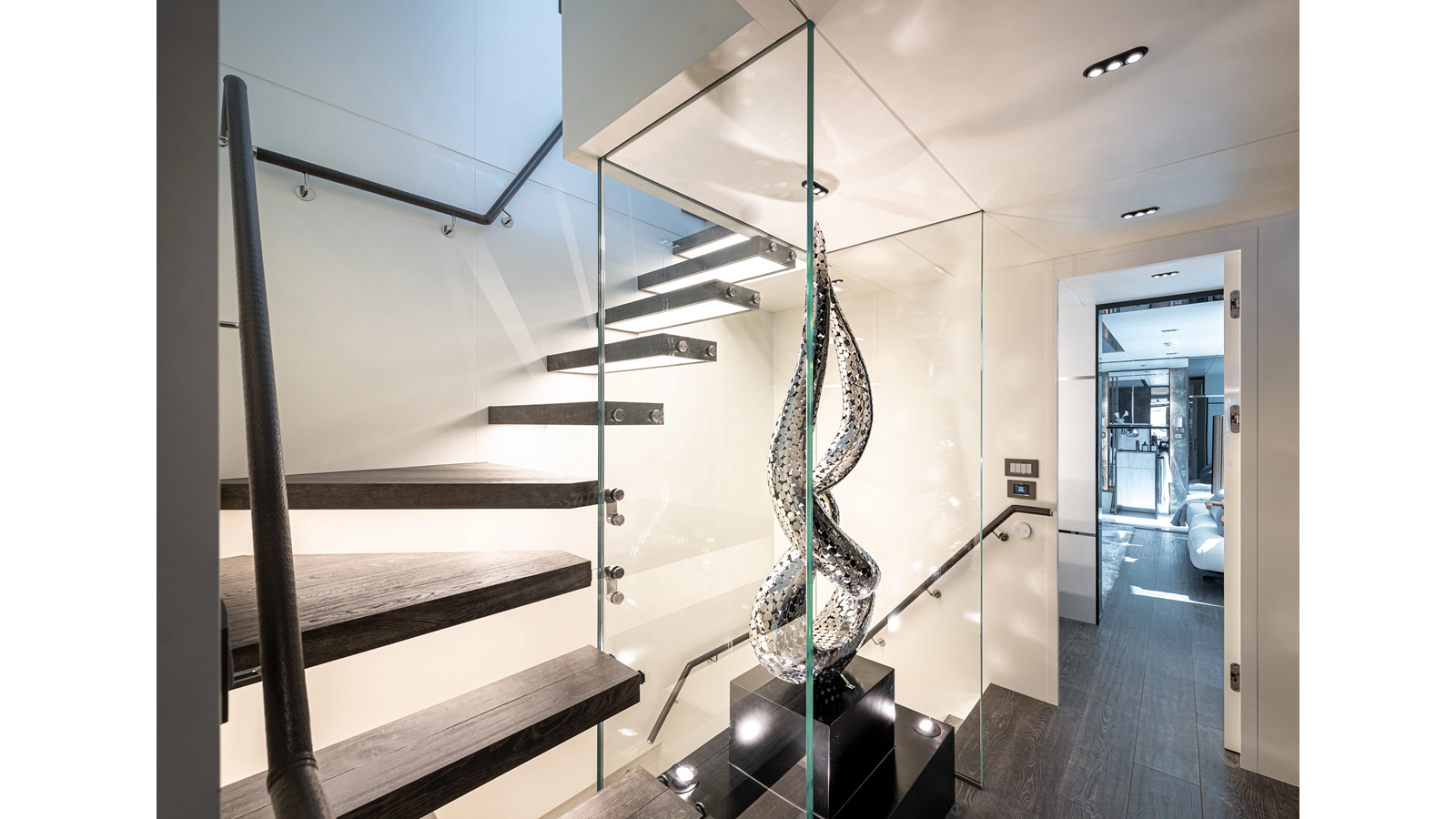 The main deck lobby provides access to from the saloon to the lower deck, upper deck, master cabin, day head and gym area. It has a glass feature staircase to the upper lobby and owner’s cabin. Here there is space for a sculpture if the owner wishes.