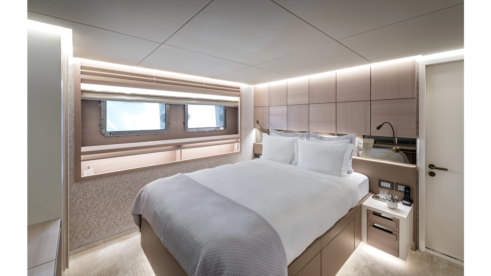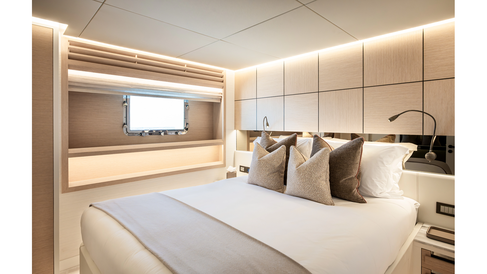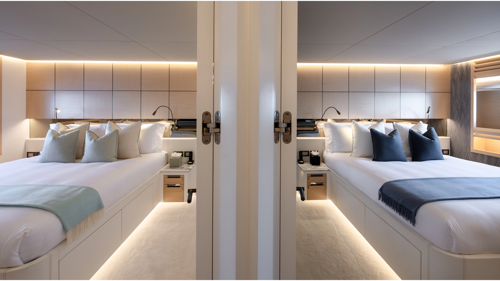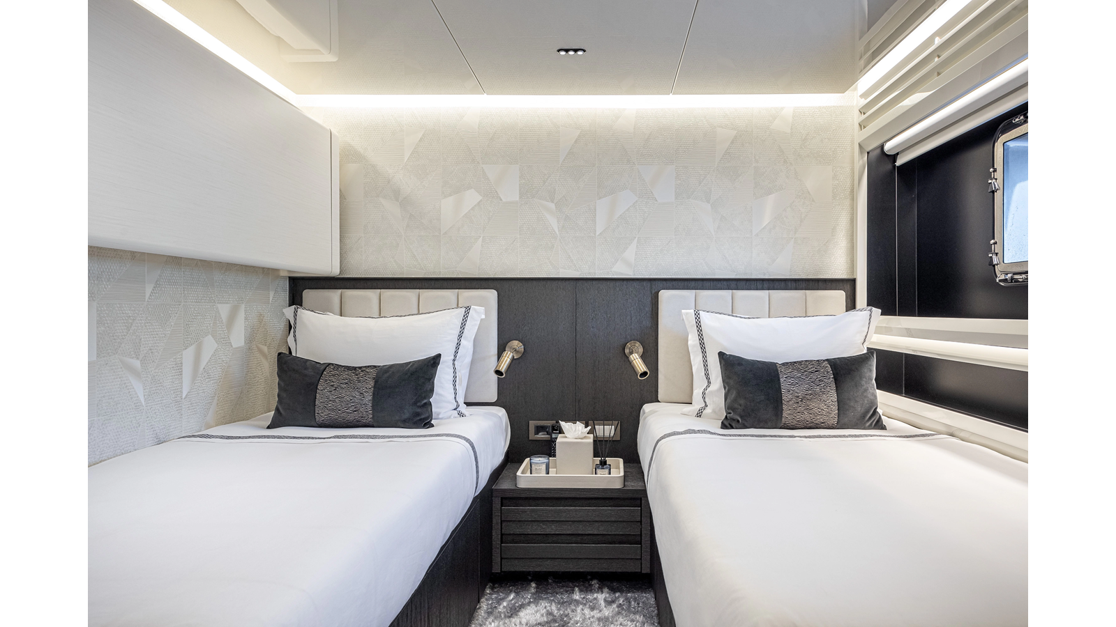 The accommodation has a twin single beds facing aft located against the outboard and inboard sides and forward bulkhead. There is a shared bedside tables between the beds, the entrance to the ensuite bathroom is central on the aft bulkhead.