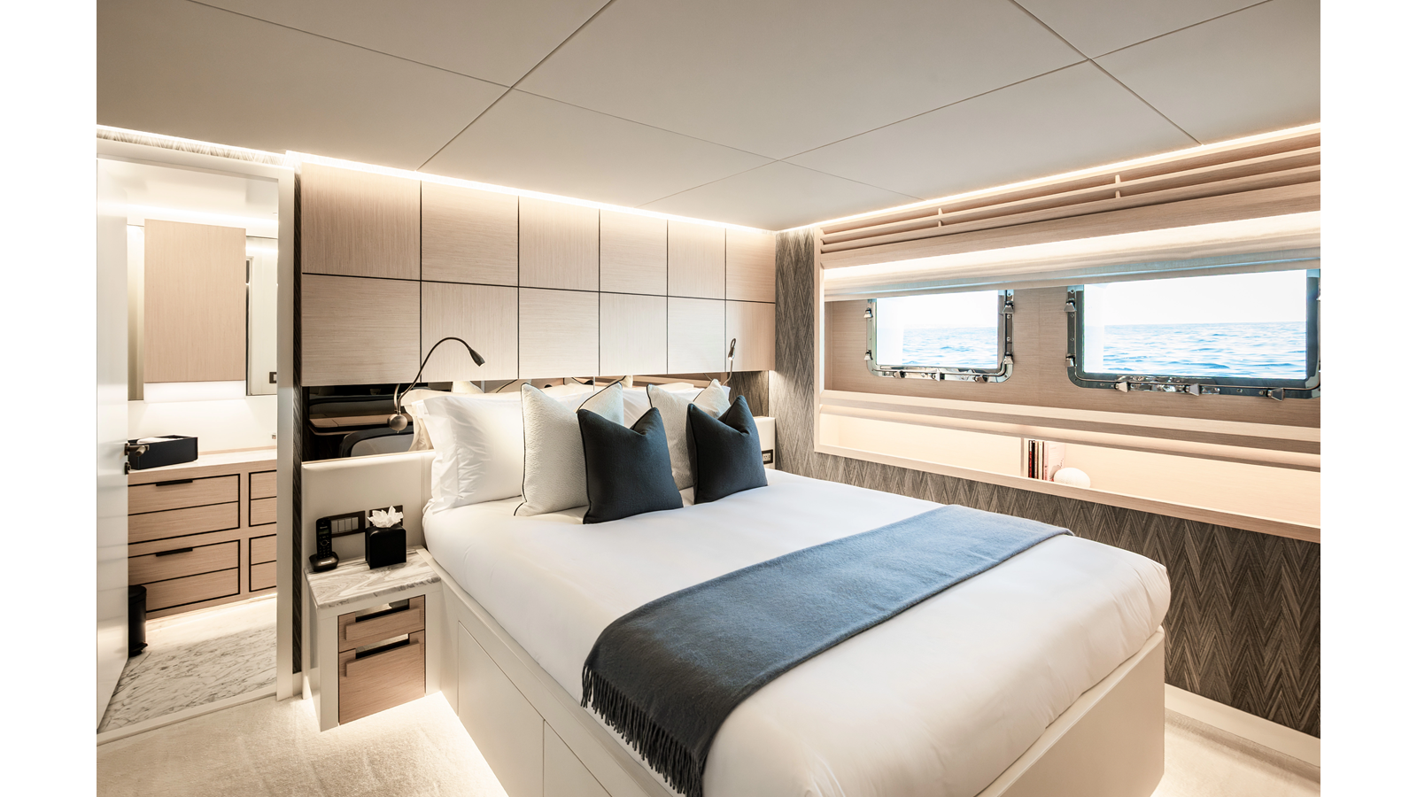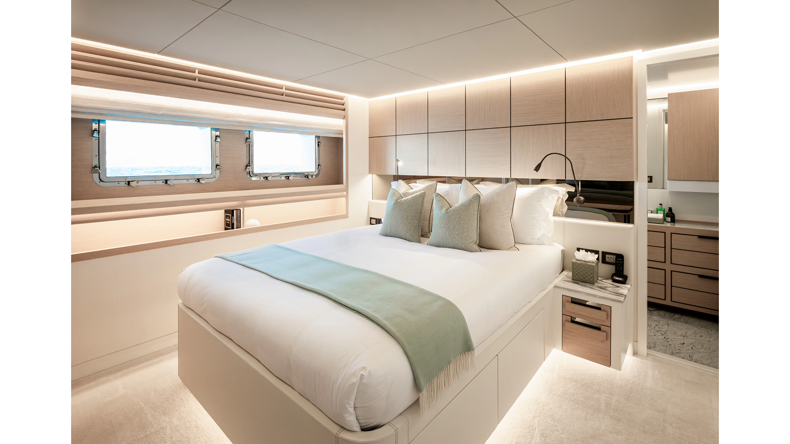 The airy accommodation has a queen sized bed facing forward located against the aft bulkhead forward of the ensuite area. There are bedside tables on either side, inboard of the bed is the entrance to the ensuite bathroom.