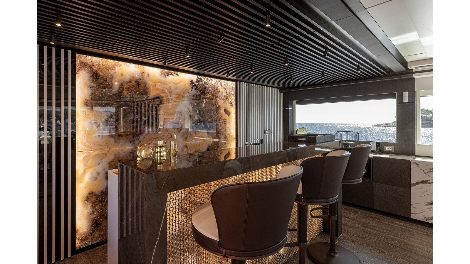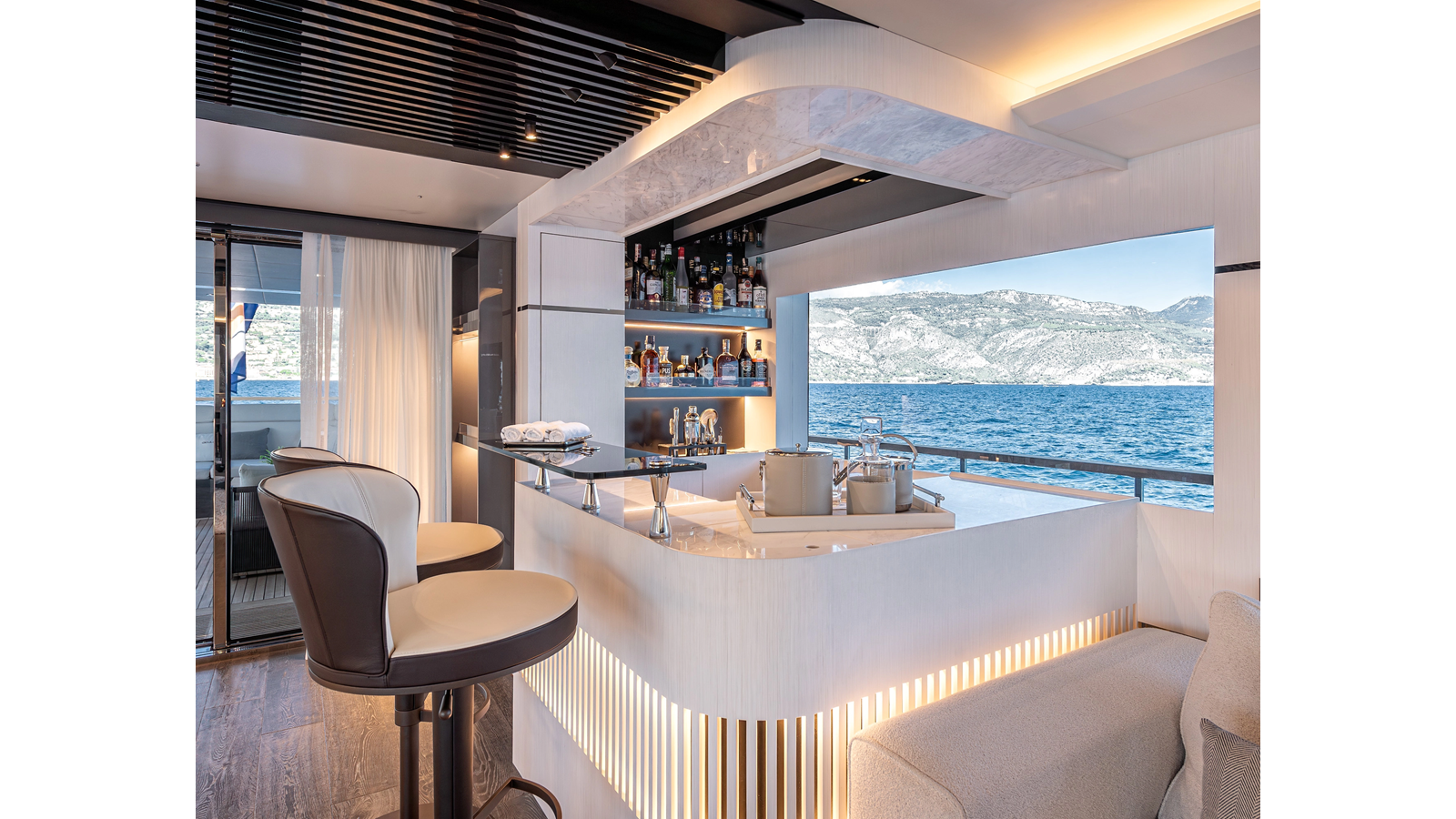 The wet bar on the starboard side has BBQ, fridge, ice maker and sink making it ideal for preparing snacks whilst entertaining. To the port side storage cupboards and the dumb waiter deliver food direct from the galley.