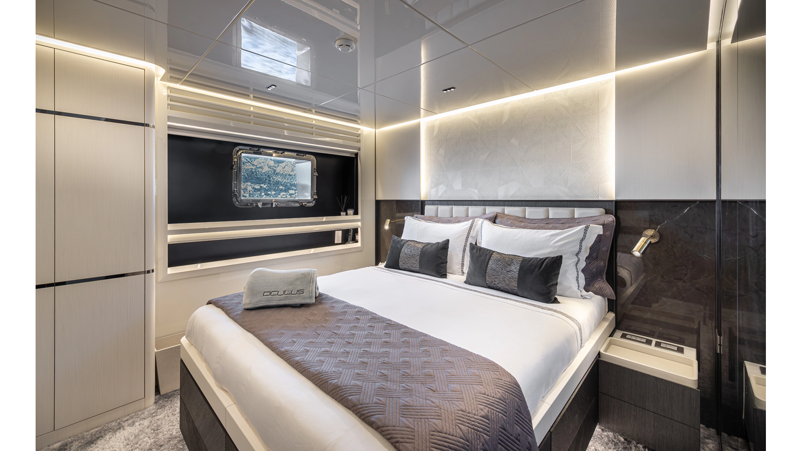 Located on the upper deck the full beam accommodation comprises of a large sleeping area with SuperKing size bed backed by large wardrobes which create a personal dressing area. The bed faces the aft sliding glass doors with view across the upper deck and into the horizon. The entry is from the upper lobby passing the ample wardrobe and storage area with fitted safety box, mini bar and dumb waiter into the aft facing room.