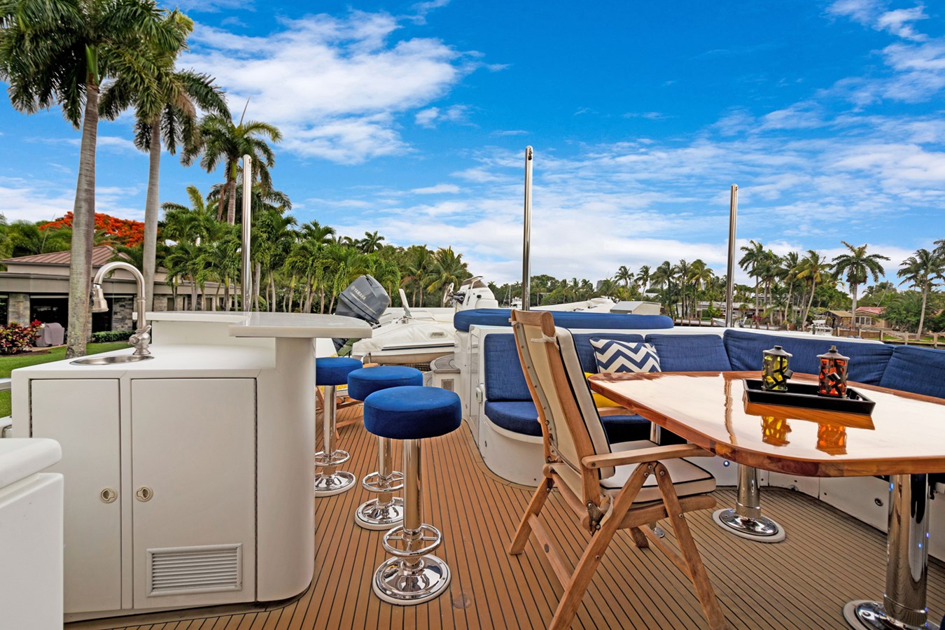 Boarding the 96′ 2005 Hargrave Capri Skylounge “OSSUM DREAM” is from the Swim Platform or the Aft Deck side boarding gates. The spacious Aft Deck has both fixed and loose seating options. Open steps lead to the Boat Deck. A sliding door leads to the Salon with a three person walk behind bar to port, with a six cushion sofa forward. To starboard is a 55” TV and six storage cabinets and two swivel chairs, forward.