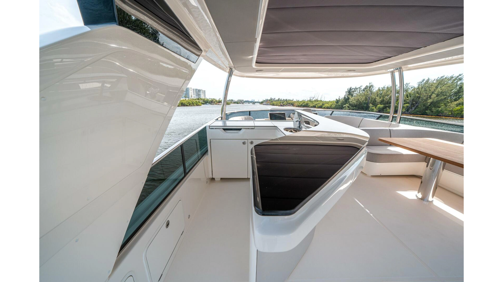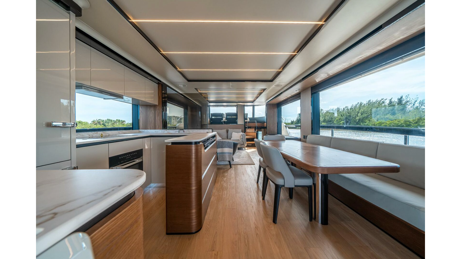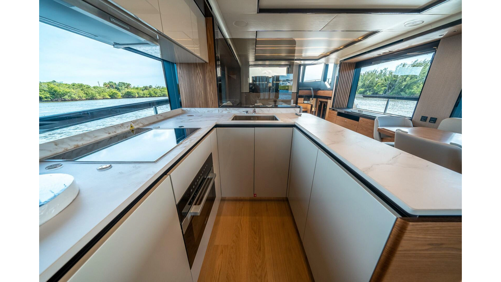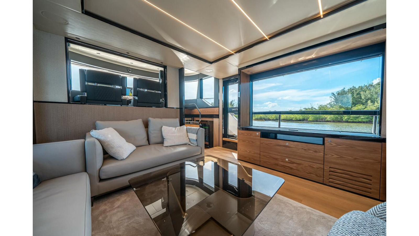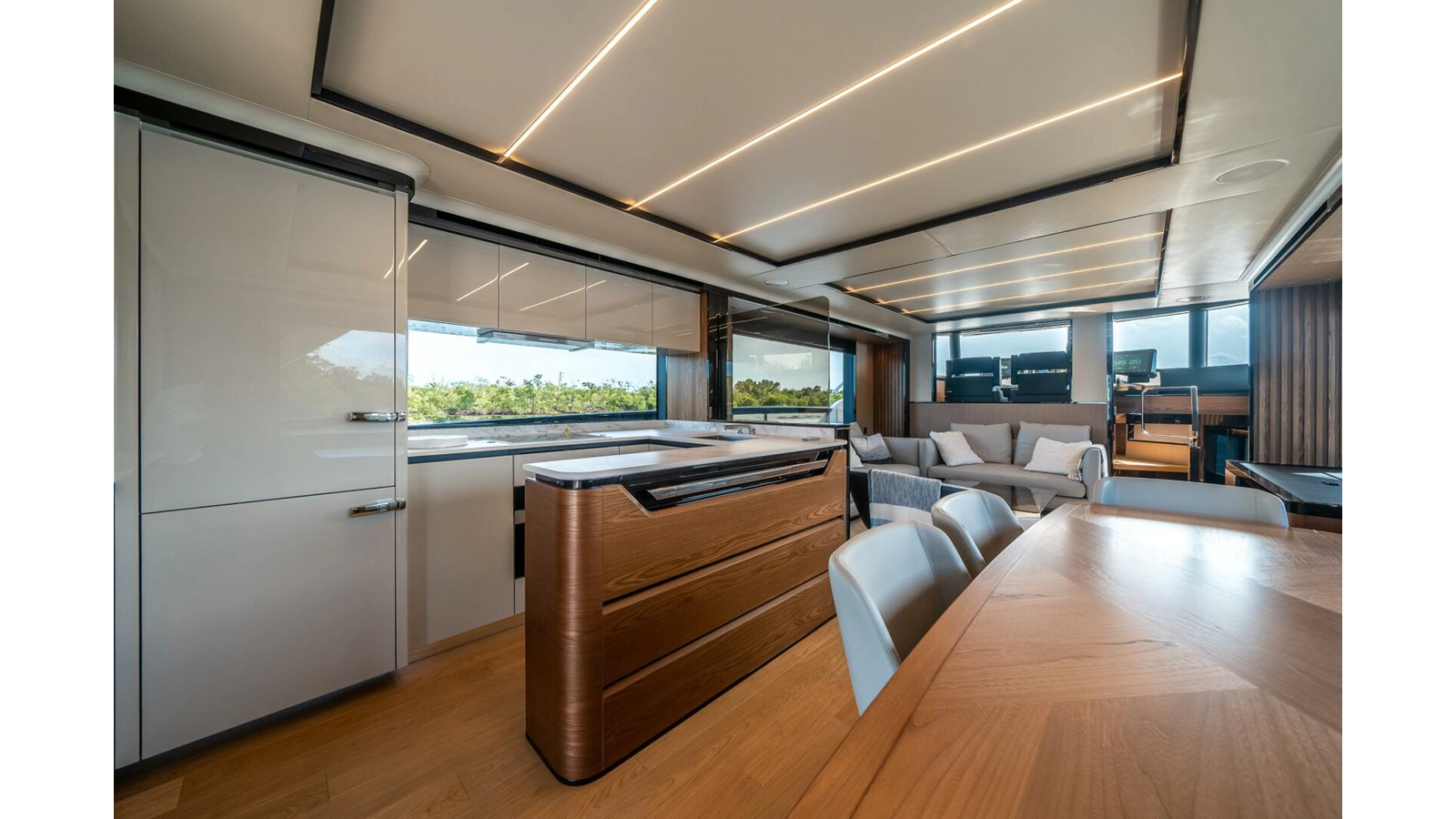 - Smoke tinted glass access door to the salon with two sliding doors and retractable glass window with electric high and low mechanism, that goes into a piece of furniture, usable from the galley and the cockpit, with Dekton with Calacatta marble nuances countertop.