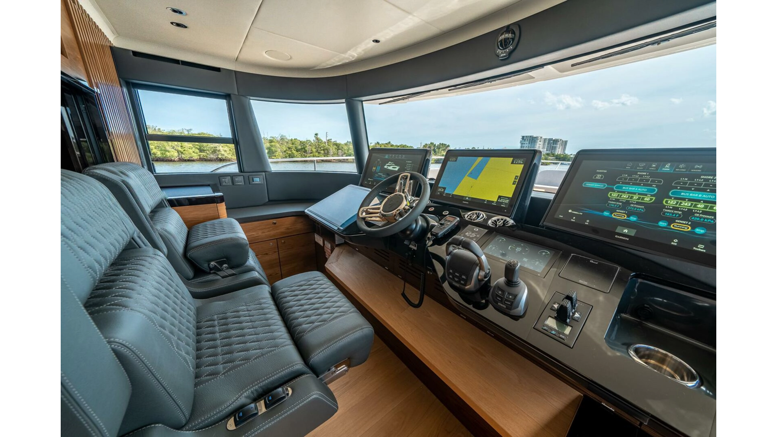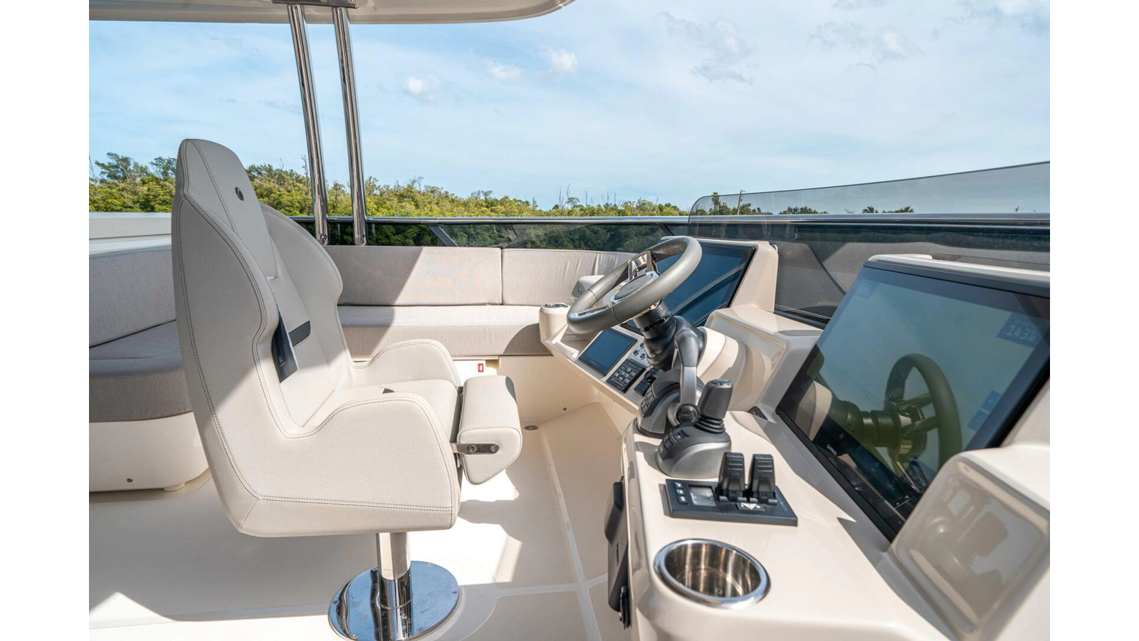 - Electrically adjustable captain seat made of anthracite grey-color leather with footrest and GPS keyboard on right armrest.