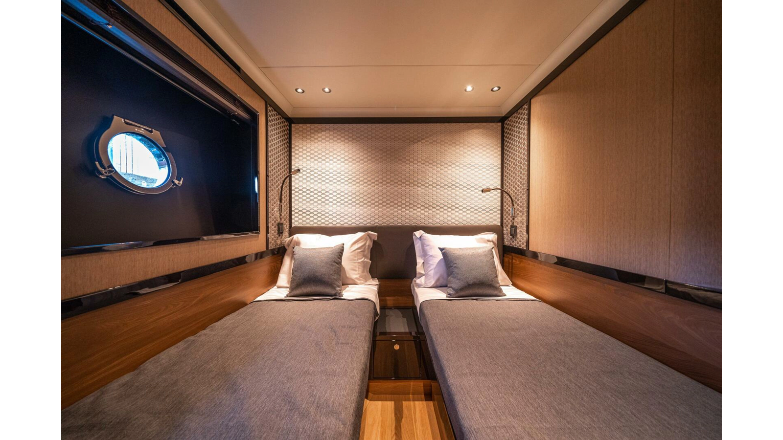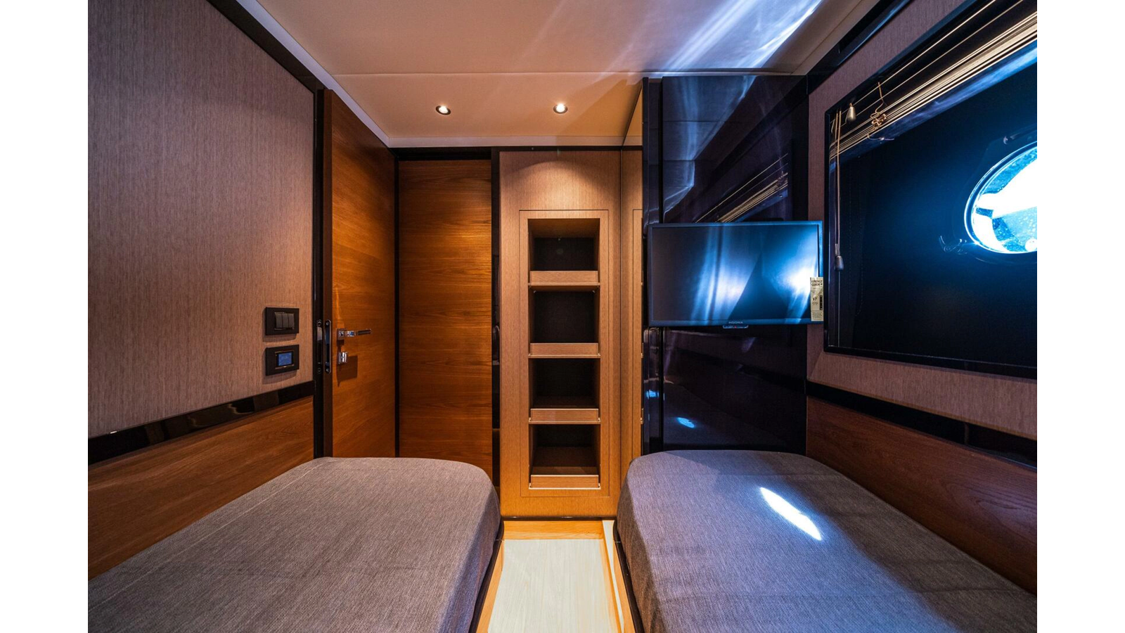 - Captain cabin with door, single bed, wardrobe, shelves, HPL floor and opening porthole.