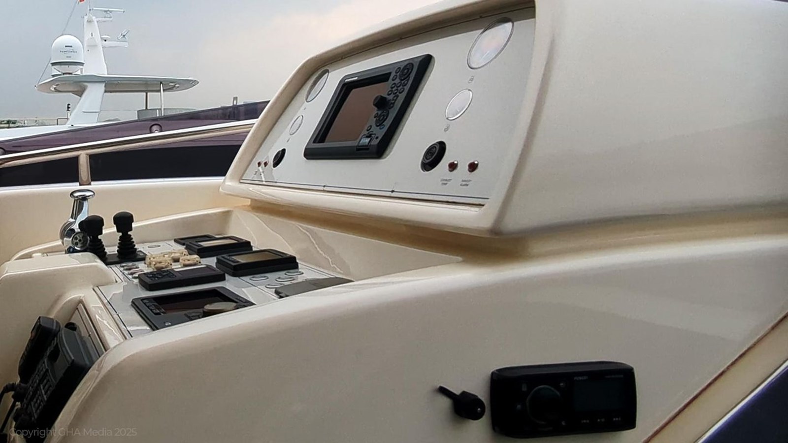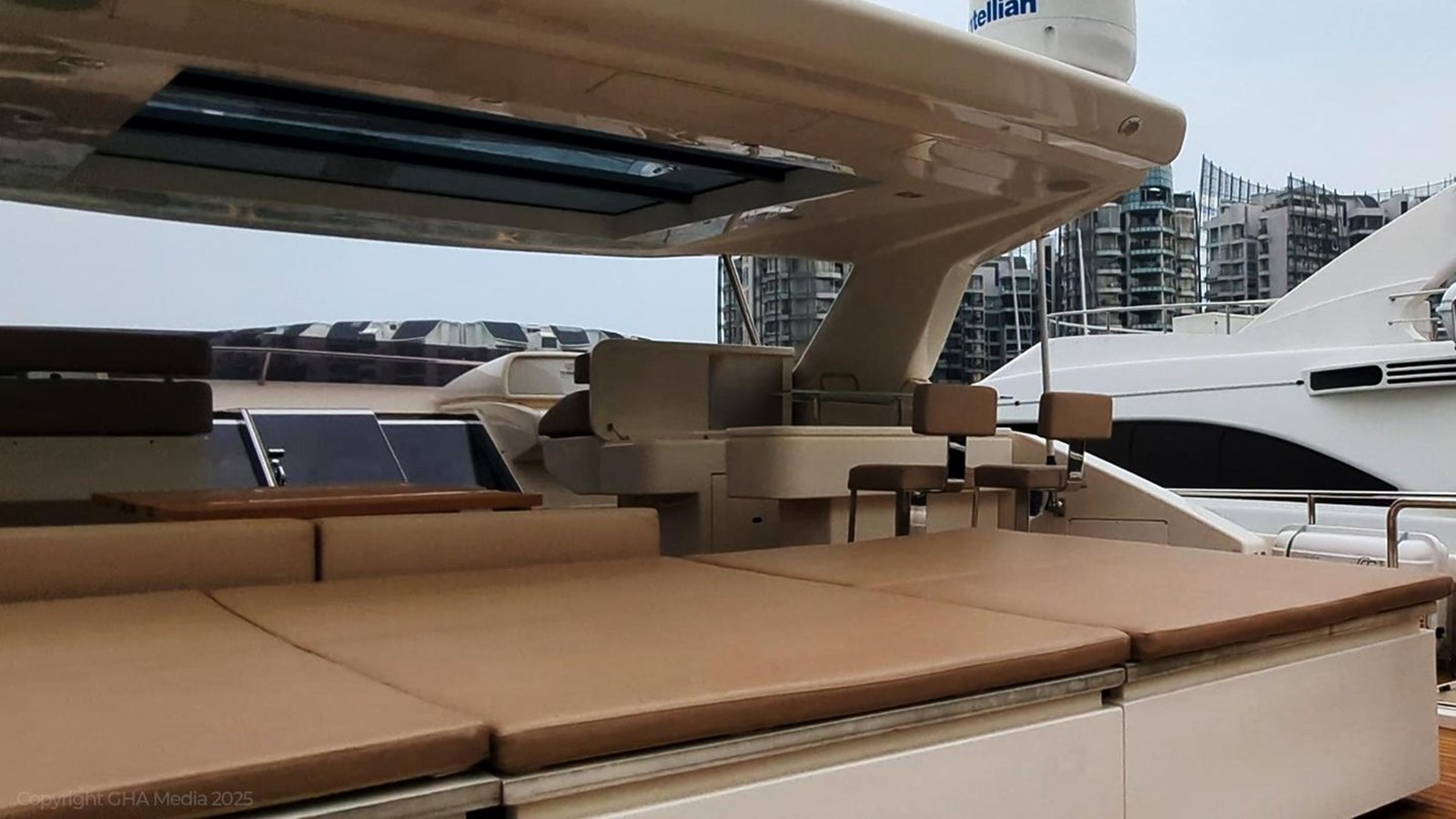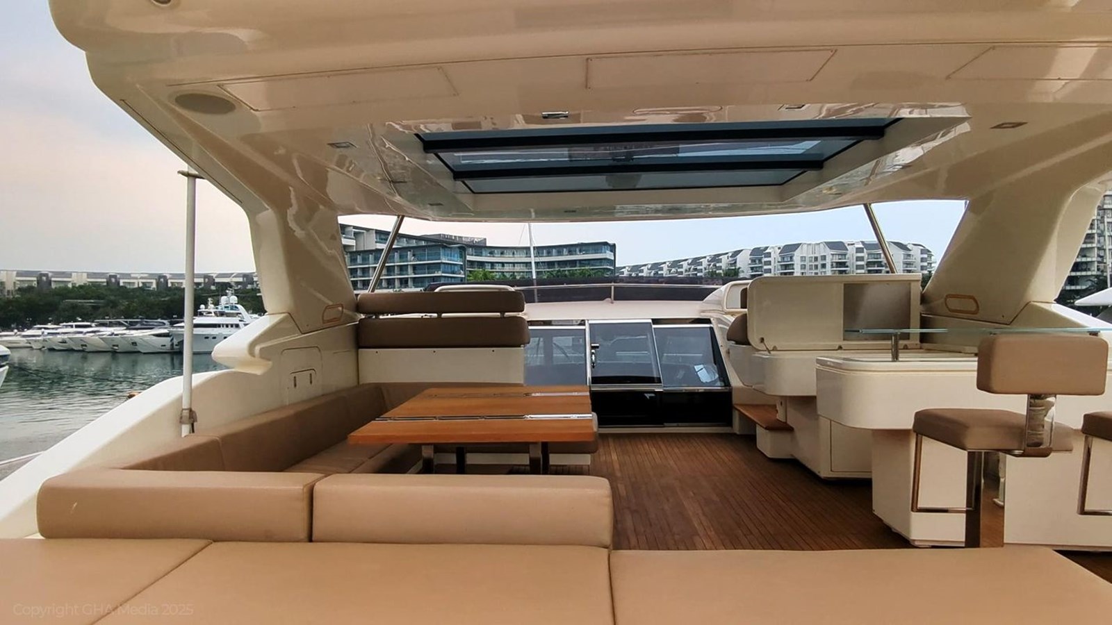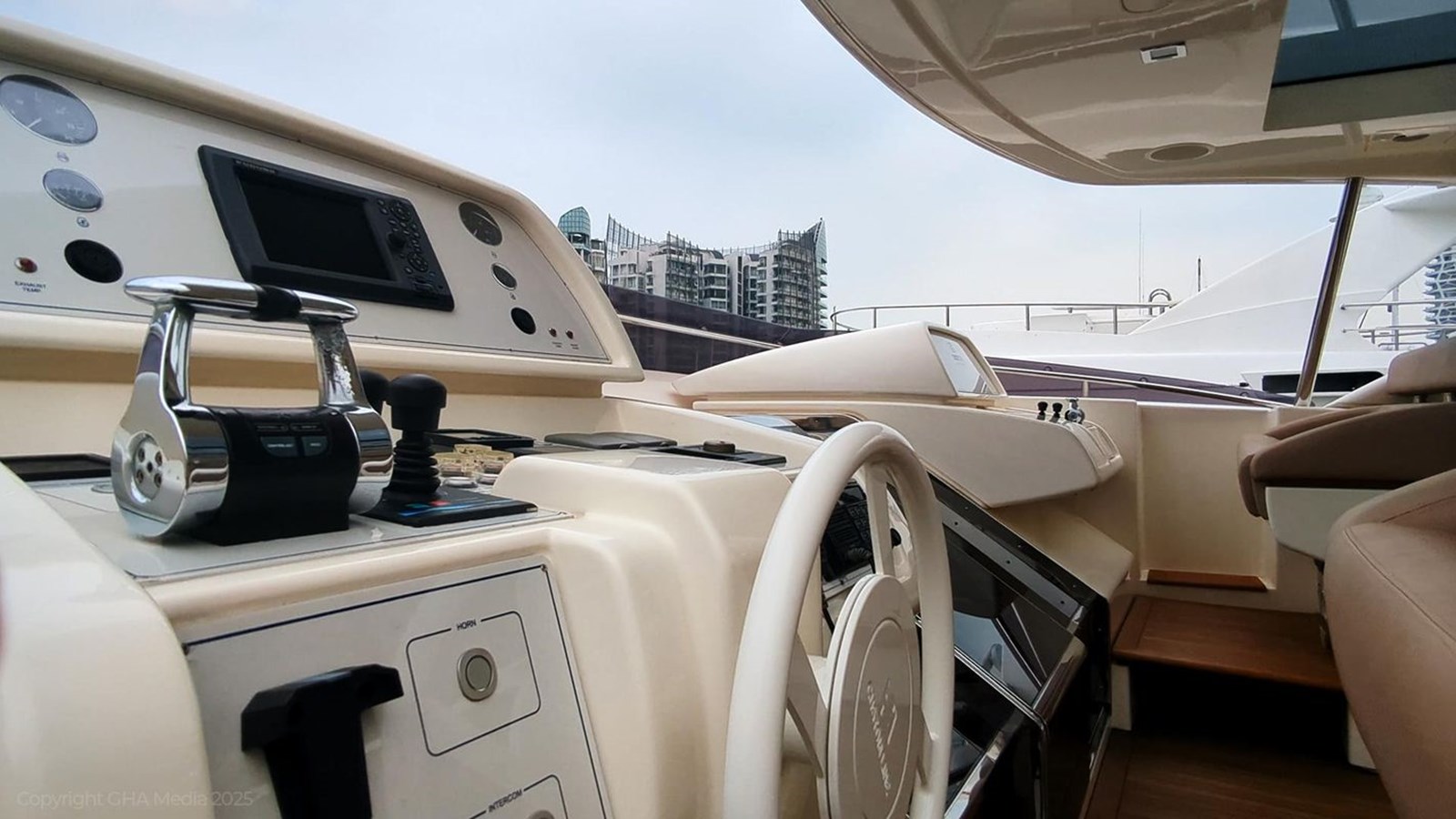 She features a 5-cabin layout including a full-beam master on the main deck, two VIPs, and two twin cabins below. The interior is bright, spacious, and finished in classic Ferretti styling. Outdoor areas are well laid out, with a large f lybridge, forward sunbathing area, and a comfortable cockpit for alfresco dining.