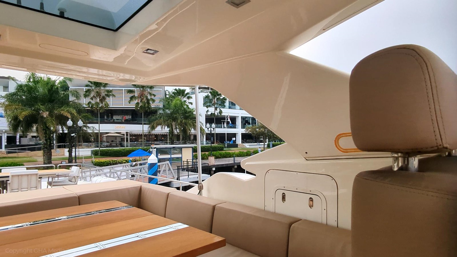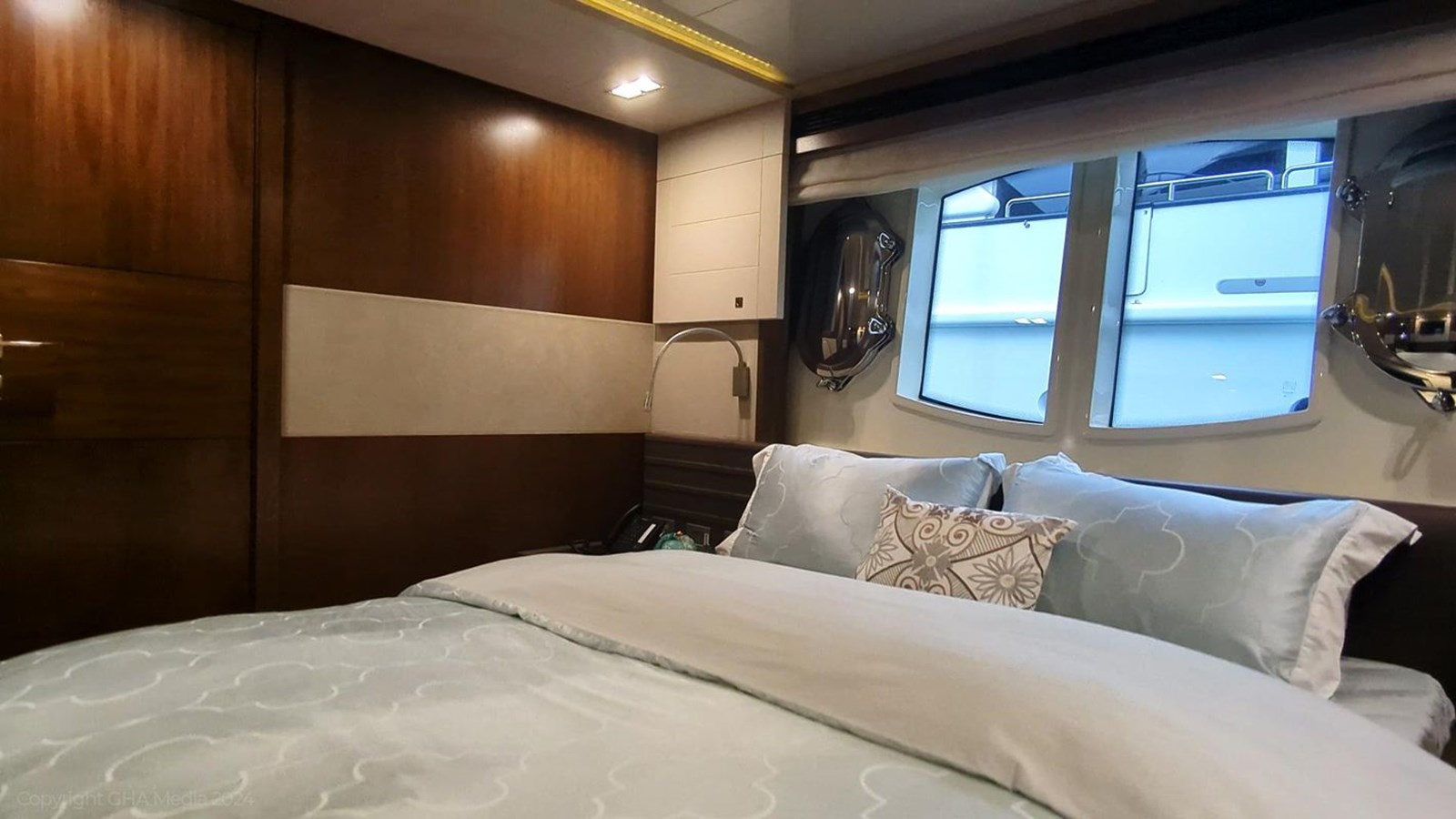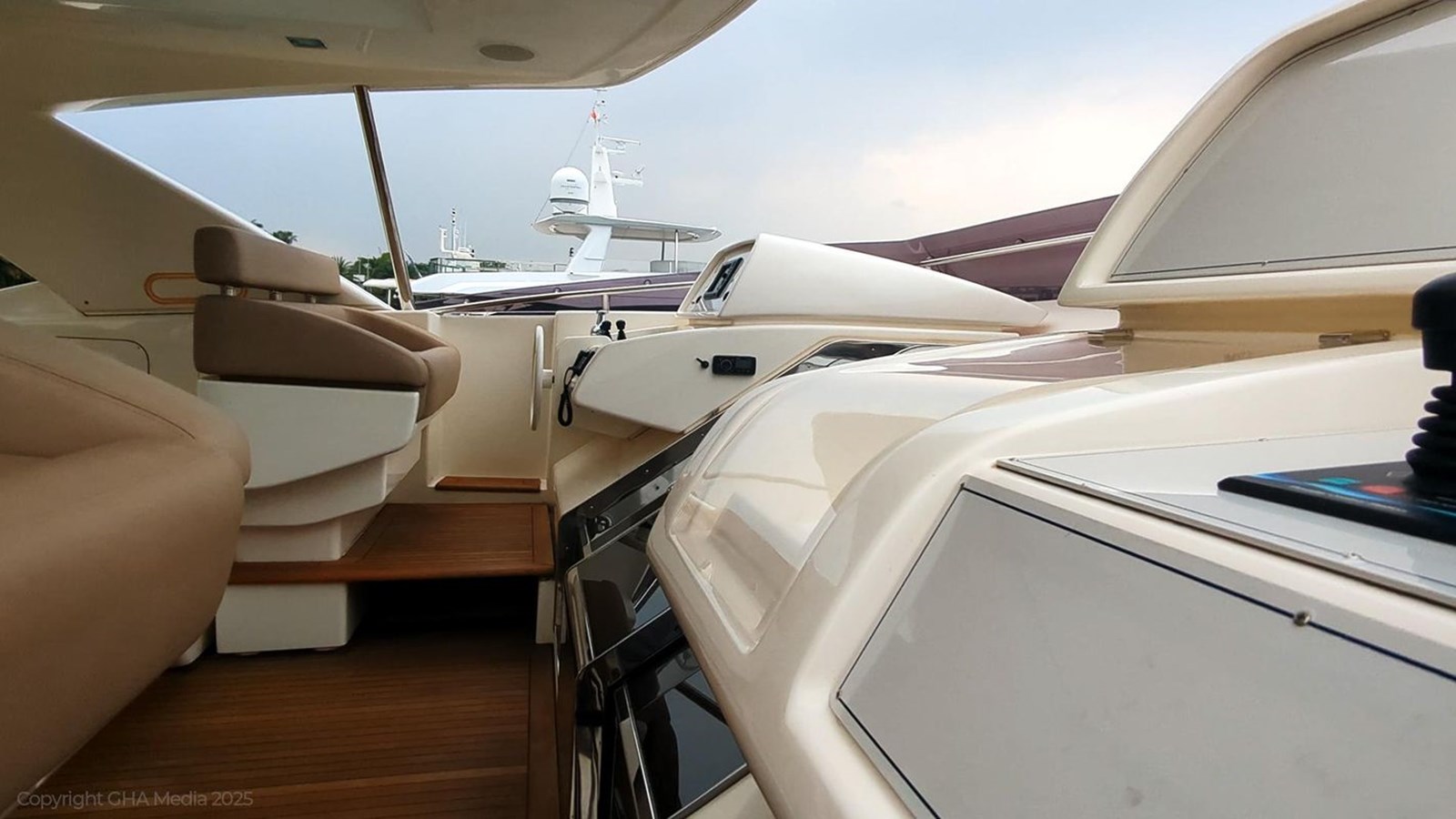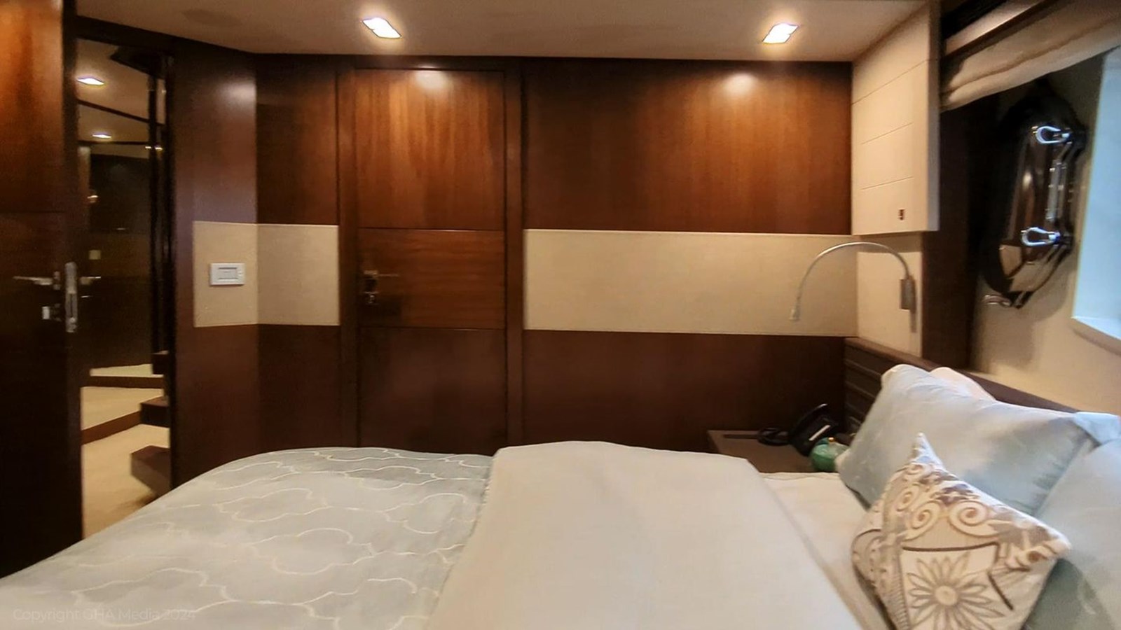 She features a 5-cabin layout including a full-beam master on the main deck, two VIPs, and two twin cabins below. The interior is bright, spacious, and finished in classic Ferretti styling. Outdoor areas are well laid out, with a large f lybridge, forward sunbathing area, and a comfortable cockpit for alfresco dining.