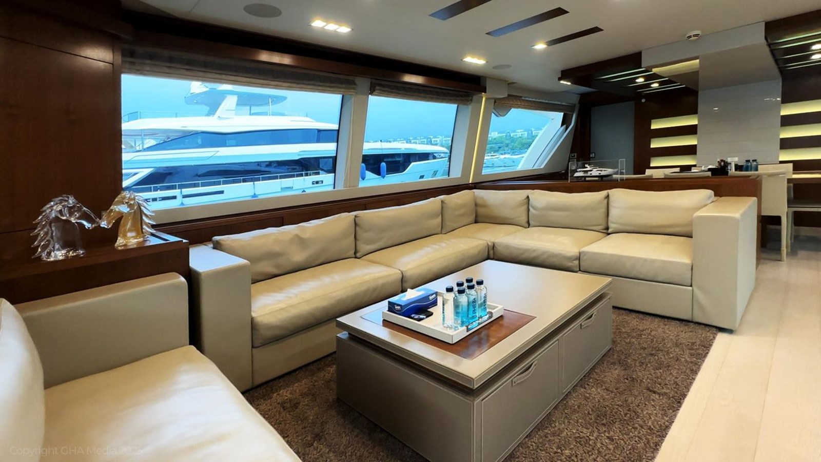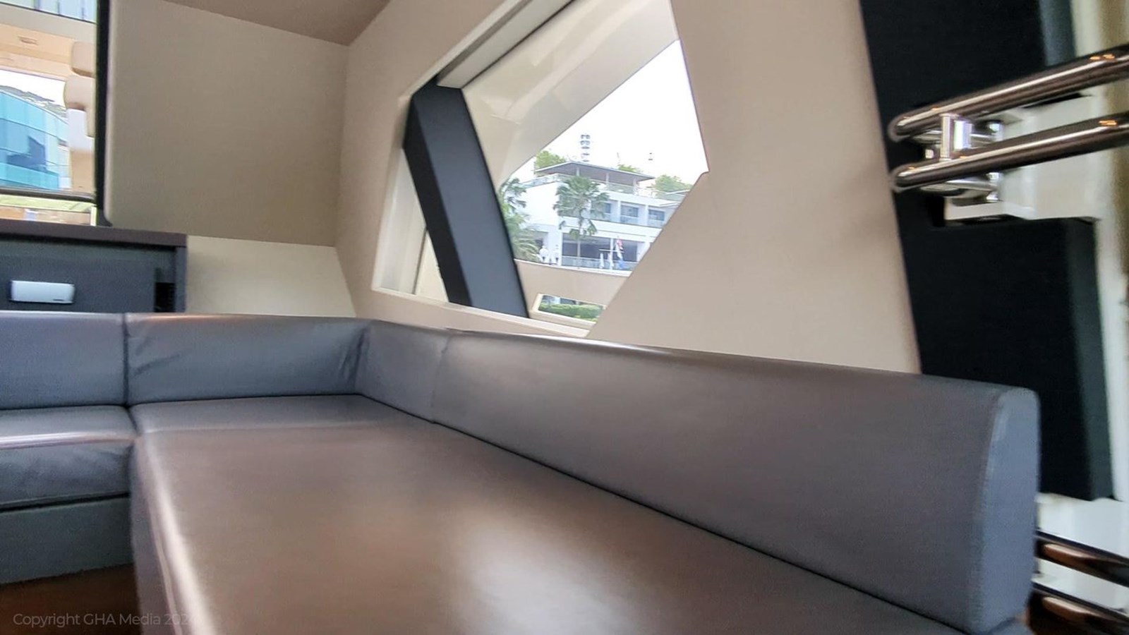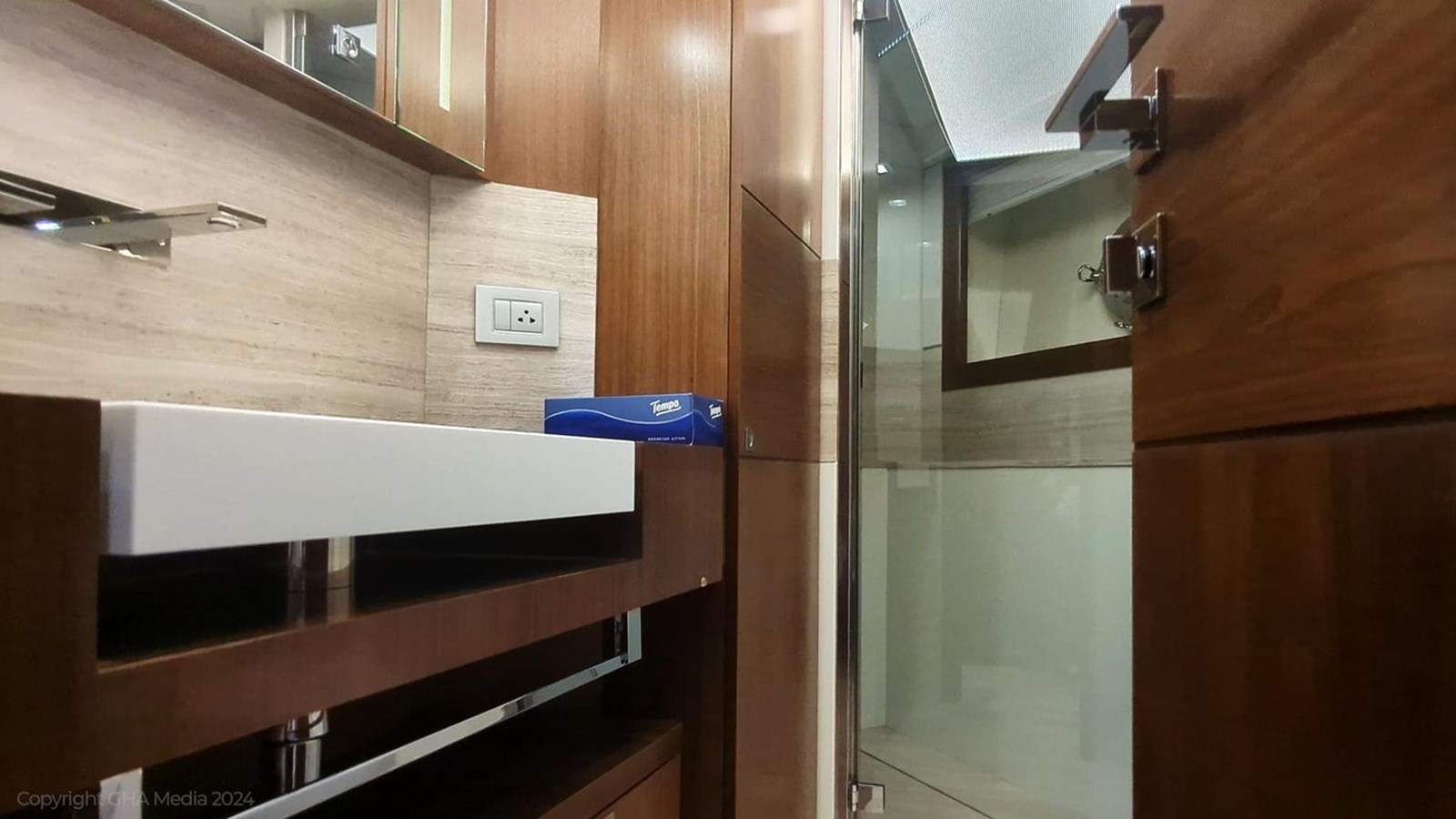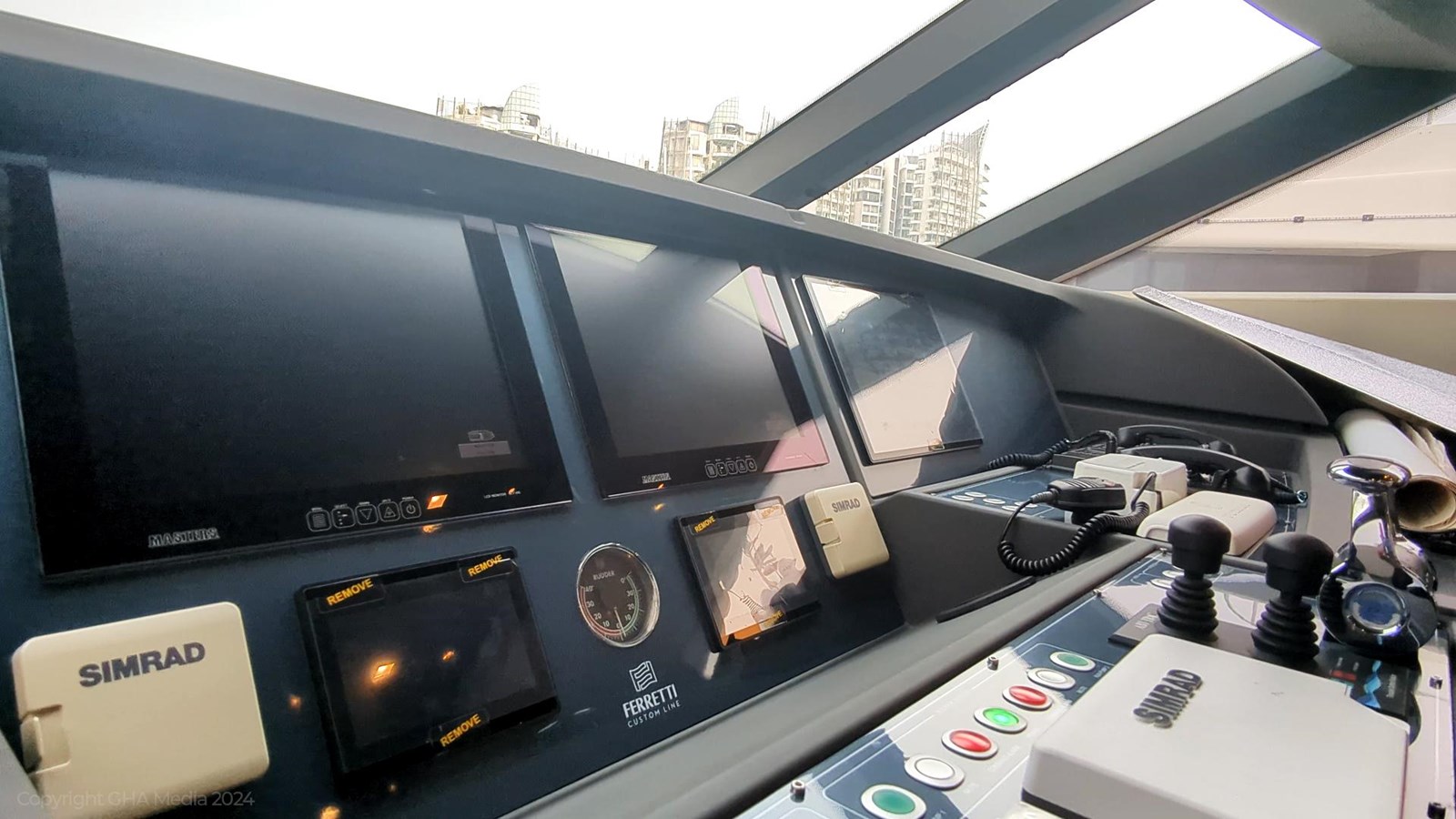 She features a 5-cabin layout including a full-beam master on the main deck, two VIPs, and two twin cabins below. The interior is bright, spacious, and finished in classic Ferretti styling. Outdoor areas are well laid out, with a large f lybridge, forward sunbathing area, and a comfortable cockpit for alfresco dining.