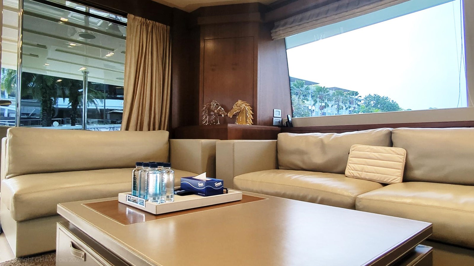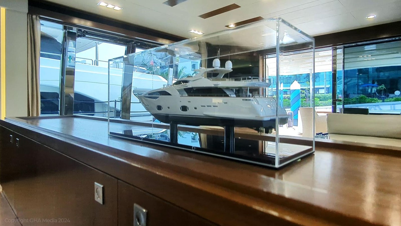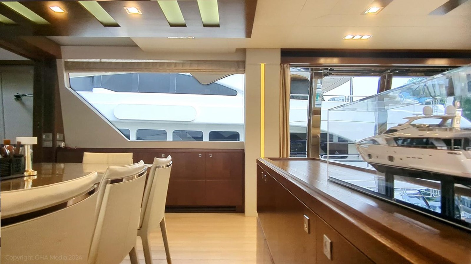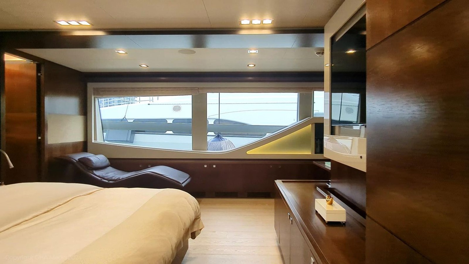 She features a 5-cabin layout including a full-beam master on the main deck, two VIPs, and two twin cabins below. The interior is bright, spacious, and finished in classic Ferretti styling. Outdoor areas are well laid out, with a large f lybridge, forward sunbathing area, and a comfortable cockpit for alfresco dining.