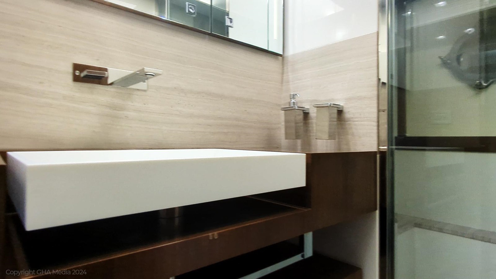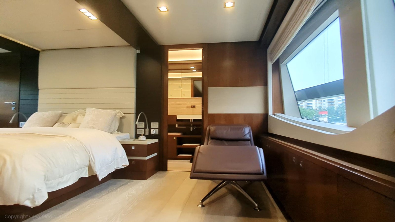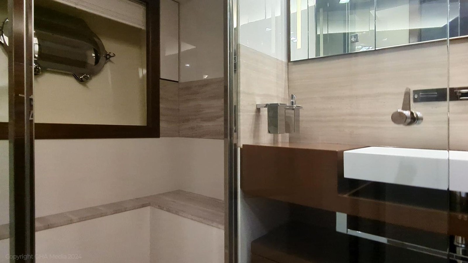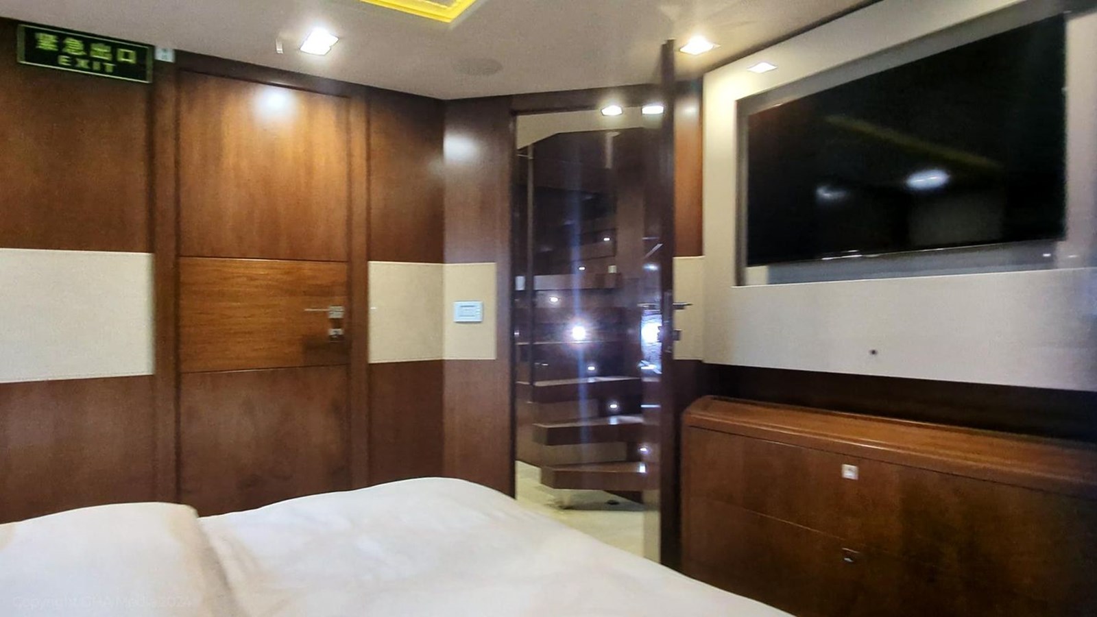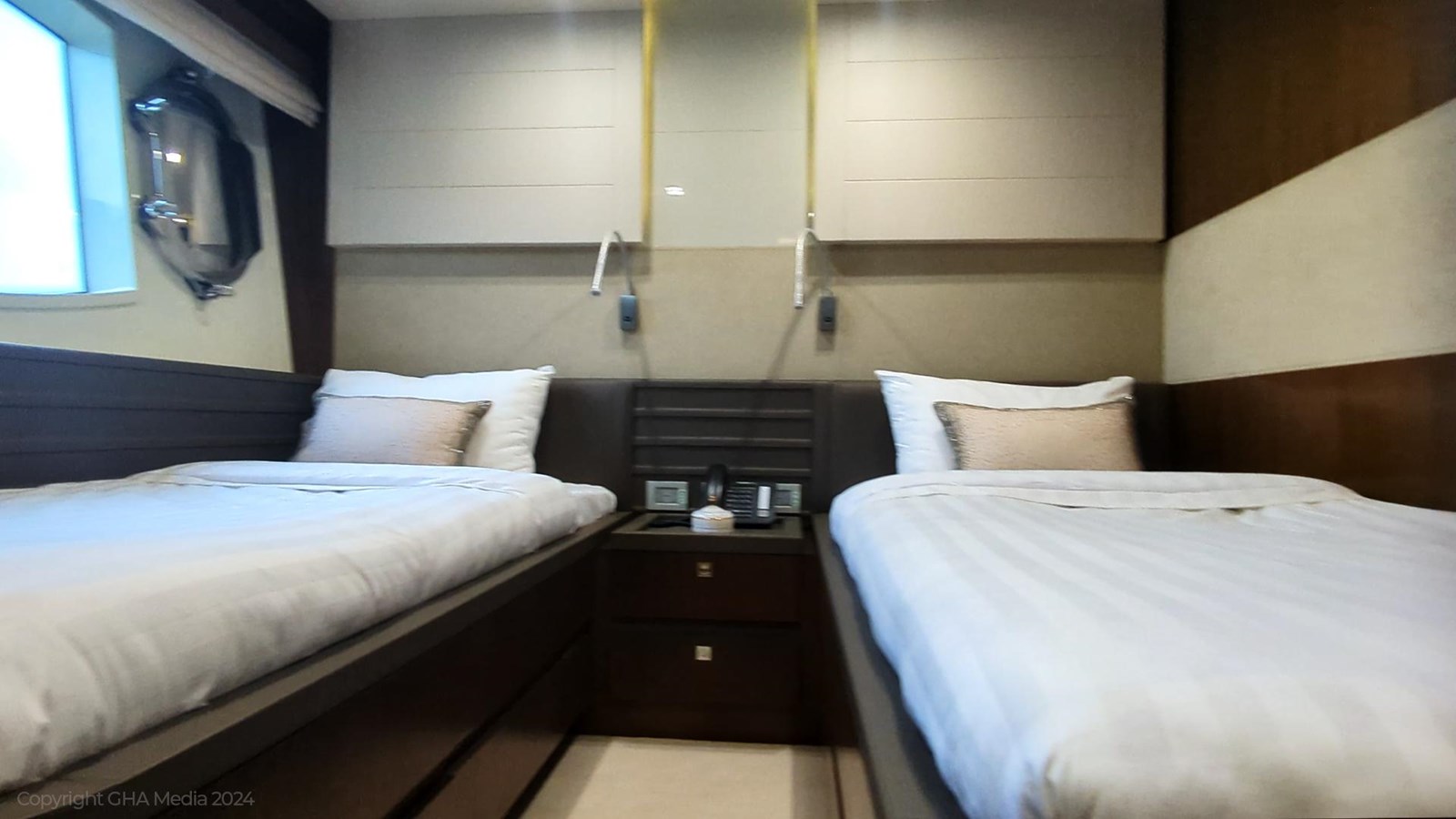 • 2 VIP cabins aft with en-suites, wardrobes, and upgraded AV