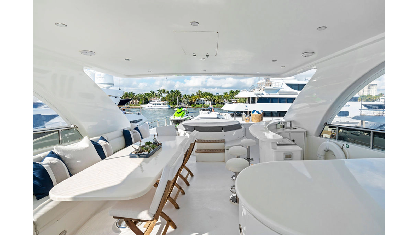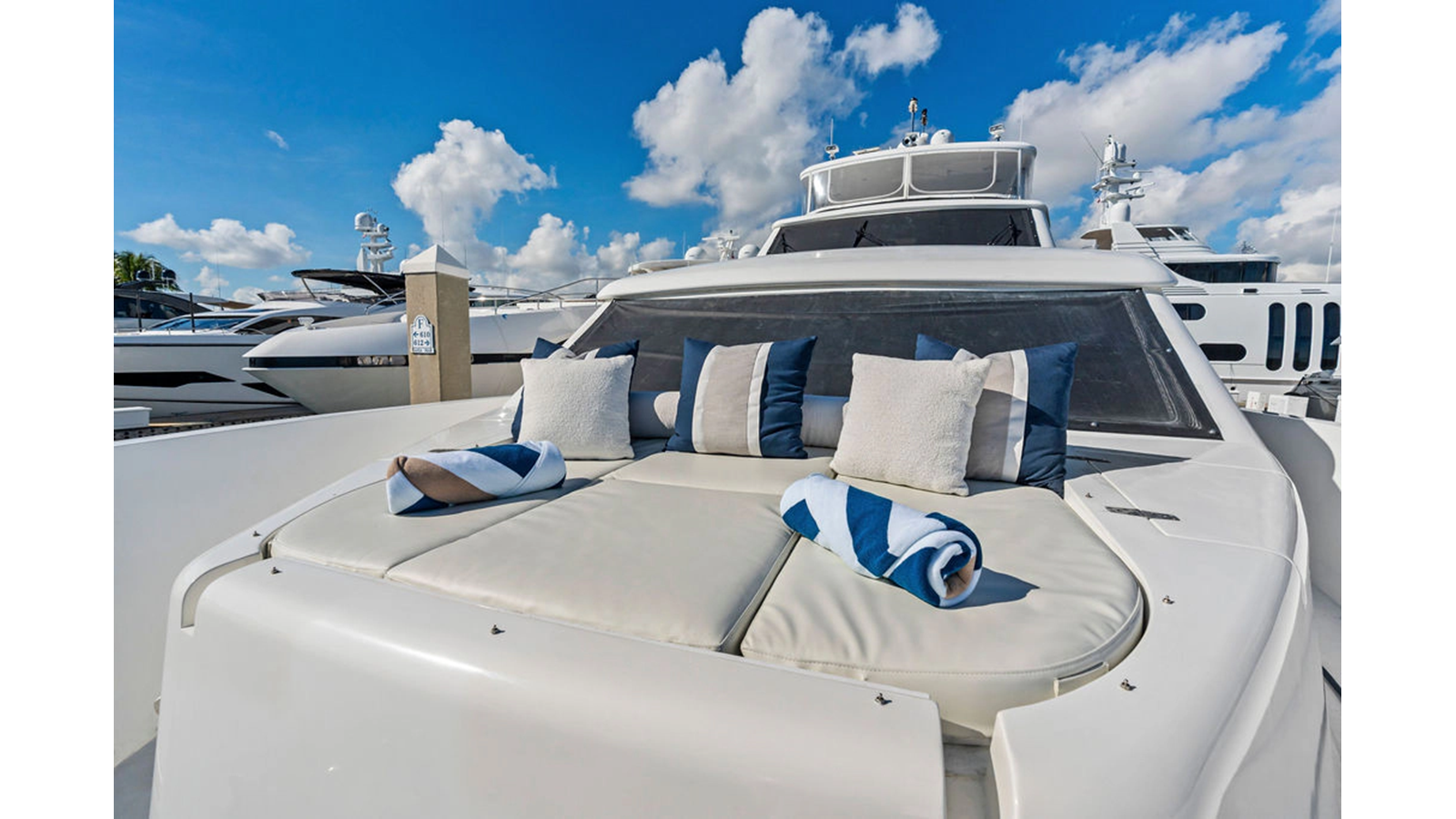 The flybridge serves as the main outdoor space, protected by a fixed hardtop while still open to the breeze. The area also features a Jacuzzi, BBQ grill, and ample seating. Forward, the bow offers a large sunpad for relaxing or enjoying a quiet retreat.