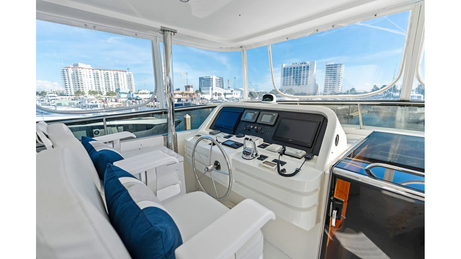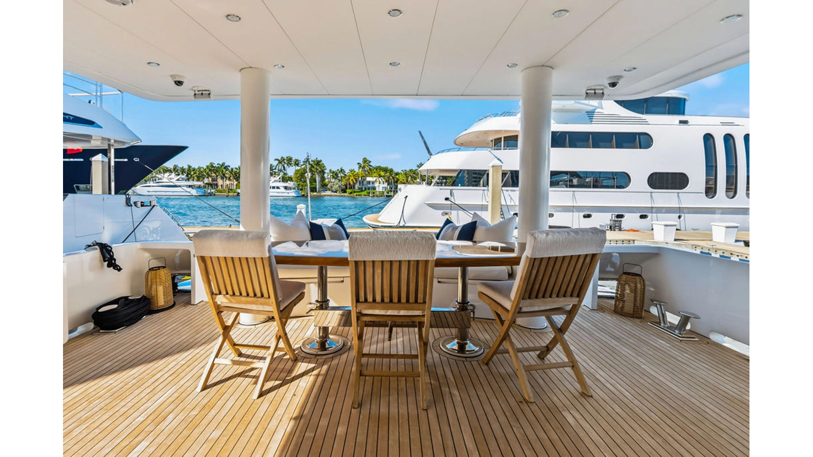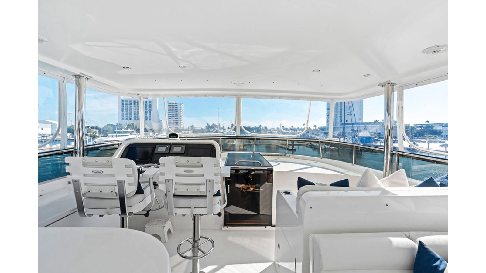 On PERFECT HARMONY, the flybridge exemplifies Hargrave’s reputation for creating guest spaces that feel remarkably larger than other 100’ yachts. The flybridge boasts an inflatable tender and Jetski, easily launched using the quick lift davit. A jacuzzi, whose cover doubles as a spacious sun pad, offers the perfect spot to relax, while a nearby propane grill on the port side makes outdoor dining a delight. A massive hardtop provides shaded comfort over the large dinette and the adjacent well-equipped bar that is perfect for effortless entertaining, offering plenty of prep space, storage, and a sink. Forward, the helm station includes additional seating, with direct access to the wheelhouse.