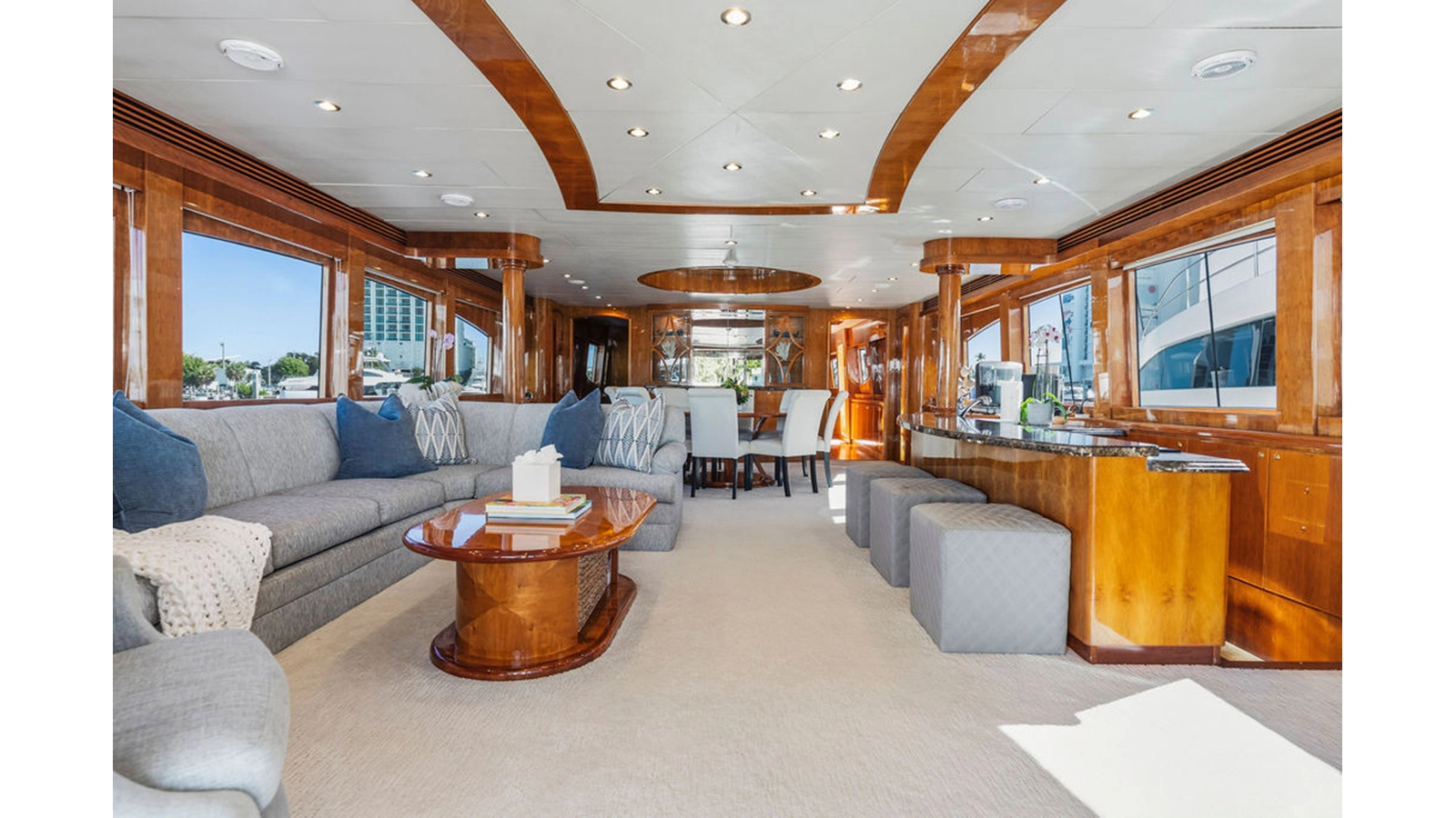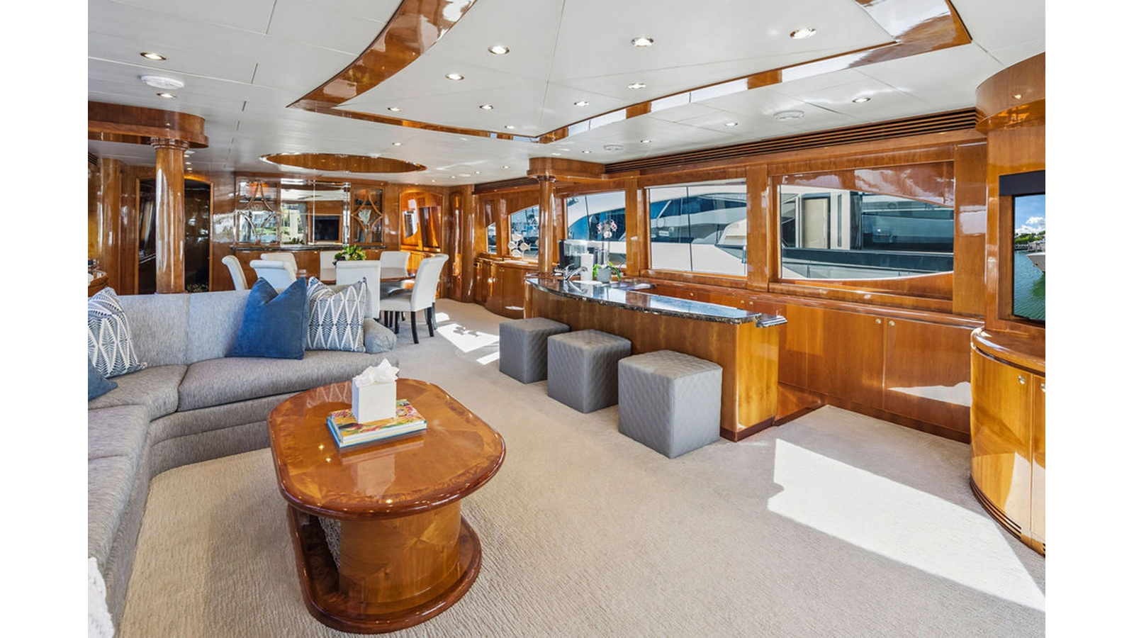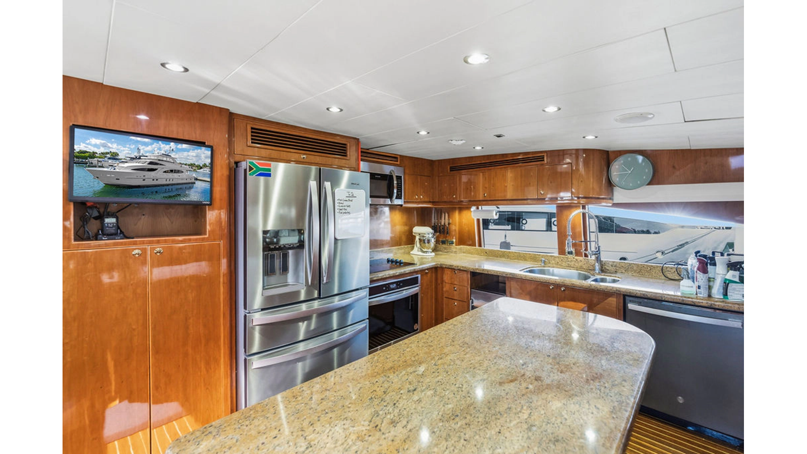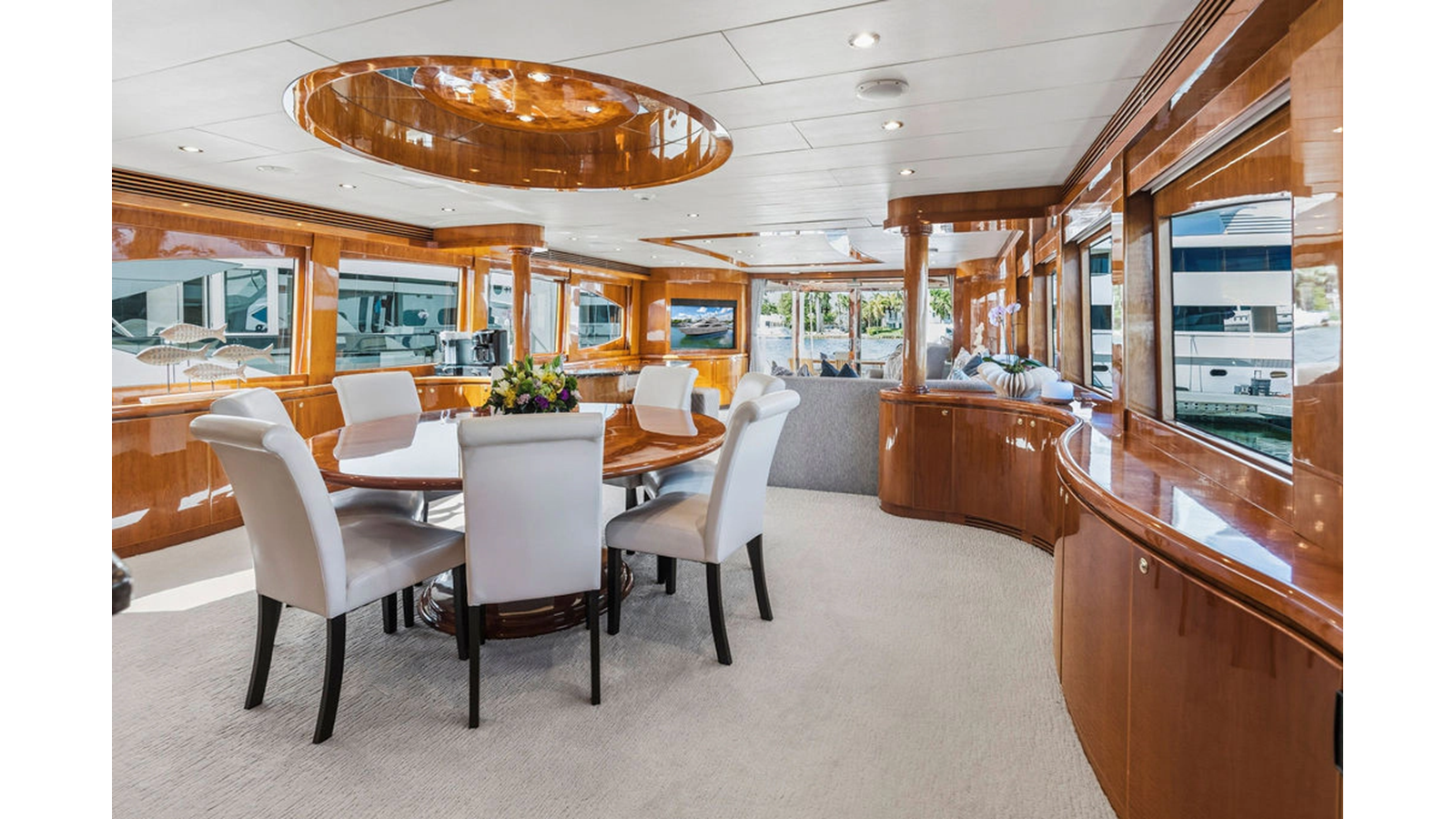 The main salon offers ample space for a walk-up bar and a full dining table. The separate country galley provides plenty of room for the chef to prepare meals efficiently.