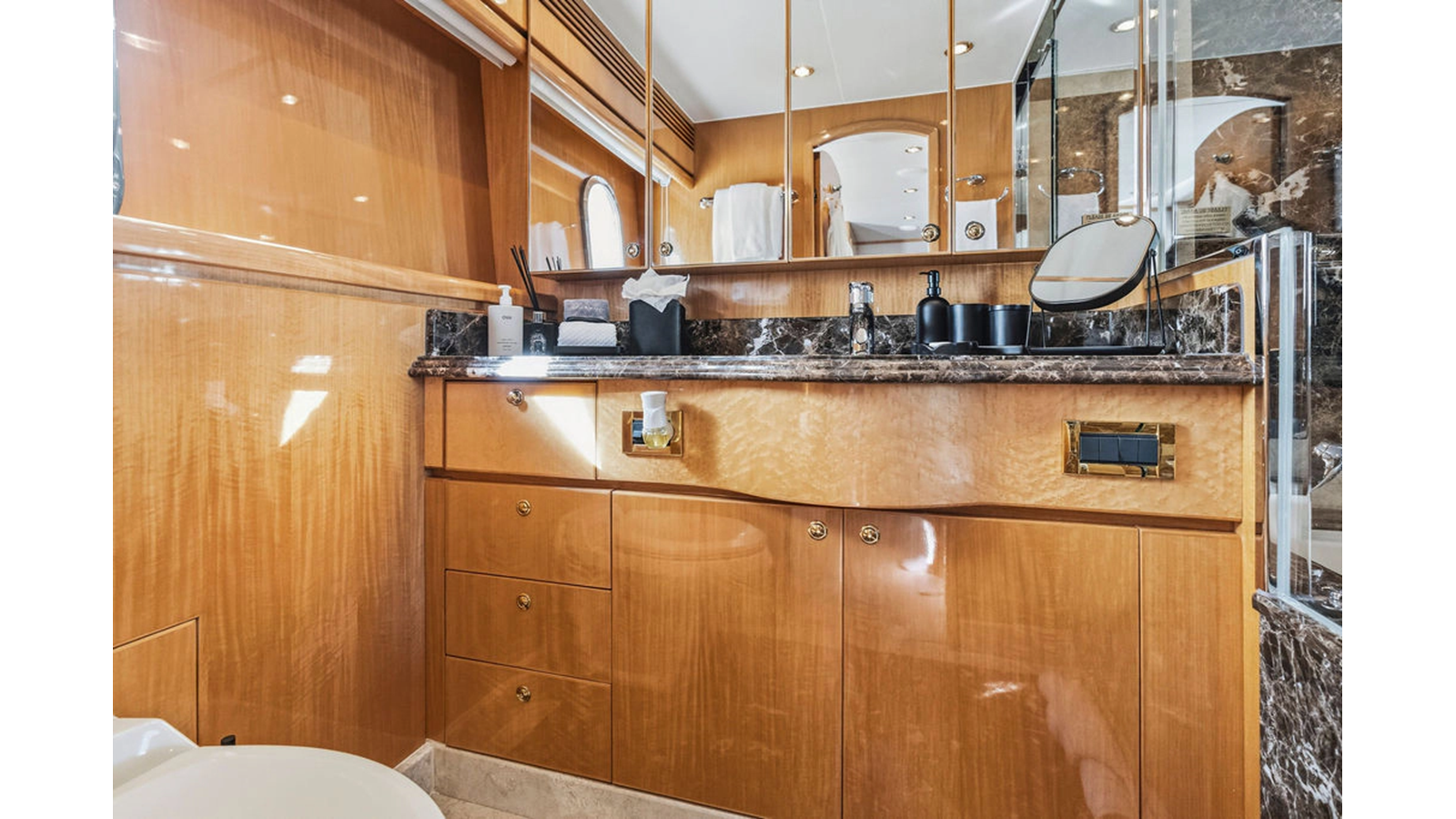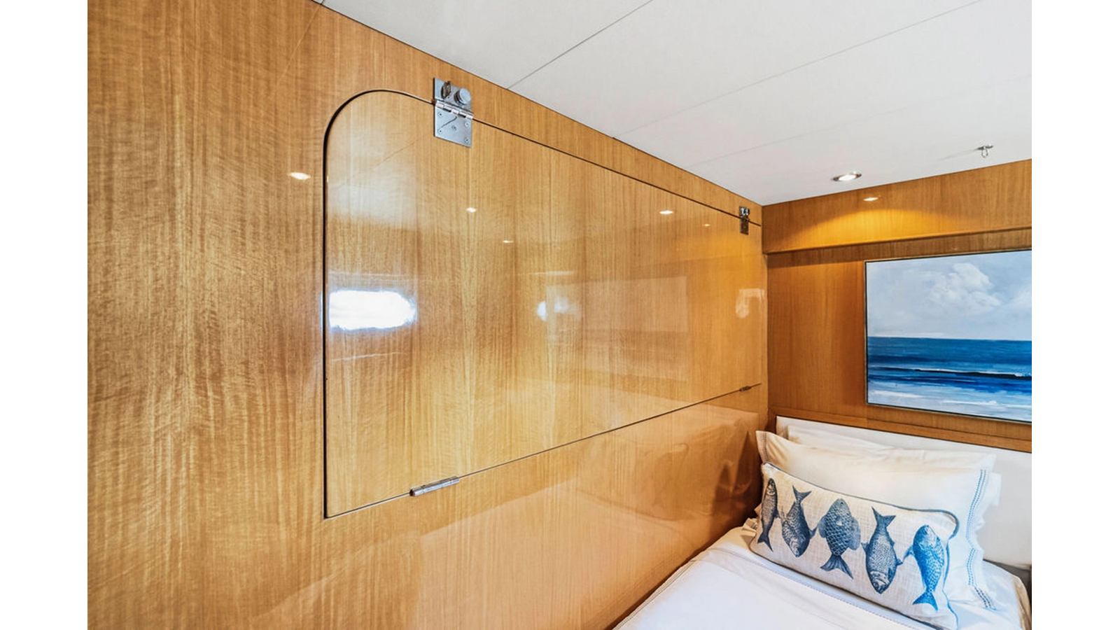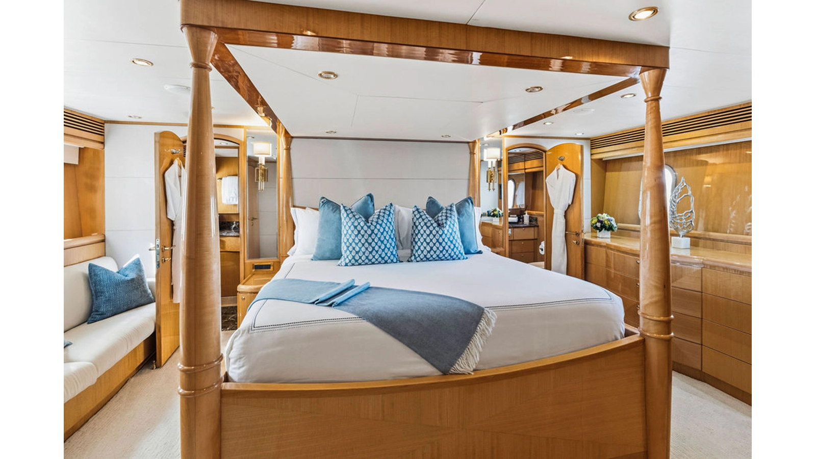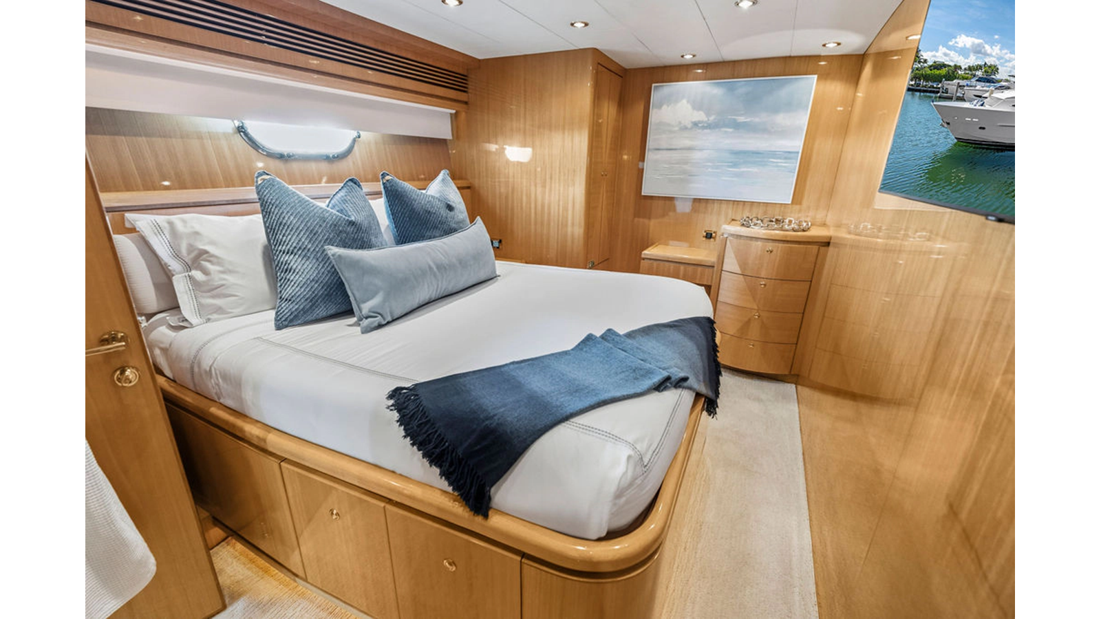 PERFECT HARMONY features four staterooms accommodating up to nine guests. The full-beam master includes a king-size bed, his-and-her cedar closets, and his-and-her heads with a soaking tub and separate shower, along with a settee and TV. The port stateroom has a queen berth, and the starboard stateroom includes two twins plus a Pullman; both are ensuite. The VIP is located forward with a queen berth and private head.