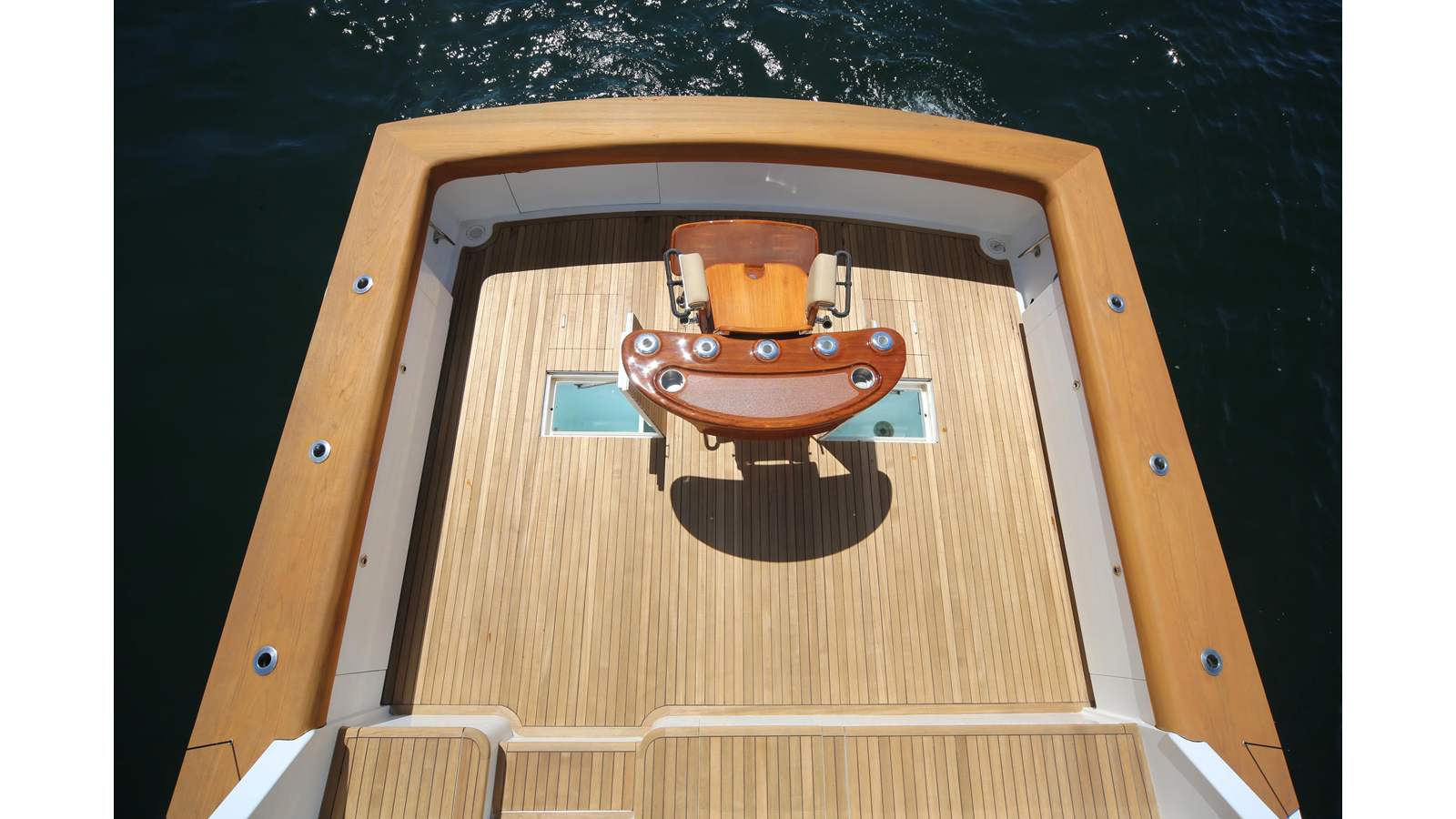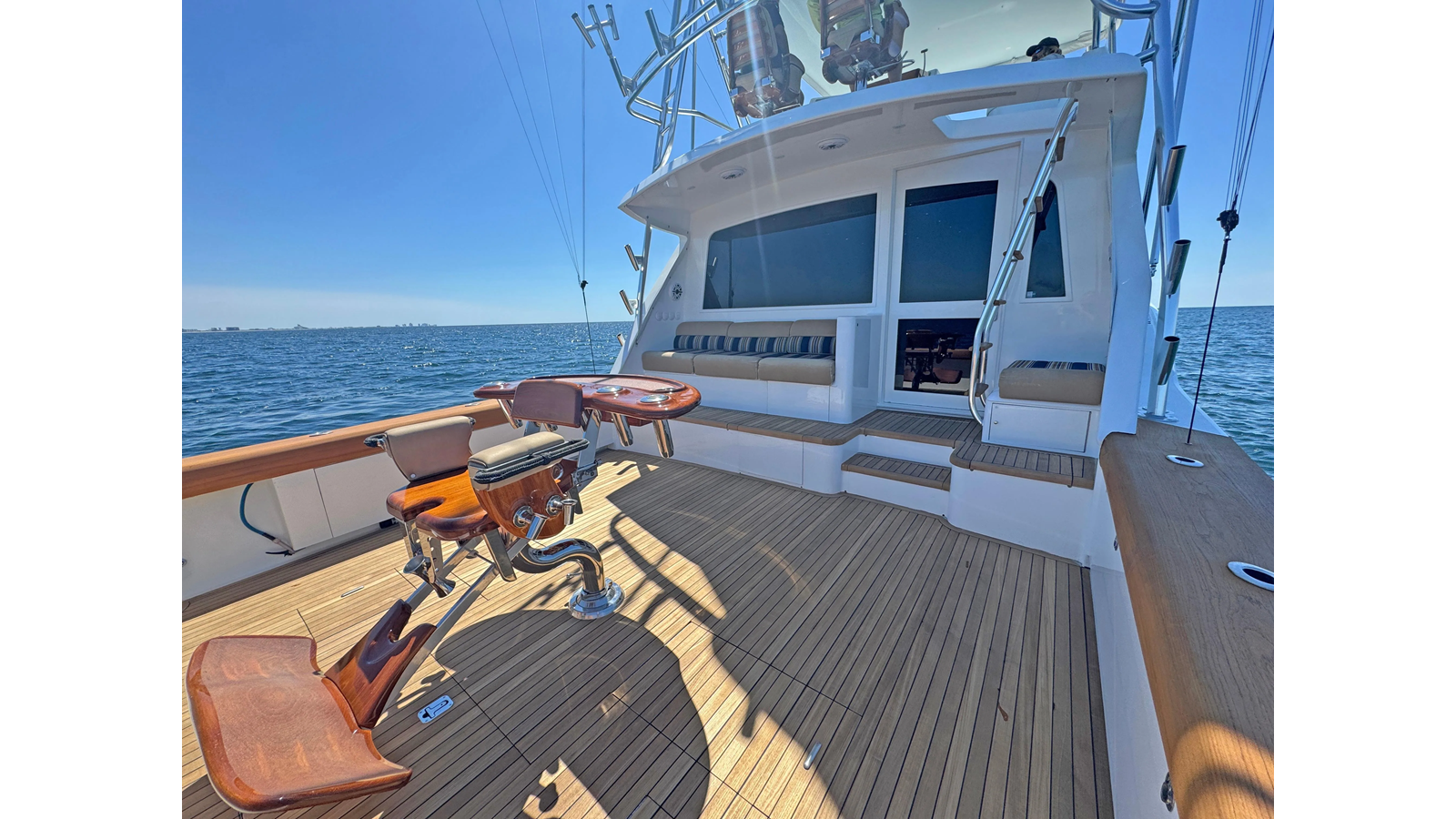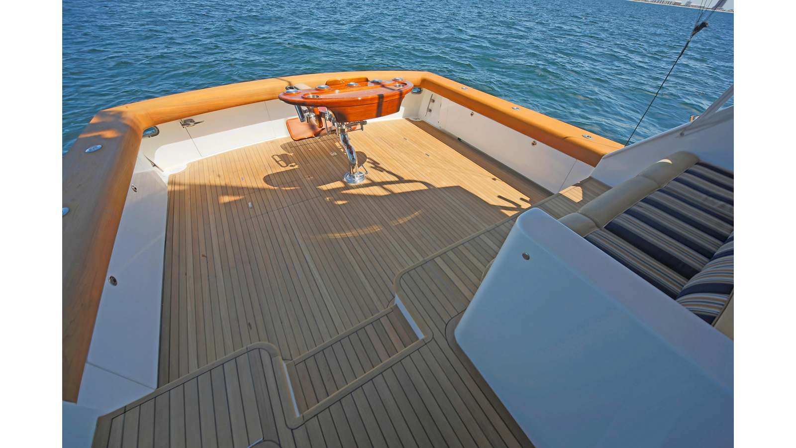 - Wood Cored Fiberglass With Non-Skid & Laid Teak Planks Aft