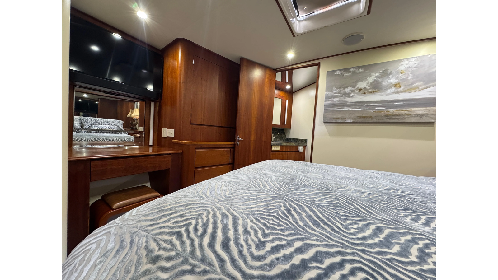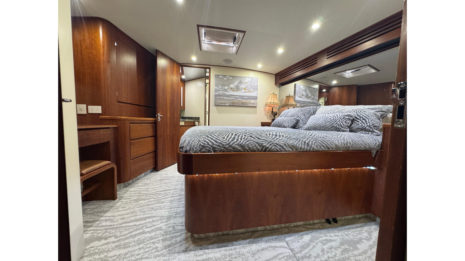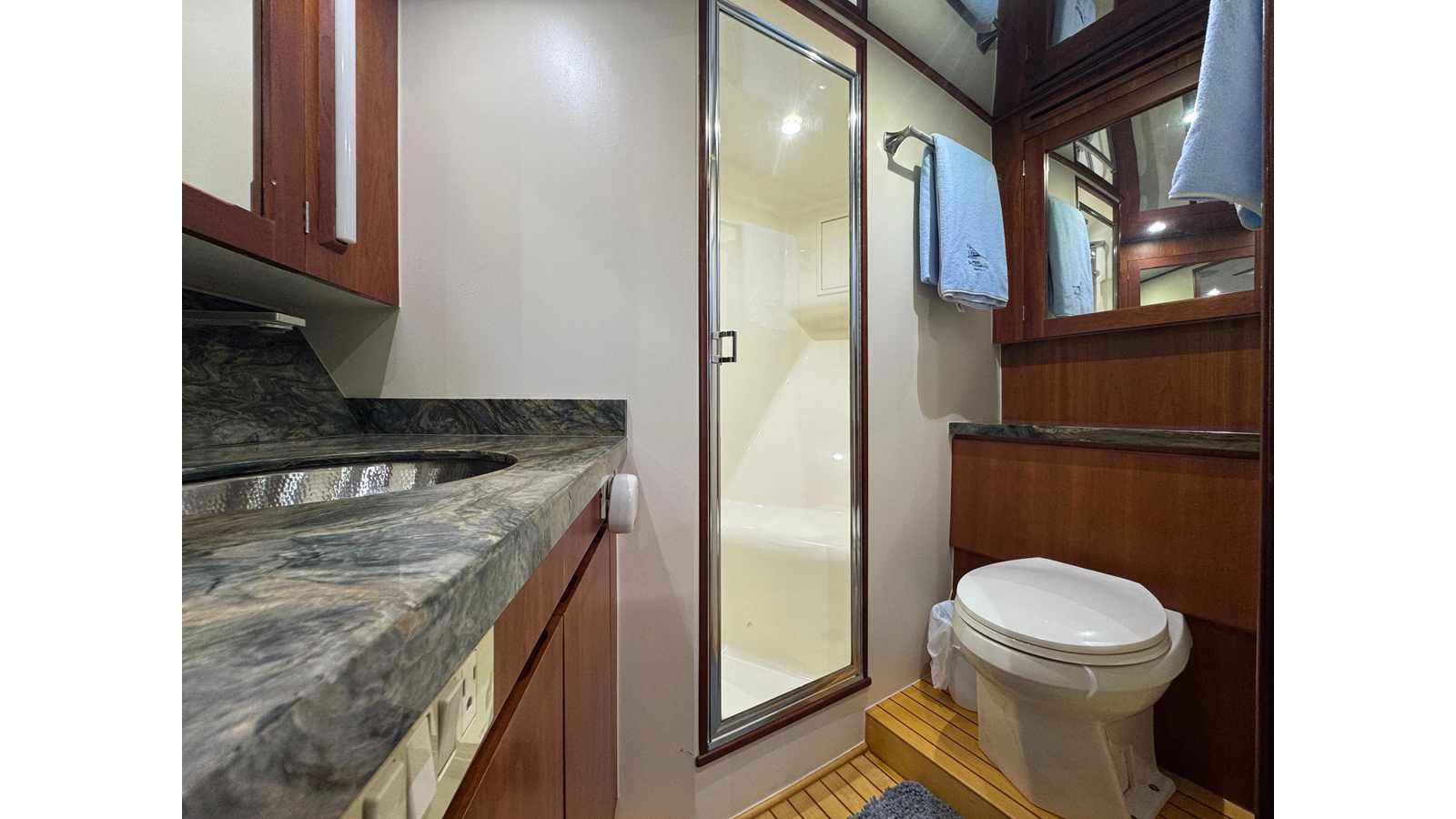 The master stateroom is accessed all the way forward in the companionway and comes with a double berth to starboard, carpeted floors, good storage in lockers and drawers, and the head and separate stall shower forward.