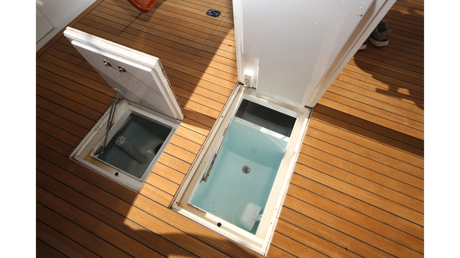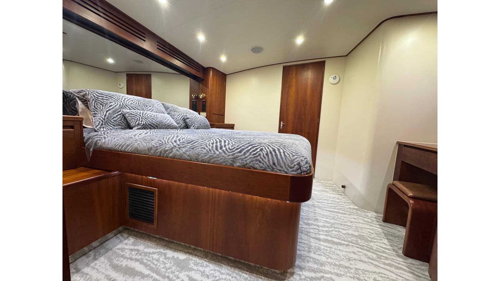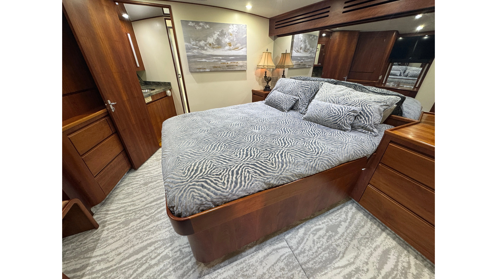The master stateroom is accessed all the way forward in the companionway and comes with a double berth to starboard, carpeted floors, good storage in lockers and drawers, and the head and separate stall shower forward.