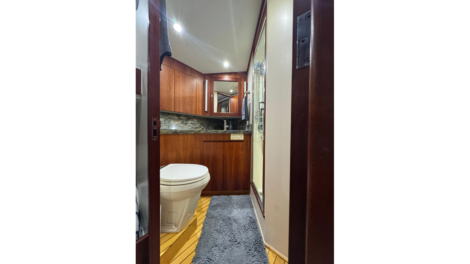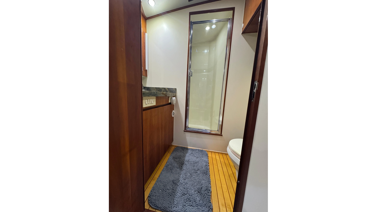 The starboard cabin is accessed from the guest companionway and comes with upper & lower single bunks, carpeted floors, good storage in built-in lockers, and the head and stall shower is accessed aft. This head can also be accessed from the companionway.