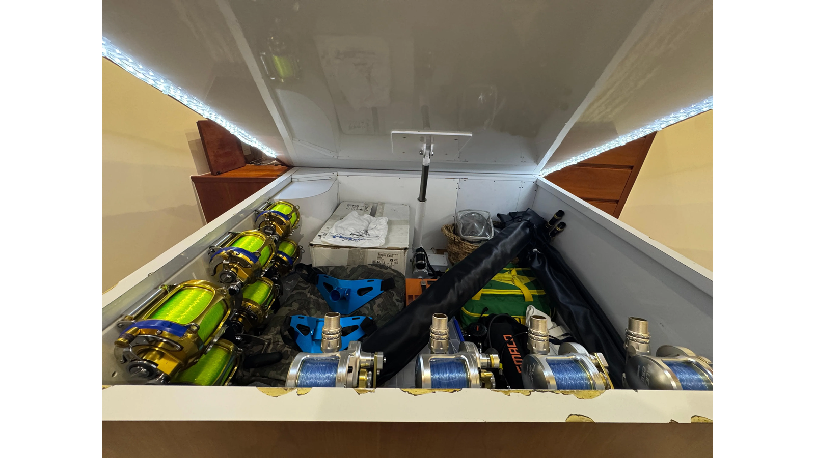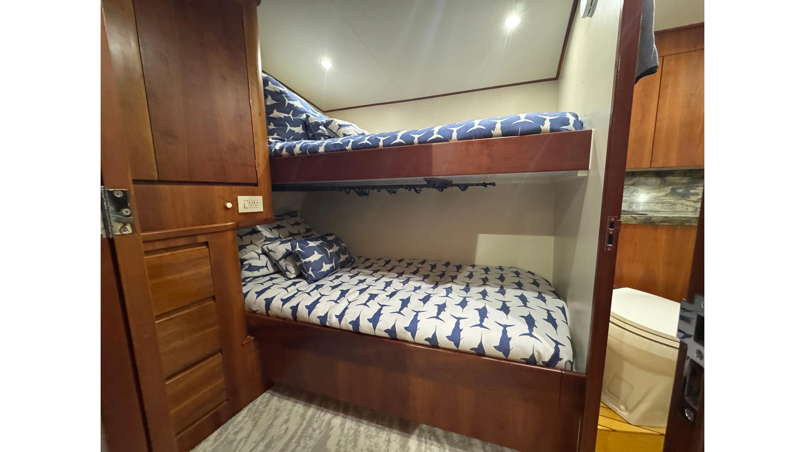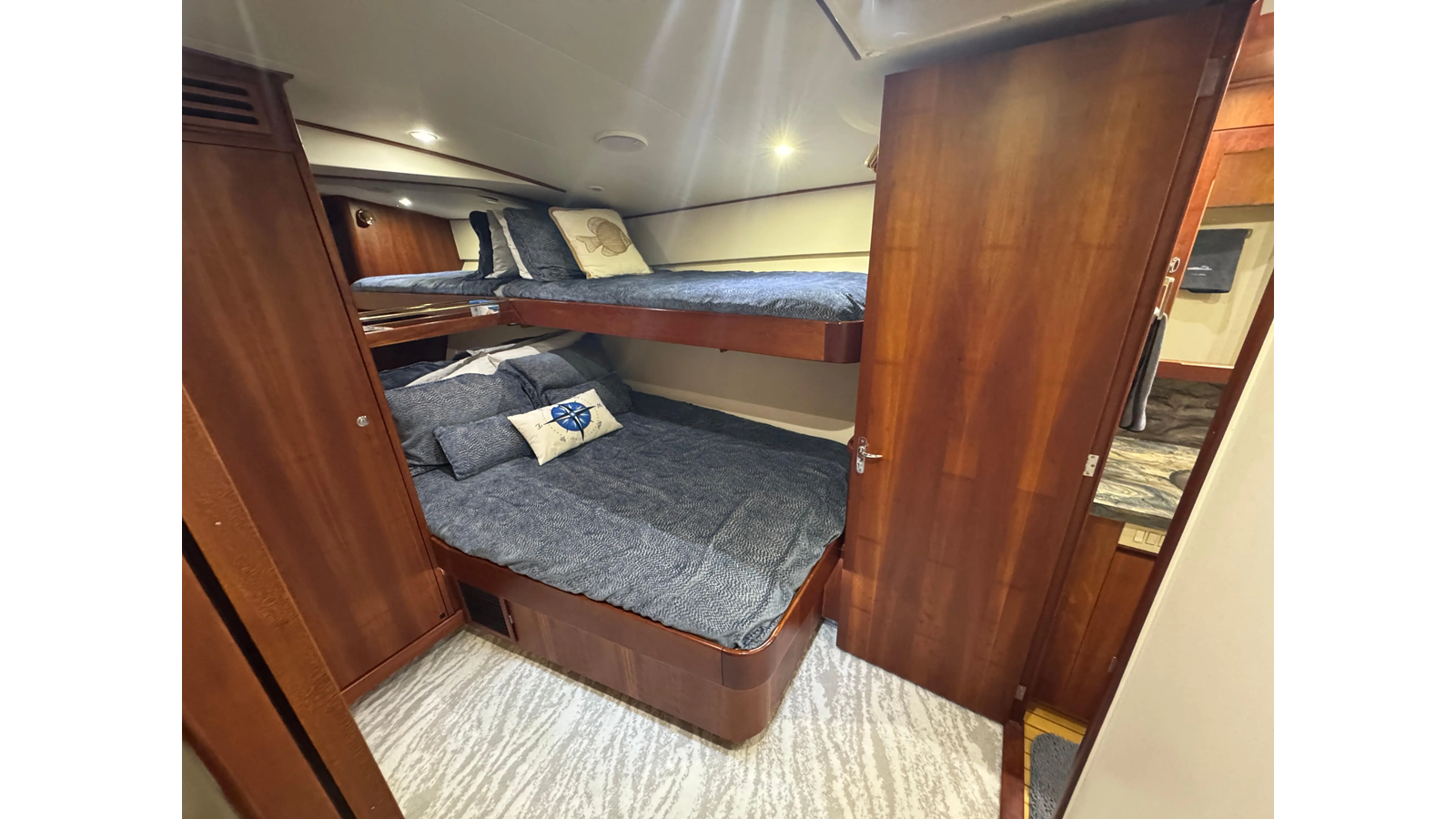 The Port stateroom is accessed from the guest companionway and features a lower double berth and an upper single bunk outboard, carpeted floors, ample storage in built-in lockers, and the head and stall shower is located forward.