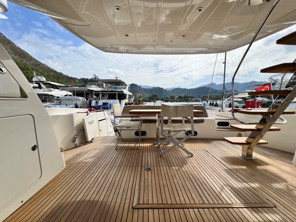 Her light-filled interior offers three spacious cabins, a fully equipped galley, and a panoramic salon with floor-to-ceiling windows. The flybridge and aft cockpit provide generous spaces for entertaining or relaxing at anchor.