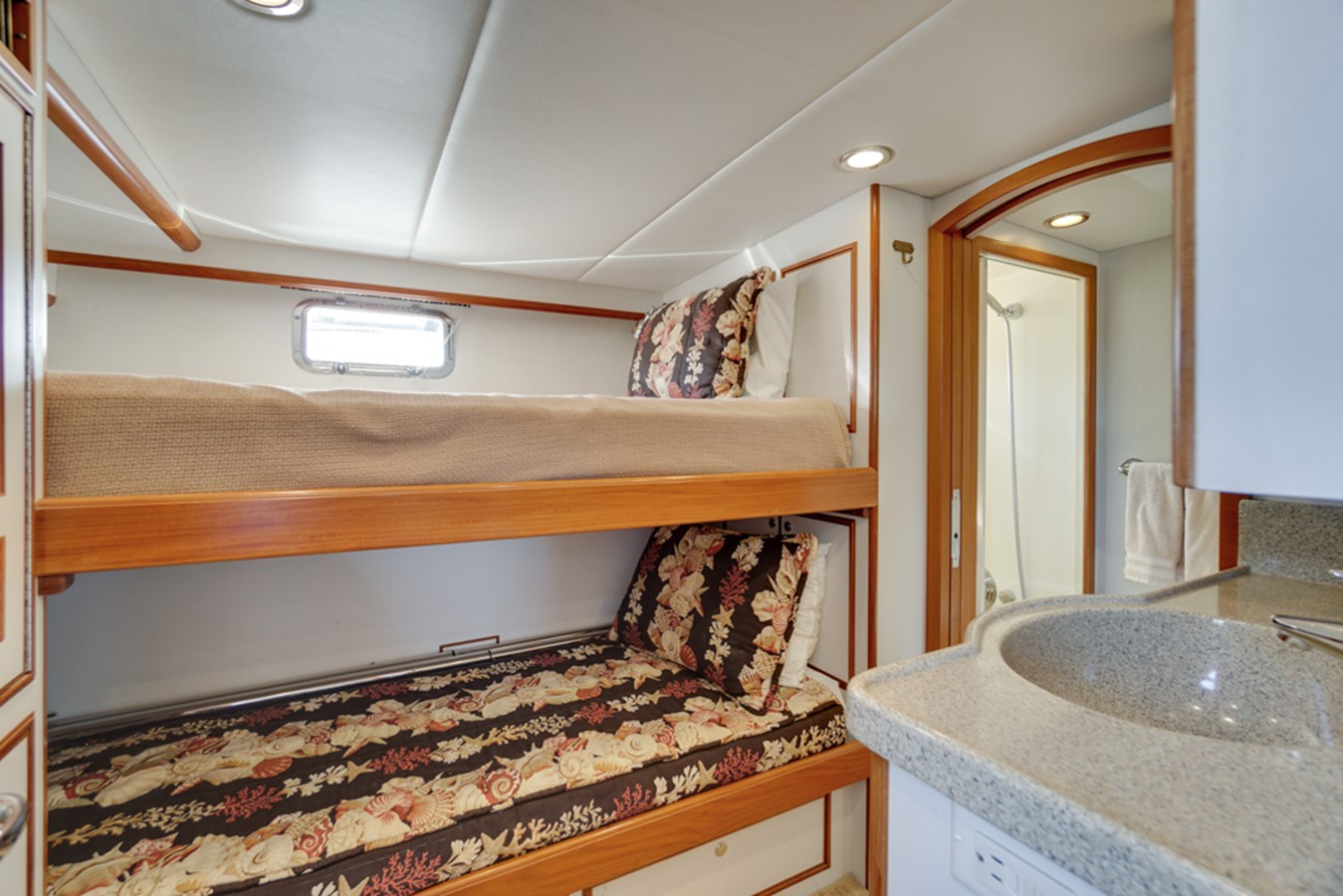 - Two ventilation overhead hatches with “Ocean Air” sliding screens/shades