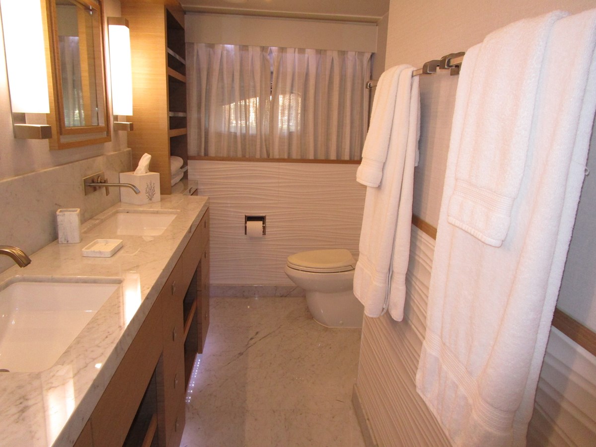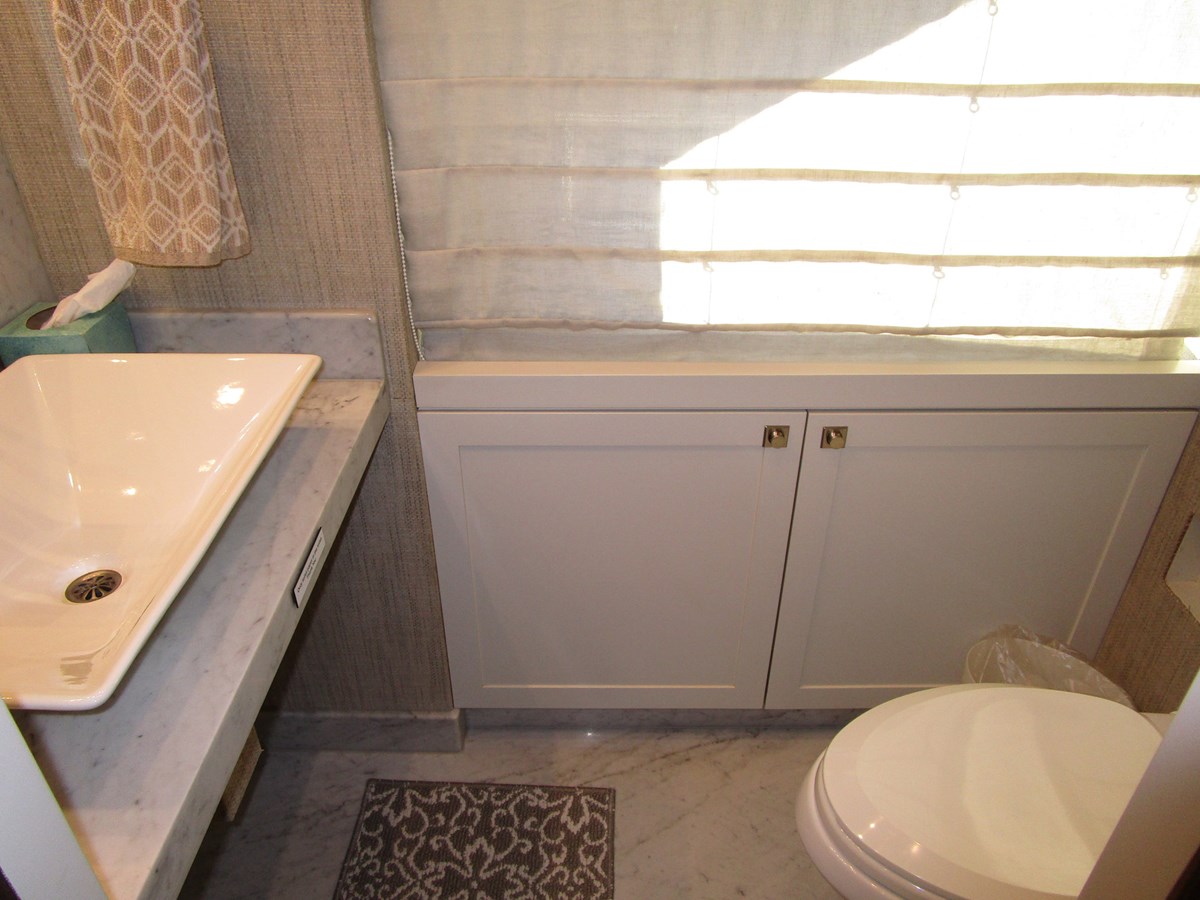 To starboard the day head has a full-size Headhunter toilet, a house side window with Roman shades and a Carrera countertop with a Kohler above counter vessel type sink with bulkhead faucet fixtures.