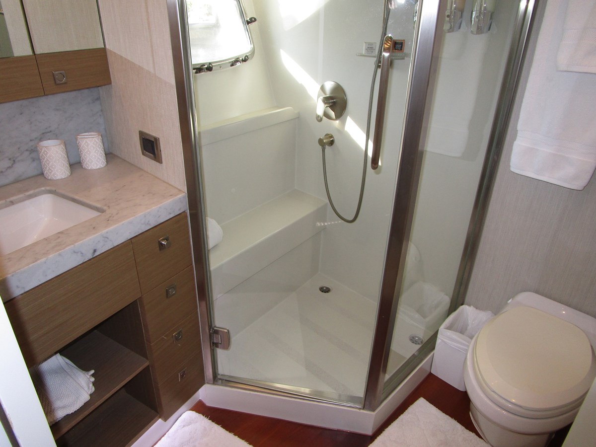 A great feature of this yacht is the private Master cabin entrance from the starboard side of the salon. A king size berth is off the aft bulkhead in the master with ample storage, large hull side portlights and a double vanity head with a huge shower.