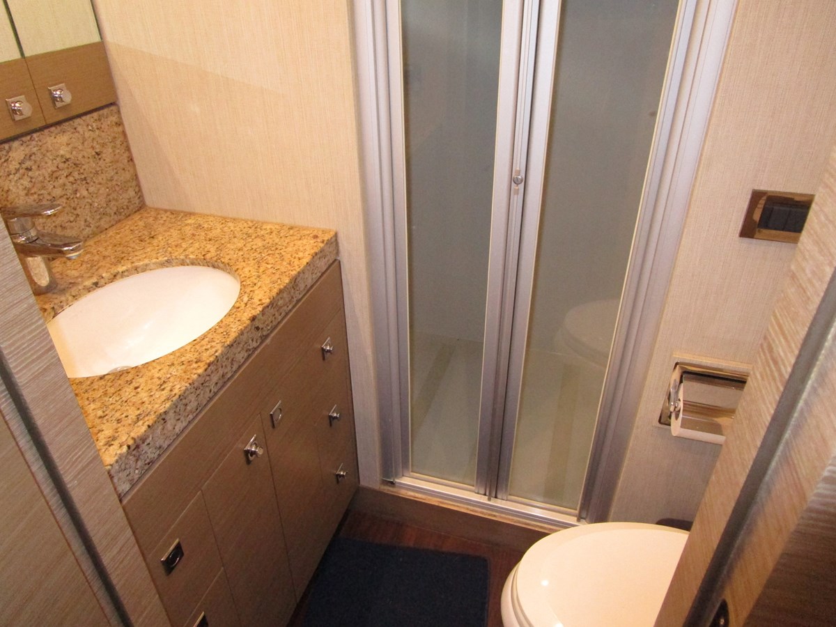 To starboard are enclosed steps to the flybridge aft and steps to the guest accommodations forward. The queen size VIP is forward with a private head and shower.
