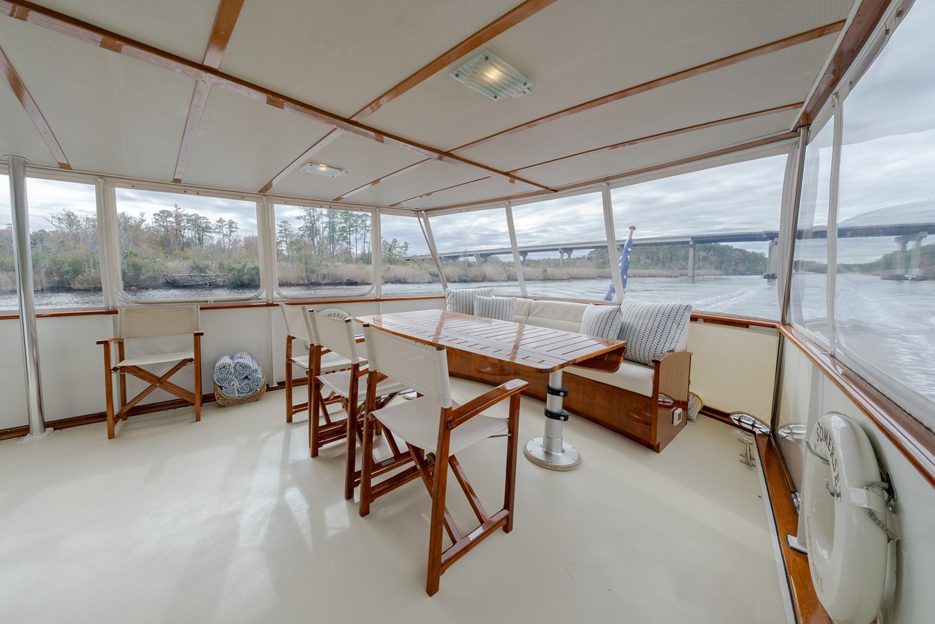 SOMERSET features the typical Trumpy Flush Deck layout with crew accommodations forward, followed by a galley to port and dinette to starboard. Her saloon is next aft, finished in beautifully warm and well-patinated butternut with a sofa to starboard, a centerline love seat, and an easy chair to port, providing comfortable seating for six. Twin companionways aft provide access, both down to the two guest cabins and up to the wheelhouse, as well as to the expansive 120-square-foot enclosed aft deck. SOMERSET will comfortably accommodate 4 in the owner’s party and 2 in crew.